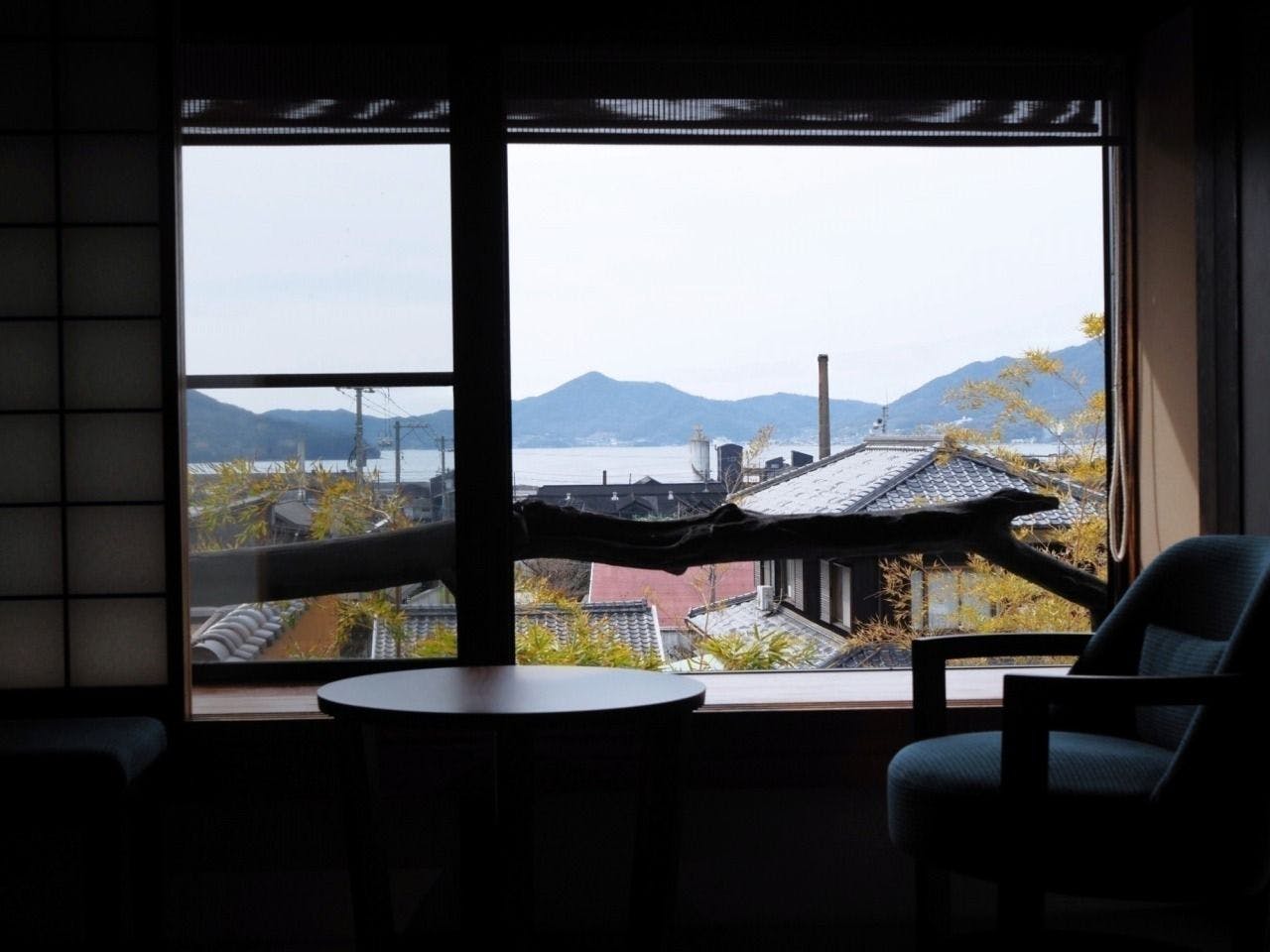 自家温泉の内風呂は、内海湾と寒霞渓を遠くに望みながらどうぞ。