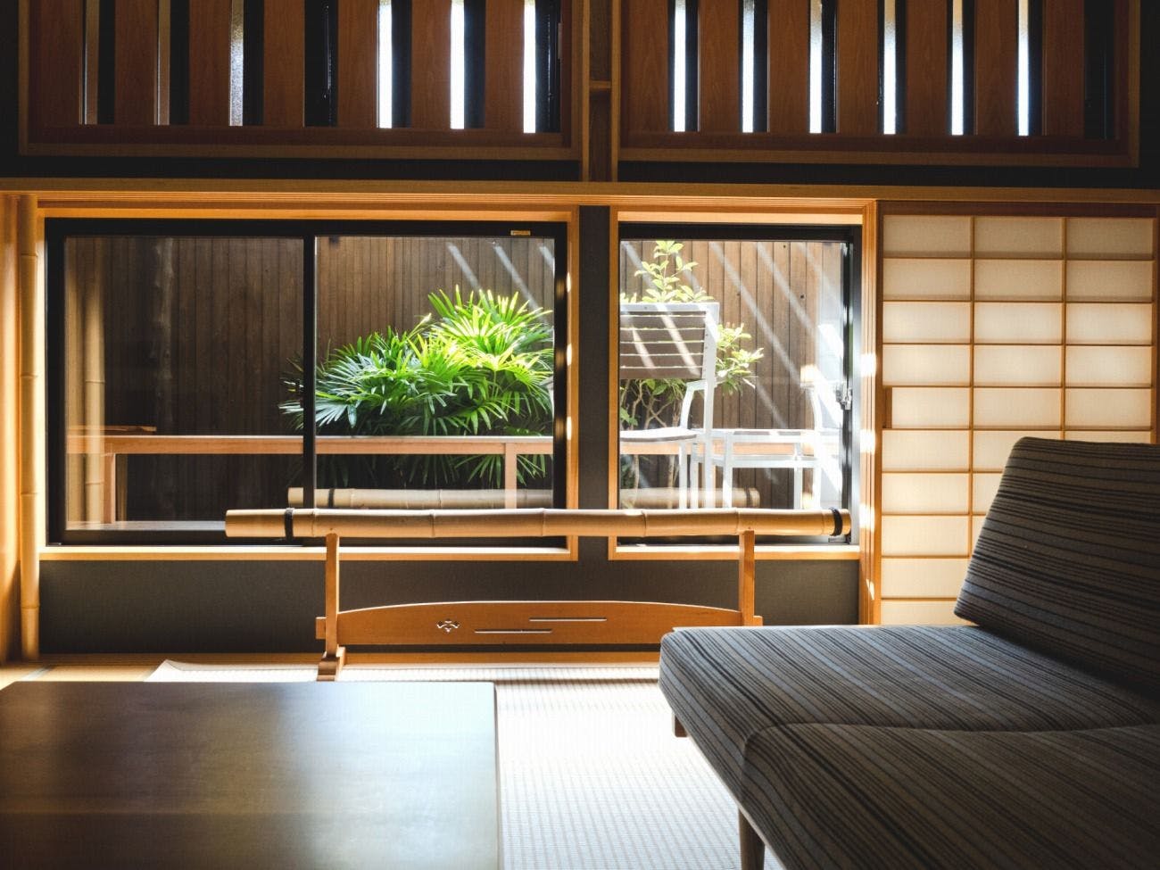 中庭に面した大きな窓が開放的な、一階の二間続きのつくりです。