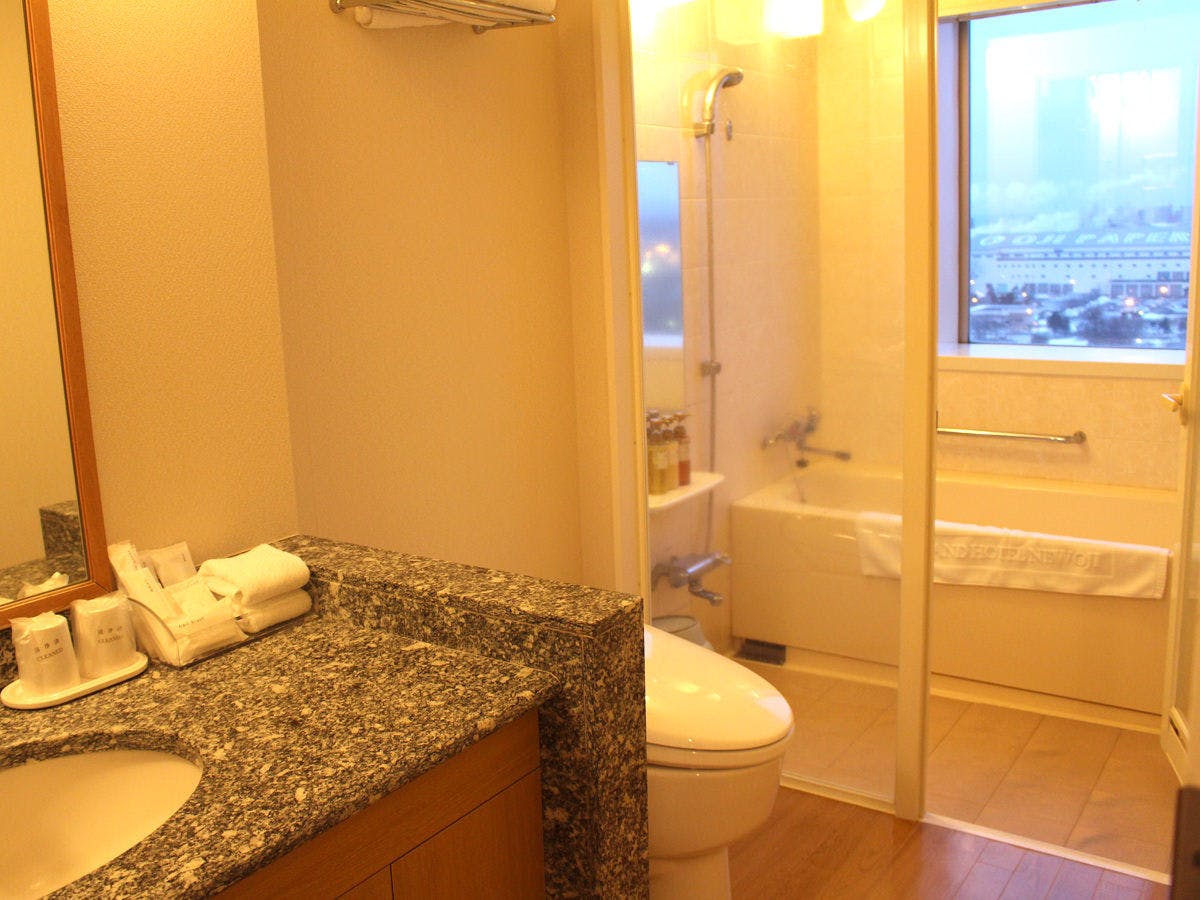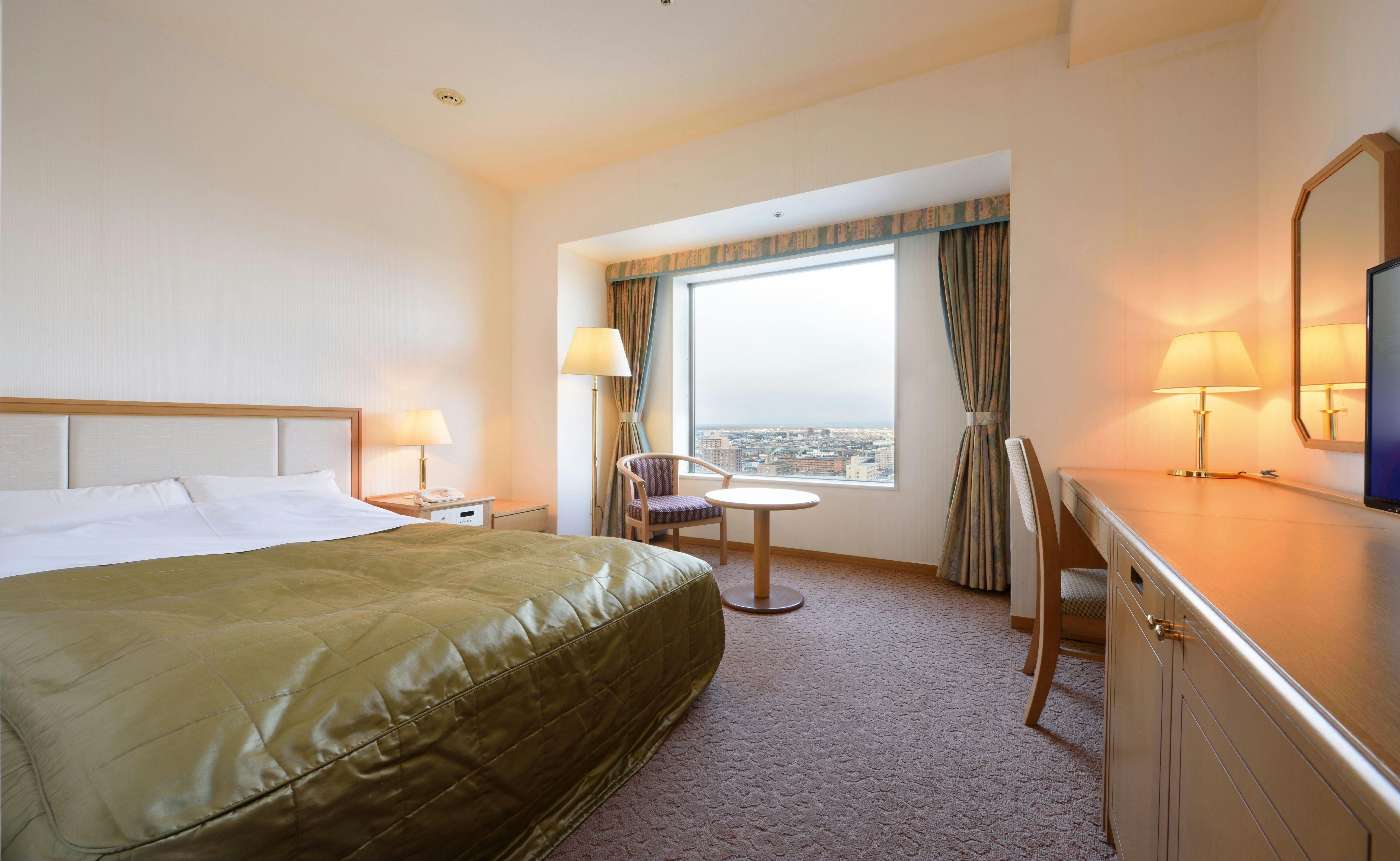眺望よい上層階にあり、大型の窓とダブルベッドを備えたお部屋。●インターネット関連全室対応 接続方法:無線LAN、有線LANインターネット接続:無料 ※ロビー及び客室内Wi-Fi無料接続可能●部屋設備:加湿機能付き空気清浄機●貸出:ズボンプレッサー・電気スタンド・アイロン