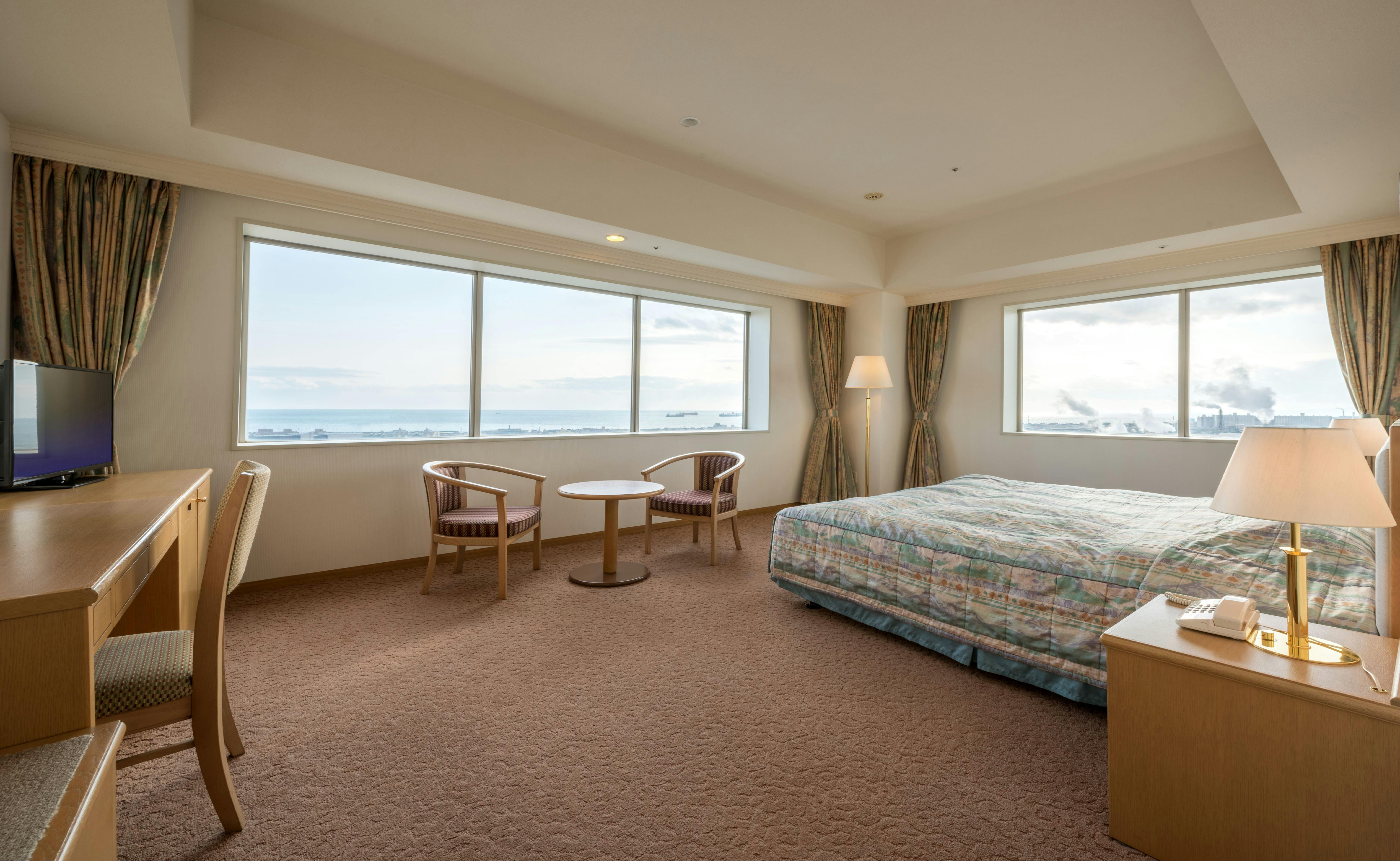 眺望よい上層階にあり、大型の窓とダブルベッドを備えたお部屋。●インターネット関連全室対応 接続方法:無線LAN、有線LANインターネット接続:無料 ※ロビー及び客室内Wi-Fi無料接続可能●部屋設備:加湿機能付き空気清浄機
