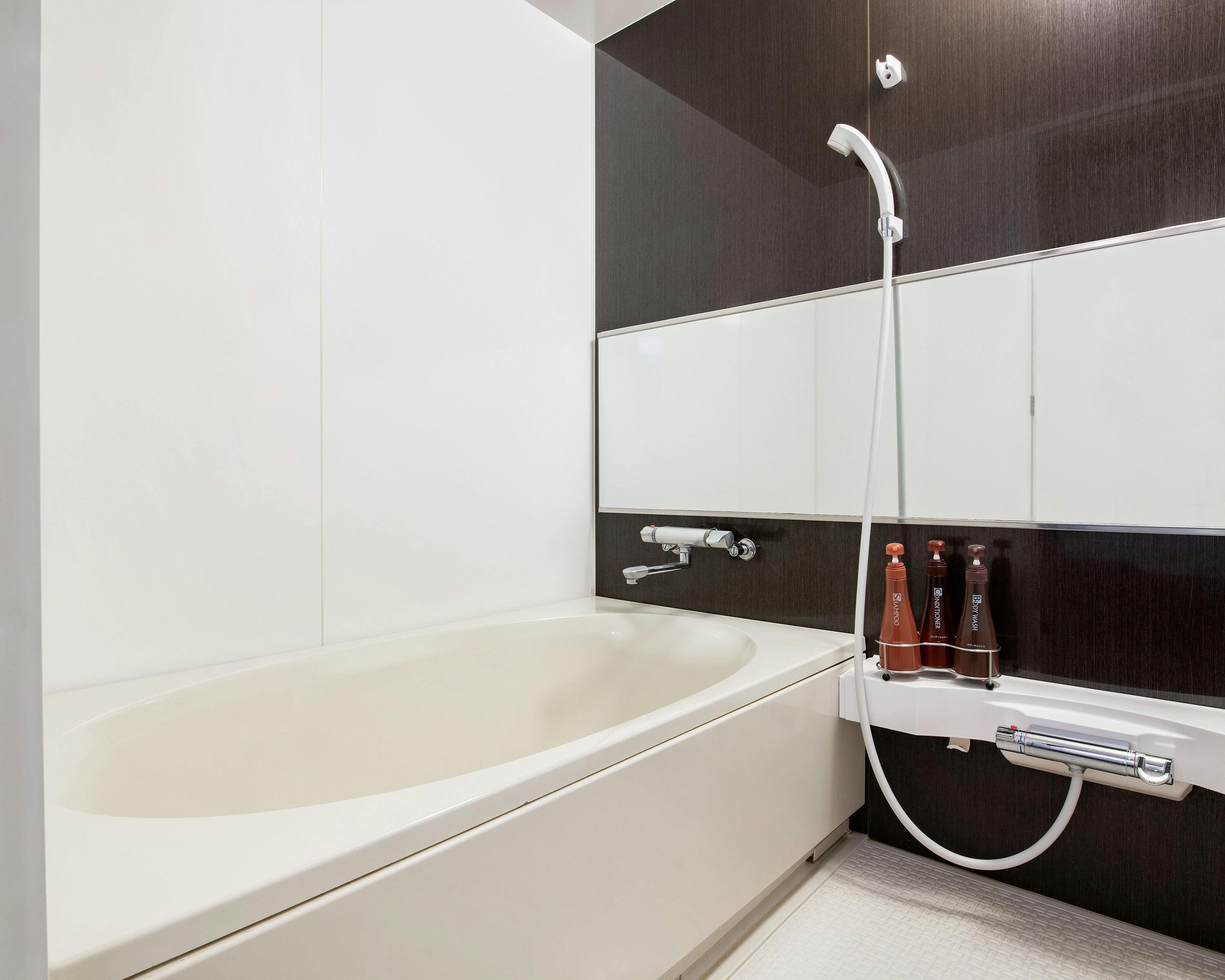 セパレートタイプのバス・トイレを備えたツインルーム<ベッドサイズ>113cm×195cm 2台Wi-Fi、高速LAN回線、空気清浄機完備※客室の画像および間取り図は一例です。部屋によっては、洗面台の位置等、実際と異なる場合がございます。