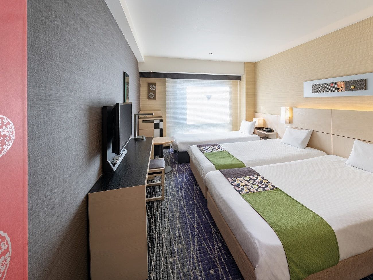 京都の伝統工芸をデザインに取り入れた和モダンなツインルームです。ソファベッドのご利用で3名様でもご宿泊可能です。【広さ】22.5平米【ベッドサイズ】幅113cm×長さ195cm 2台/幅98cm×長さ195cm 1台【バスタイプ】ユニットバス【客室設備】Wi-Fi/空気清浄機/VOD/シャツガウン/ミネラルウォーター