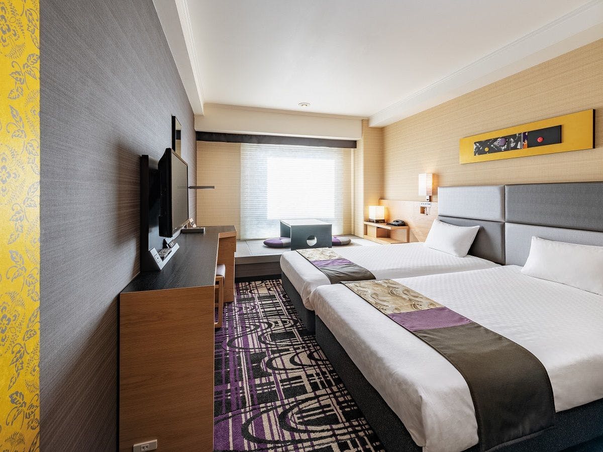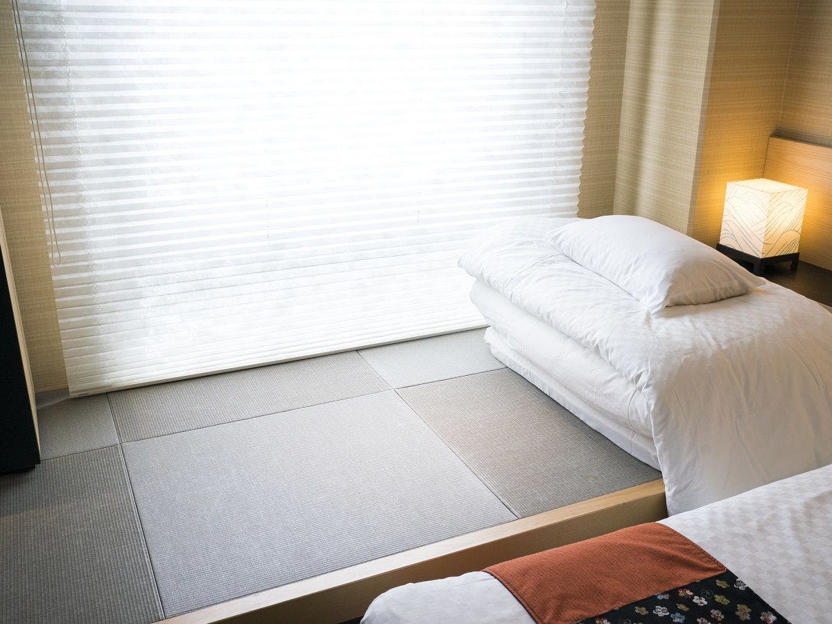 窓際に畳の小上がりを備えたツインルームです。【広さ】22.5平米【ベッドサイズ】幅113cm×長さ195cm 2台【バスタイプ】ユニットバス【客室設備】Wi-Fi/空気清浄機/VOD/シャツガウン/ミネラルウォーター