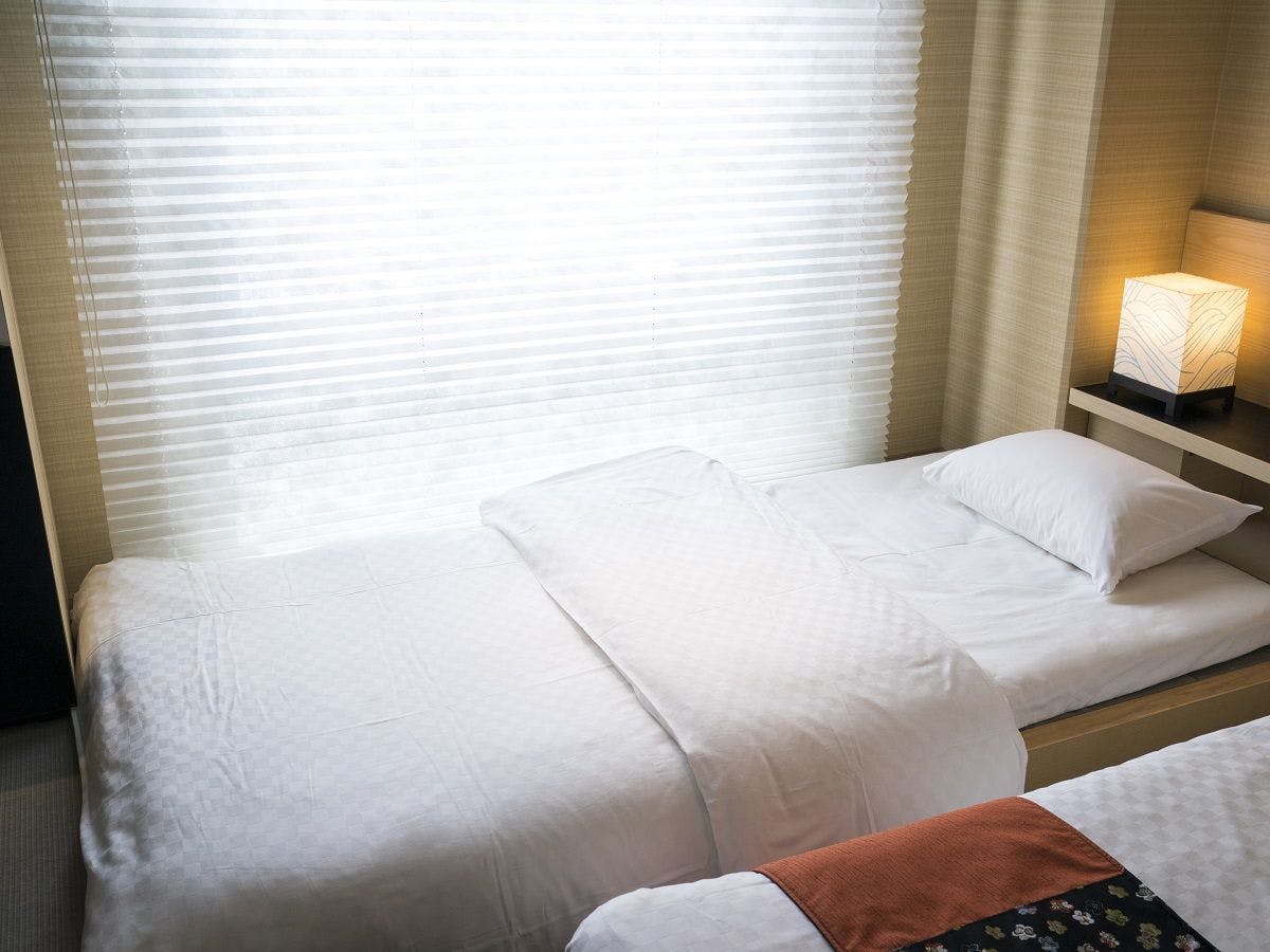 ジャパネスクツイン(22.5平米)2室が部屋内の扉でつながっているタイプの客室<ベッドサイズ>113cm×195cm 4台 布団1枚(5名様利用時)Wi-Fi、高速LAN回線、空気清浄機完備ユニットバス