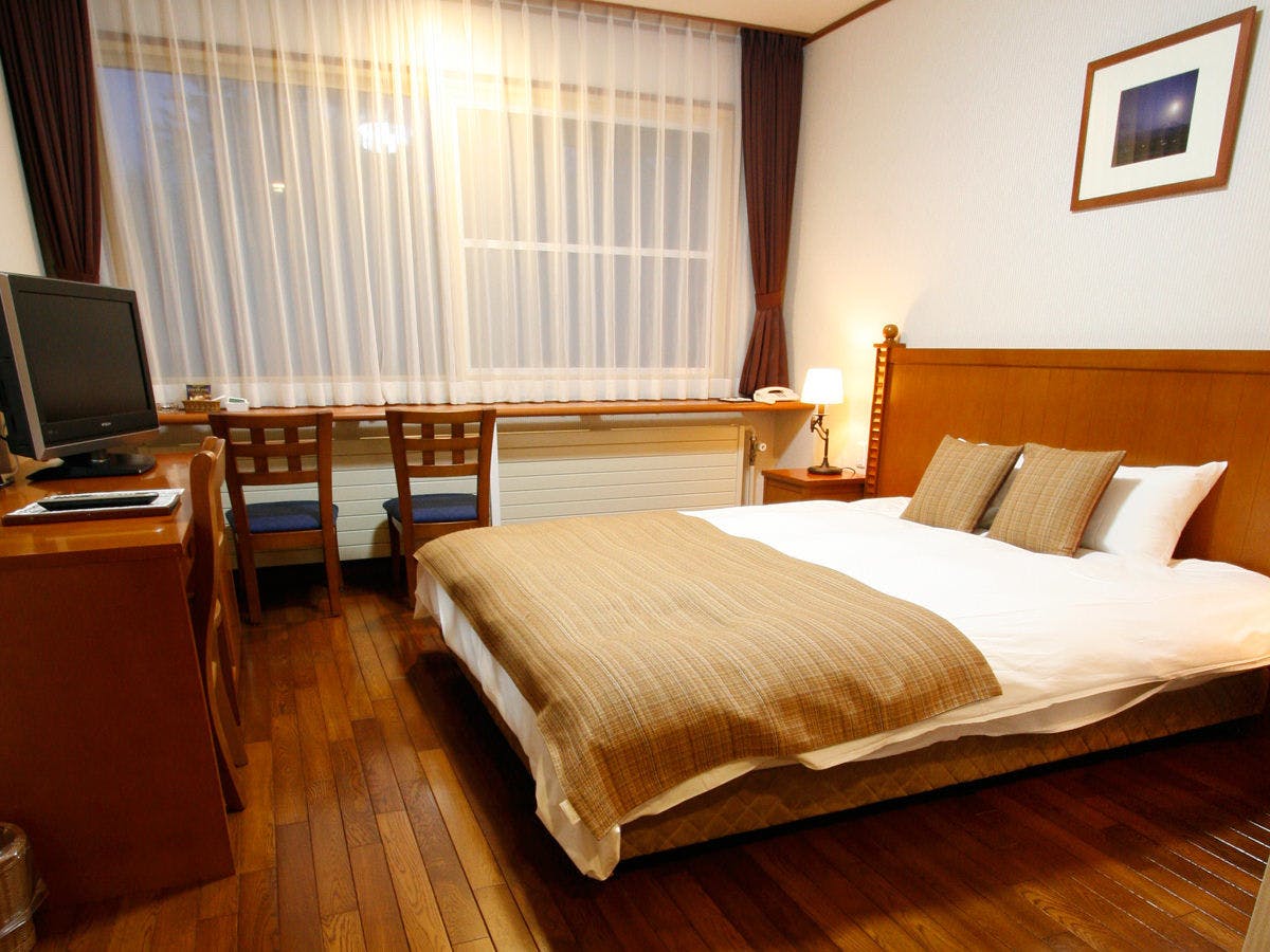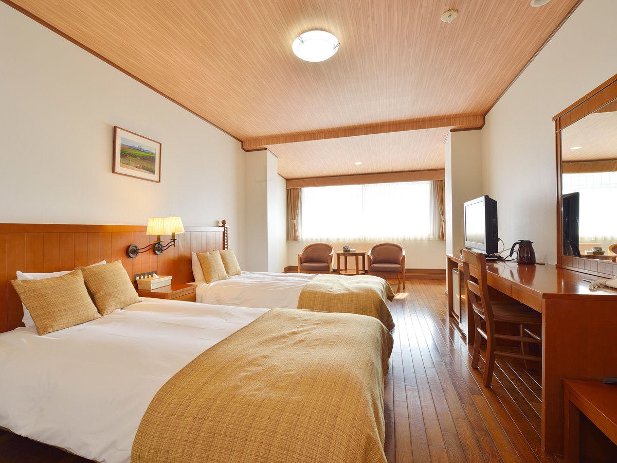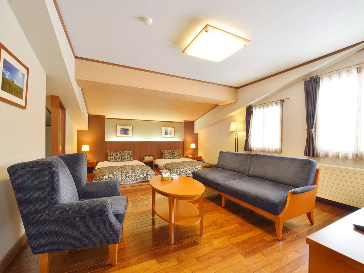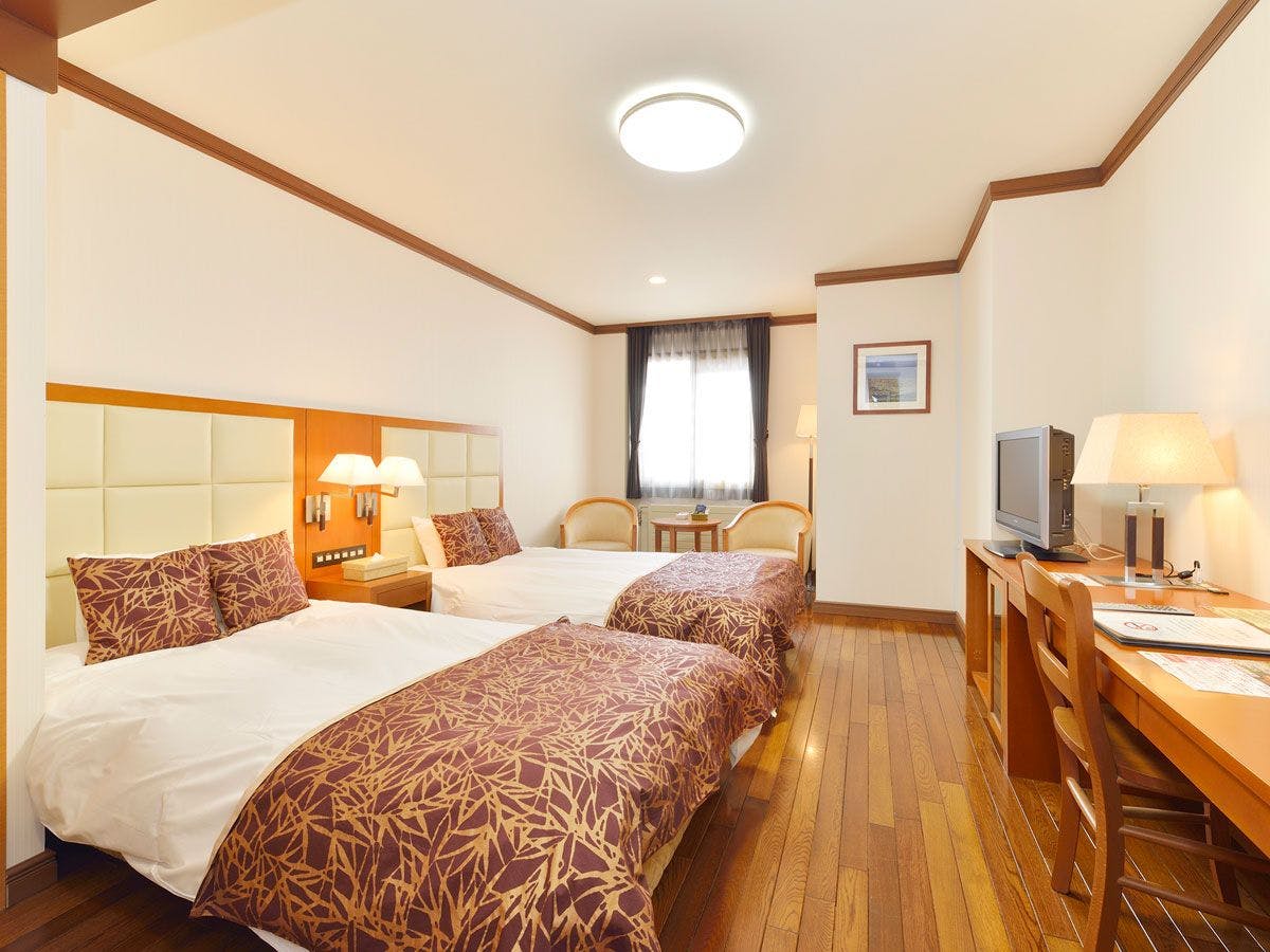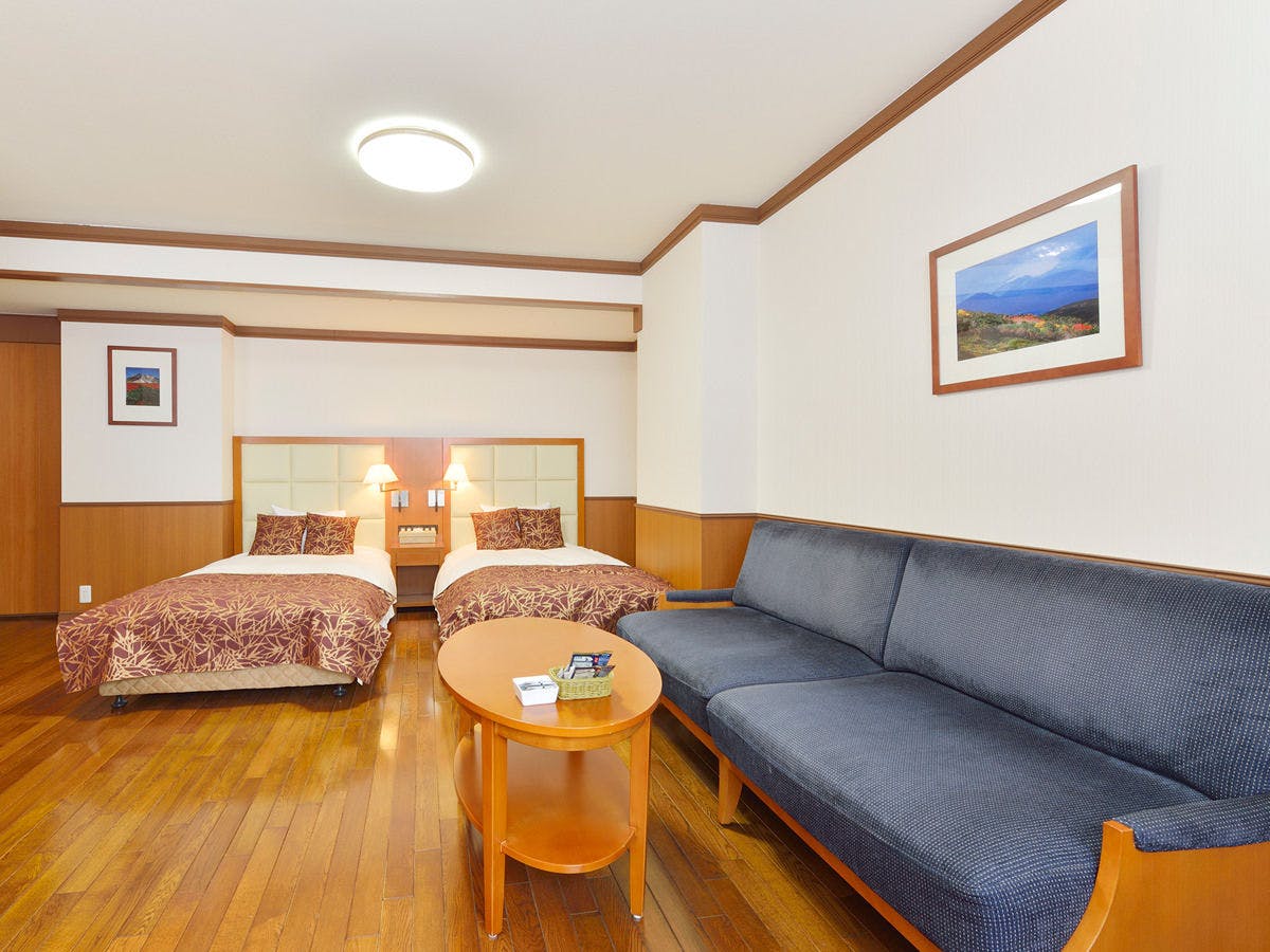 窓際に無料の電動マッサージチェアを1台ご用意した1室のみのツインルームです。森を眺めながらマッサージチェアでお寛ぎください。2台のベッドを寄せて並べたハリウッドツインタイプで、両方のベッドを合わせると220cmの広々とした空間で寛げます。