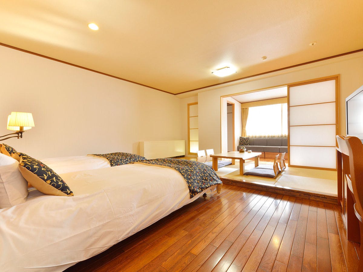 窓際にベンチシート、京畳4帖のスペースで寛げるファミリー向け1室のみの和洋室です。高さの低い広々としたローベッド2台と畳みに布団2組で4名様までお入り頂けます。