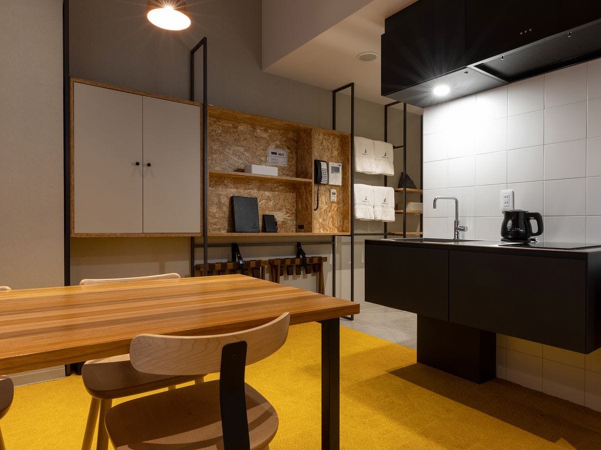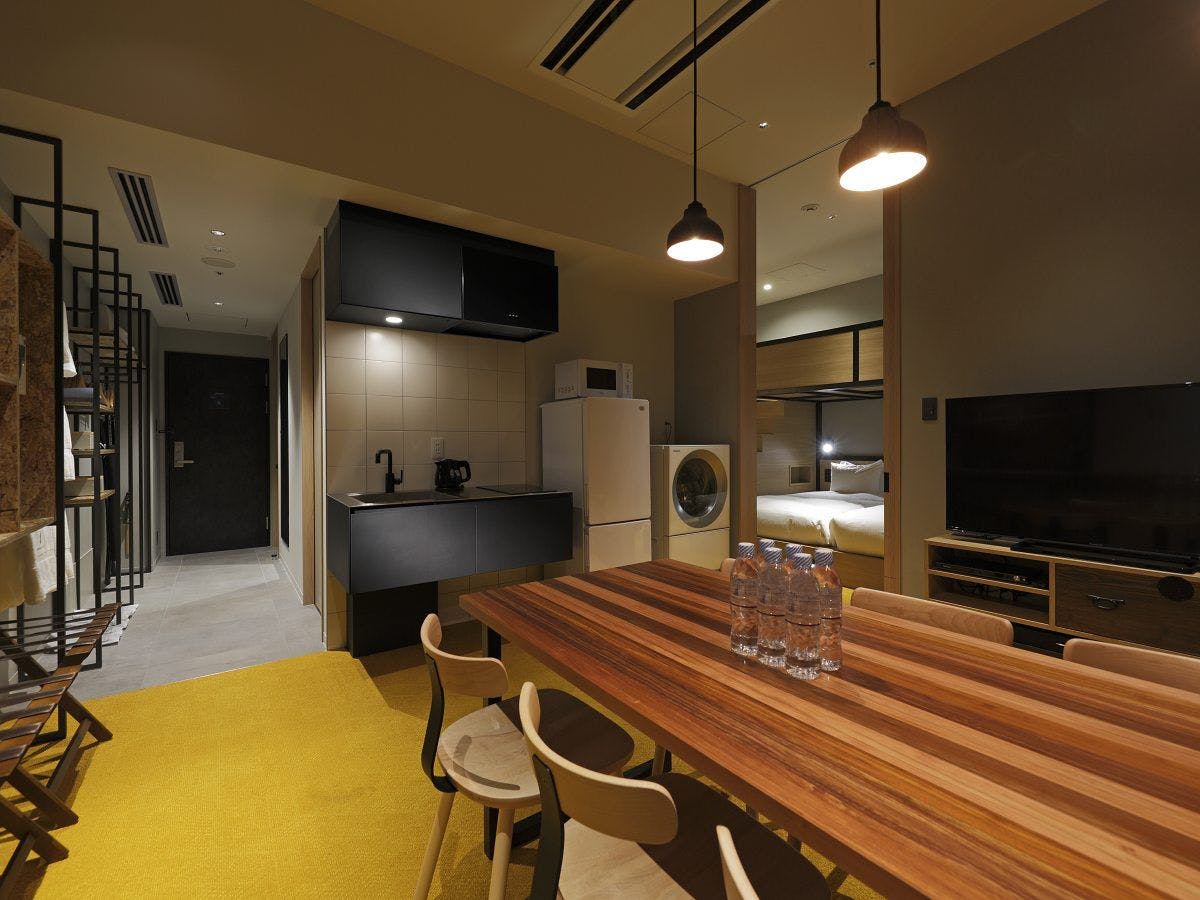 2段ベッドスタイルのベッド6台を備えたベッドルーム、リビング・ダイニング、フルキッチン付きの客室です。ご家族やグループなど、大人数でのご宿泊に最適です。洗練されたデザインの客室で、記憶に残るひとときをお過ごしください。