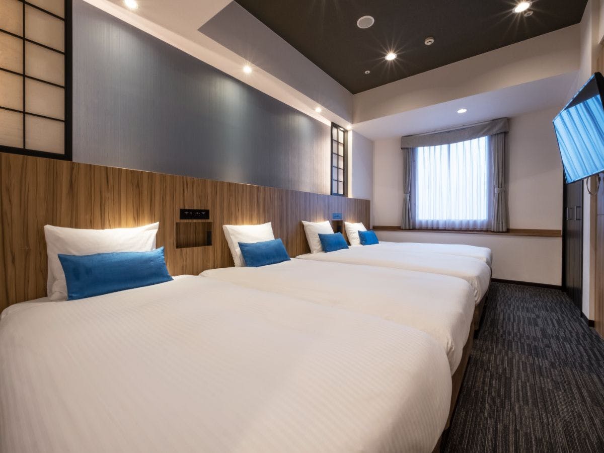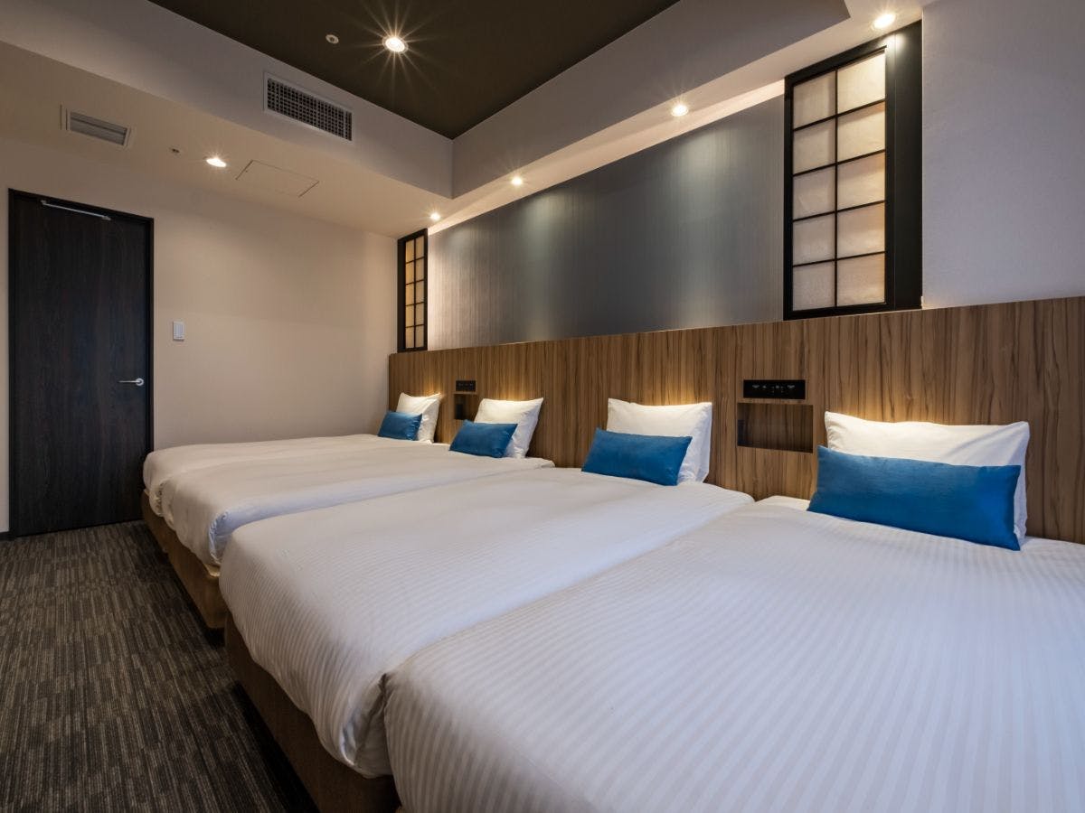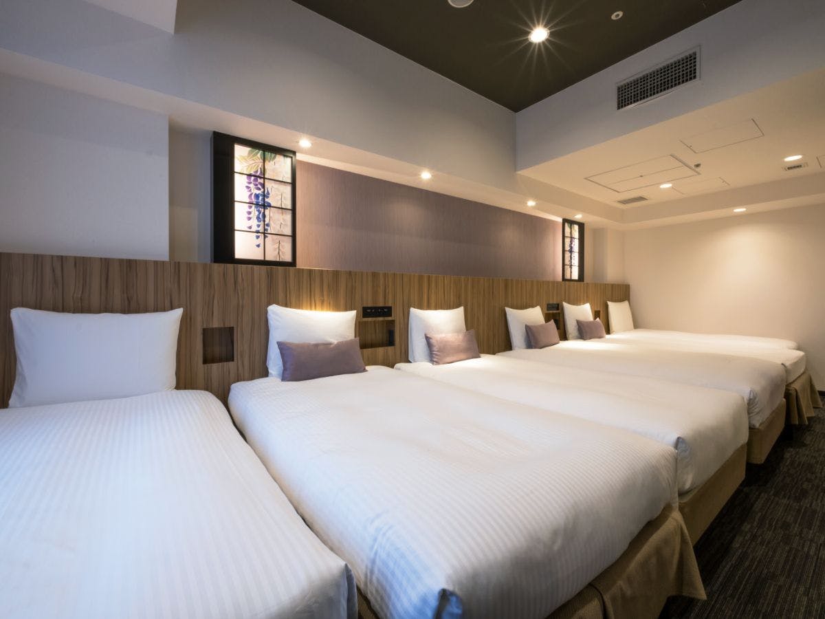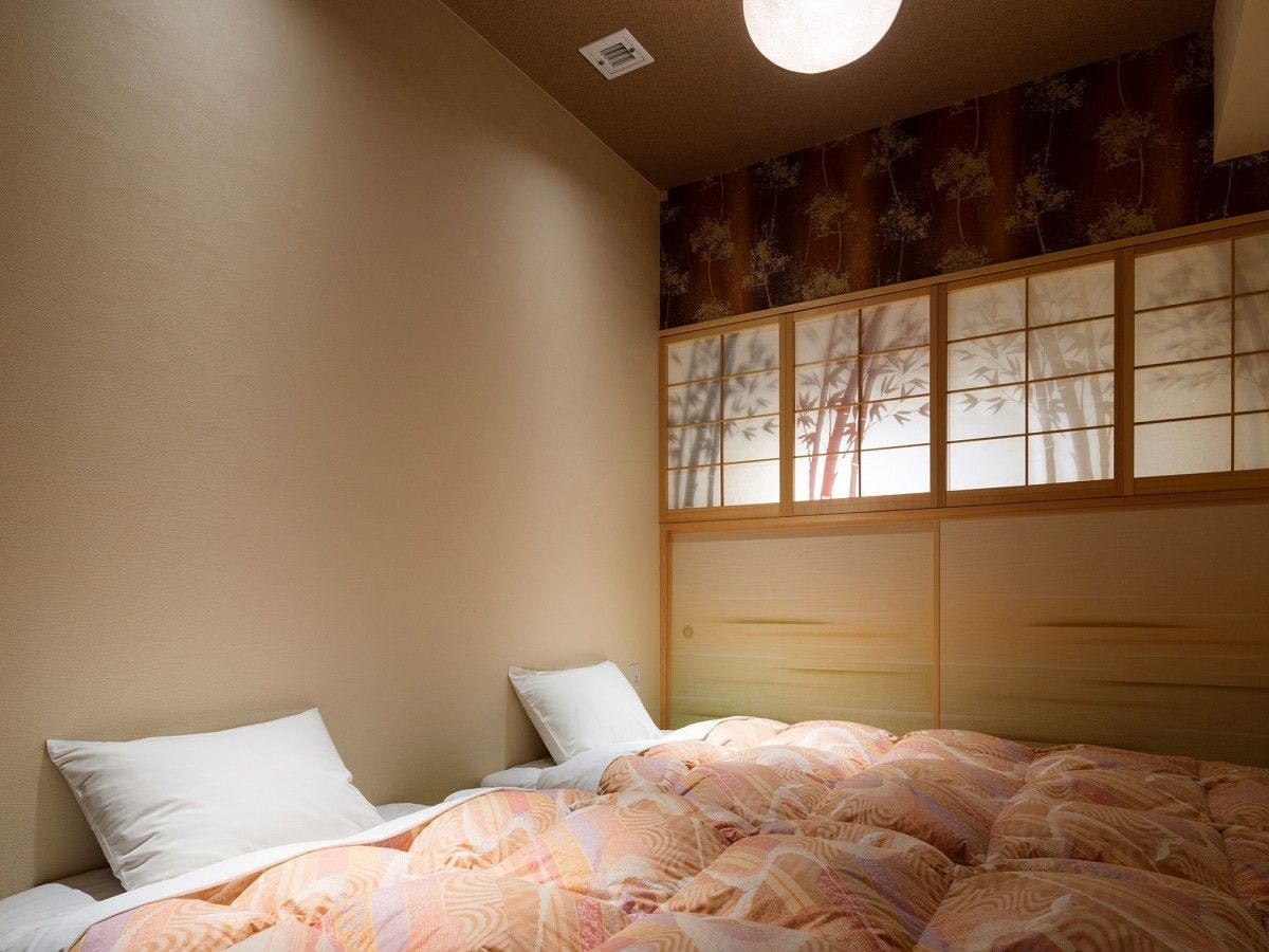 シングルベッド4台を備えたベッドルーム、和室、リビング・ダイニング、フルキッチン付きの客室です。和のくつろぎと洋の利便性を兼ね備えた空間で、上質なひとときをお過ごしください。和室には布団2組を設置可能で、最大6名様までご利用いただけます。