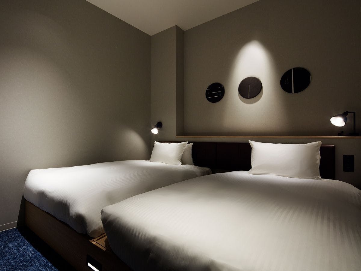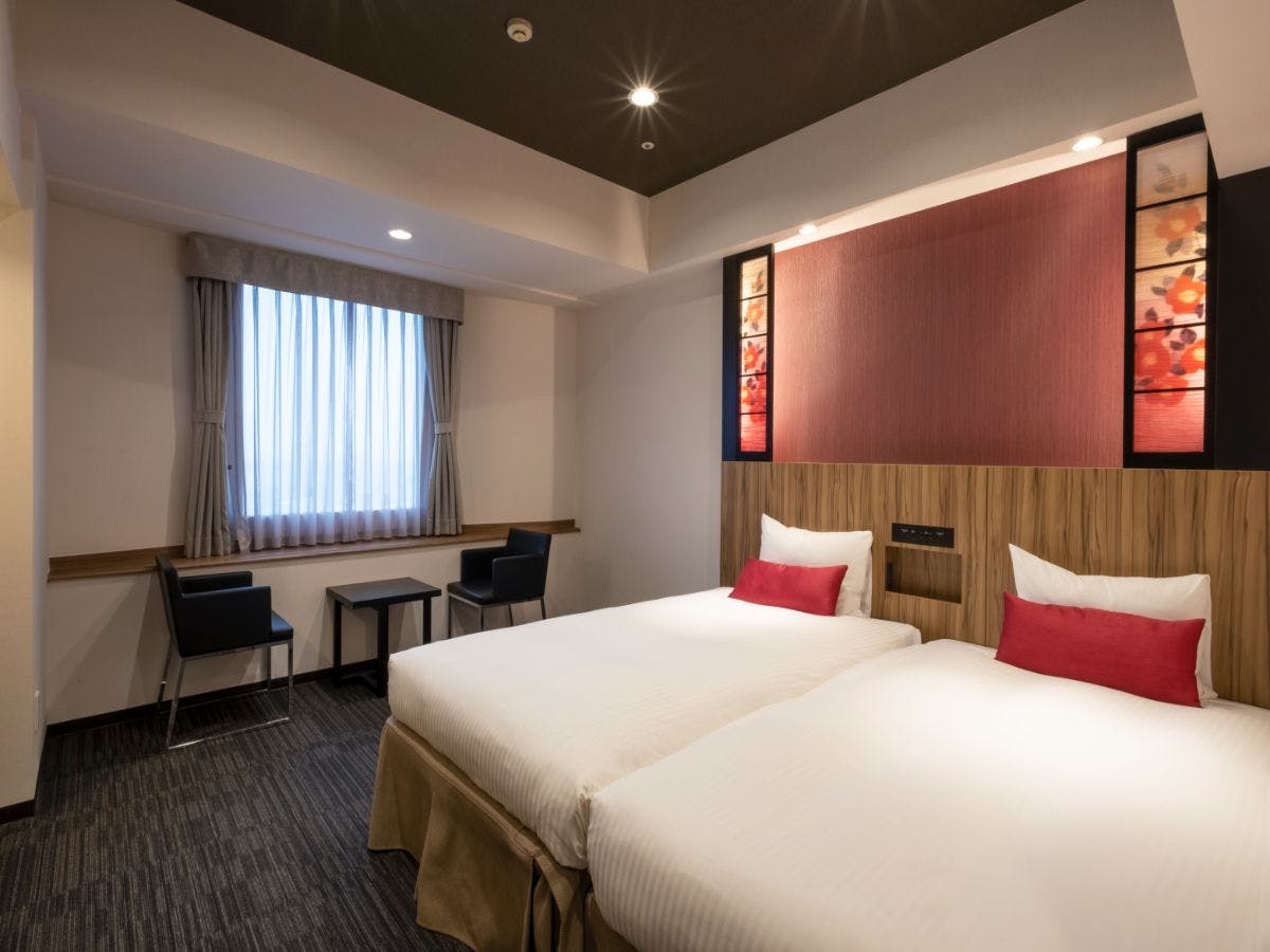 ツインベッド、簡易キッチン、椅子2脚&ミニテーブルが付いた、使い勝手の良いワンルームタイプの客室です。ゆとりある広さで、プライべート時間を快適にお過ごしいただけます。