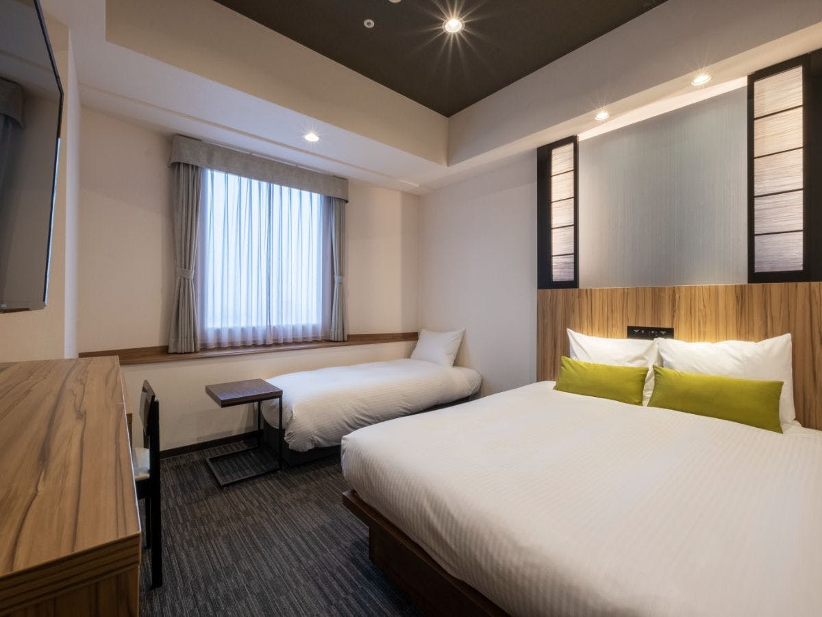 ツインベッド、簡易キッチン、椅子2脚&ミニテーブルが付いた、使い勝手の良いワンルームタイプの客室です。ツインベッドのうち1台はエキストラベッドが内蔵されており、最大3名様までご利用いただけます。
