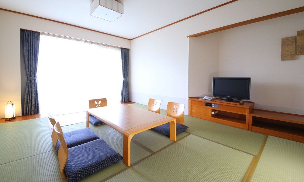大きな窓からは美しい伊東の自然を存分にお愉しみいただけます。バス・トイレ付、加湿器付空気清浄器、冷暖房エアコン、無料Wi-Fi