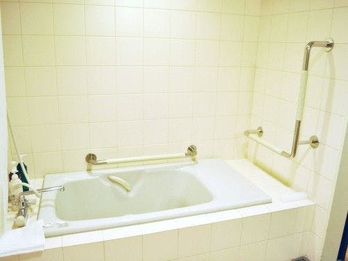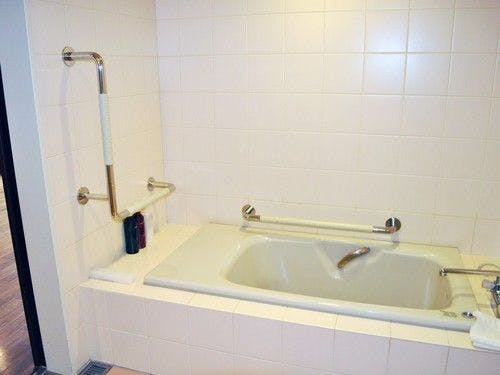 浴槽部分とトイレには手すりを設置。車椅子でも使いやすいよう部屋の入口やバスルームへの扉はスライド式ドアです。
