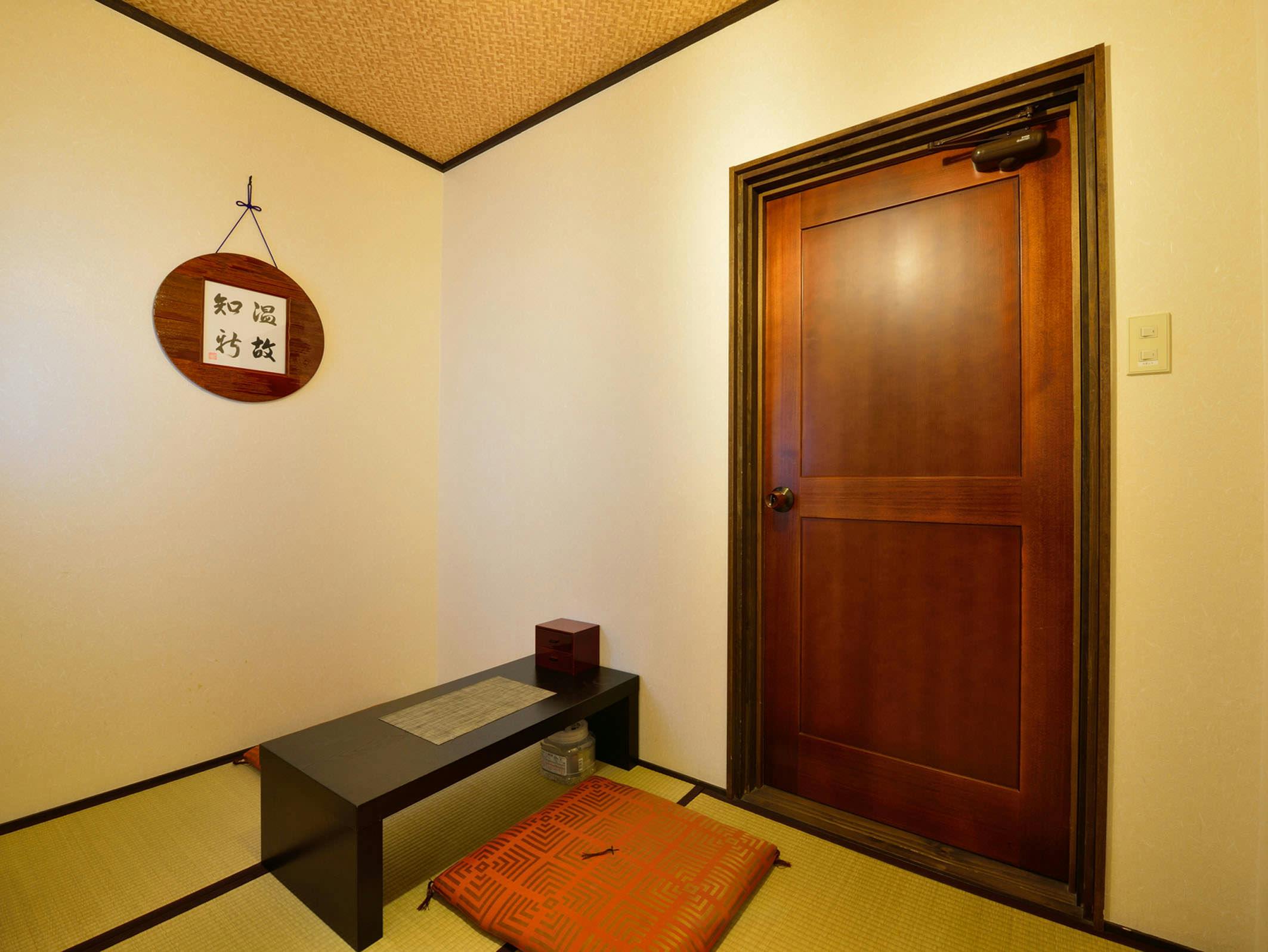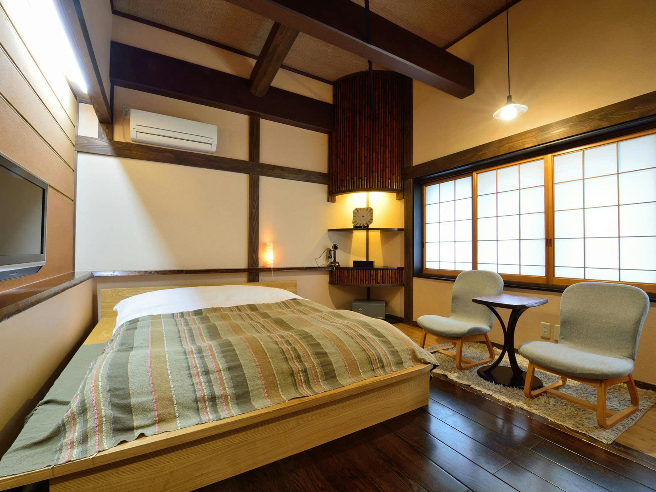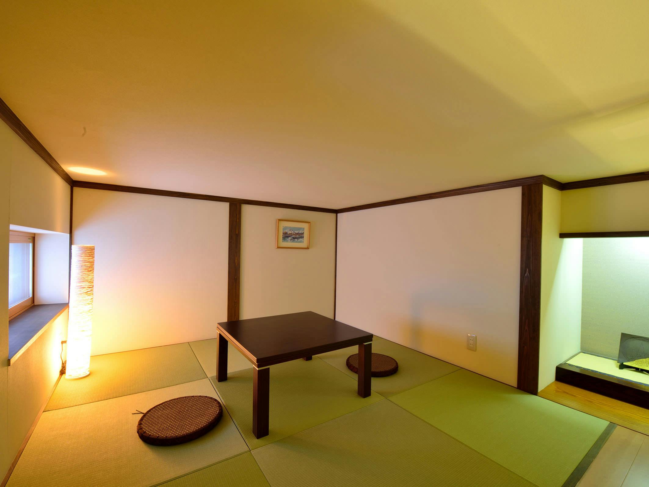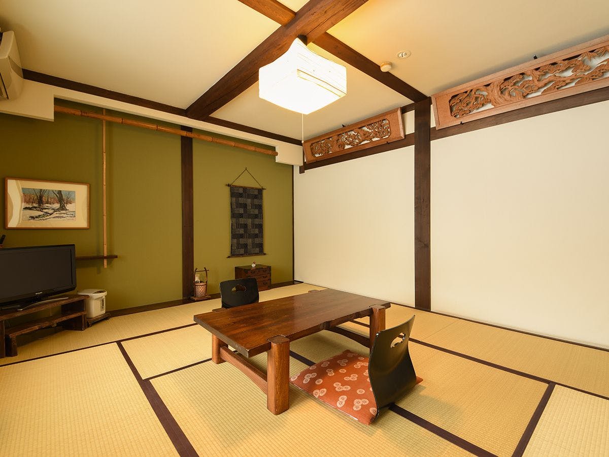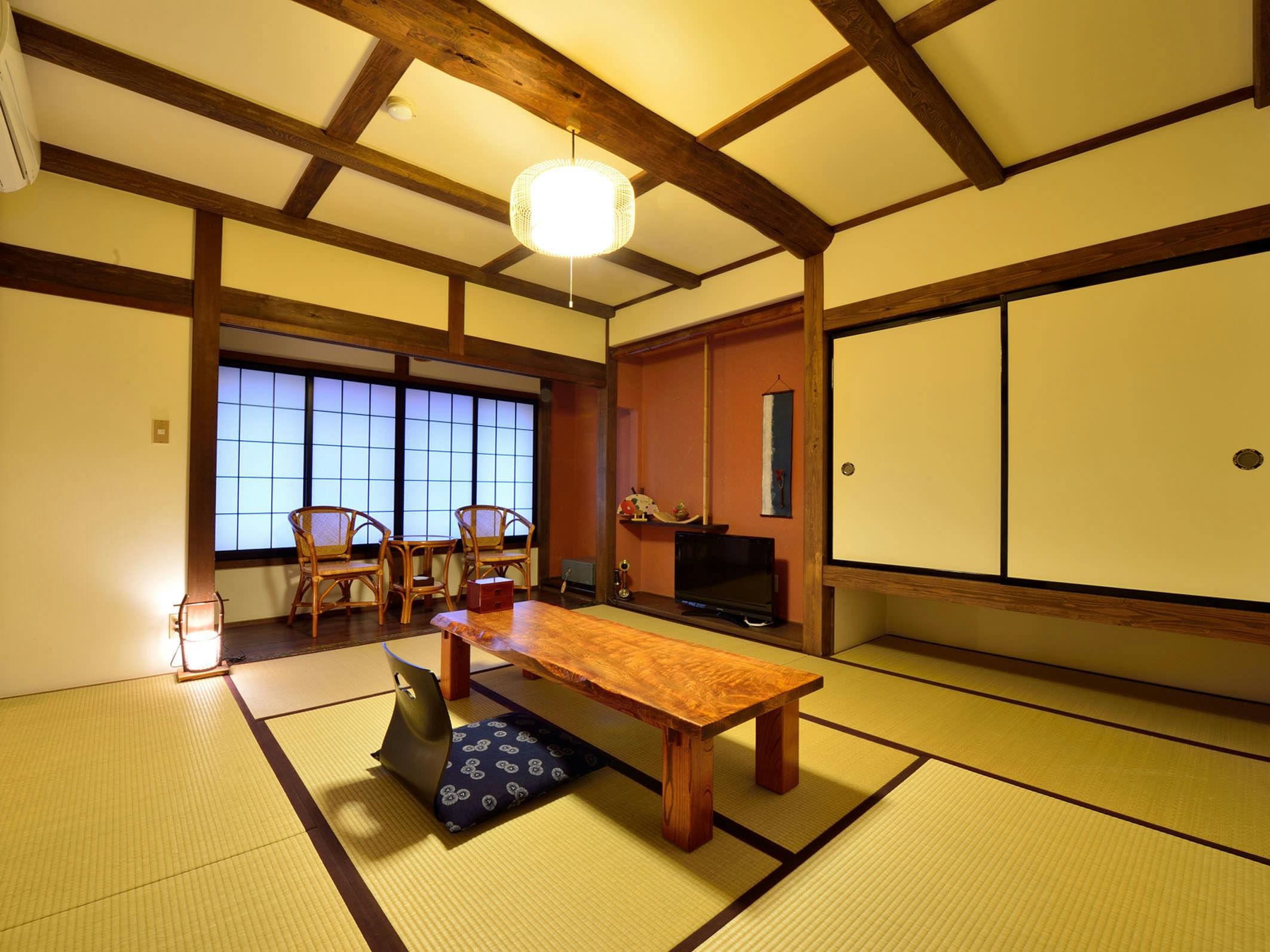 小民家をリノベーションしたノストラジックな和室10畳の客室です。落ち着いた色調の客室でごゆるりとおくつろぎください。
