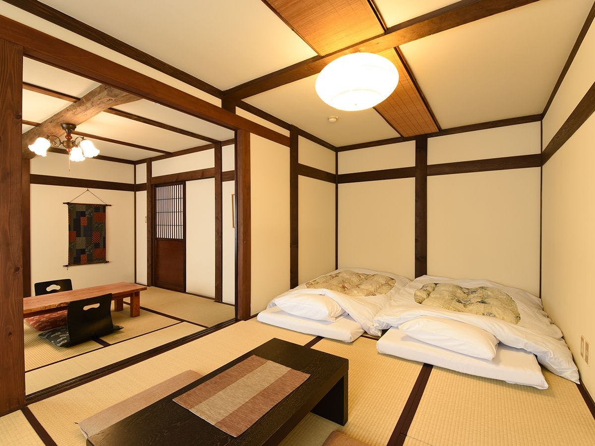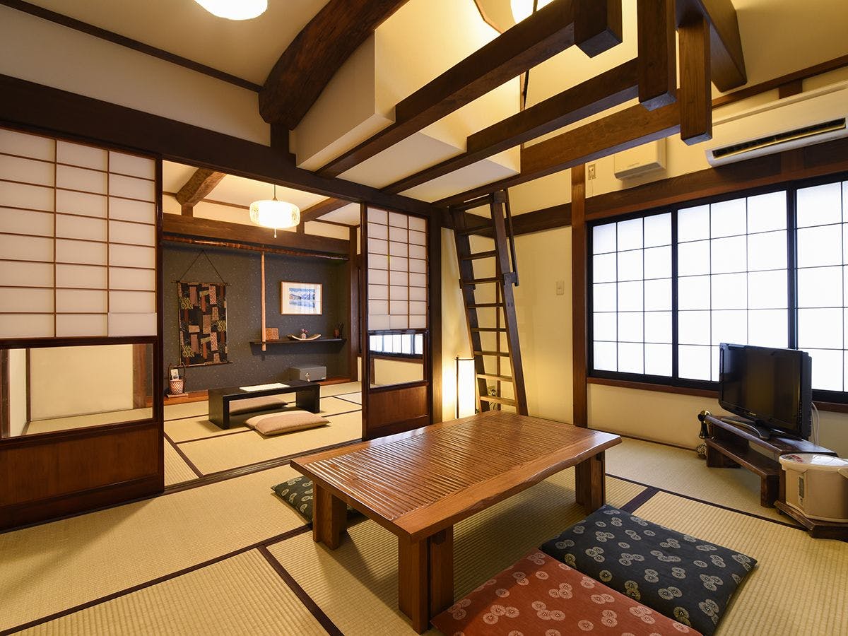 和室8帖+8帖+ロフトに控えの間がついた豪華な客室です。奥飛騨の自然を楽しみながらゆったりとお過ごしいただけます 。山々を眺めながらゆったりとしたひとときをお過ごし下さい。※ロフト(屋根裏部屋)は遊びの空間です。 はしごでのご利用となります。