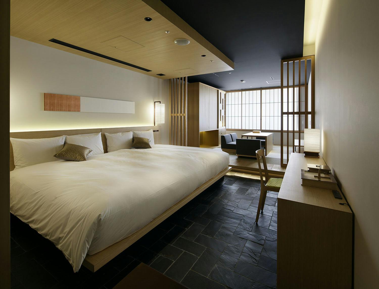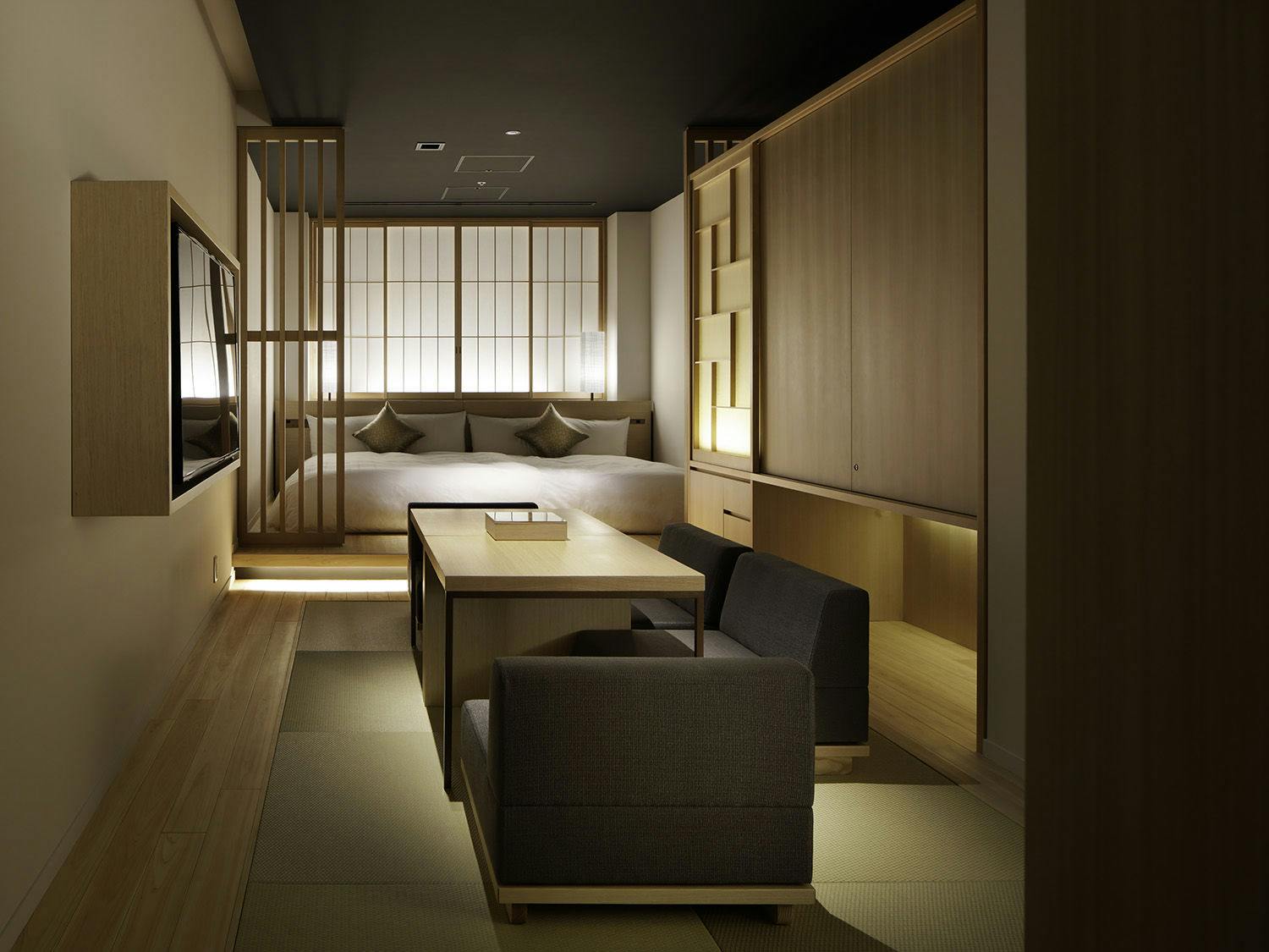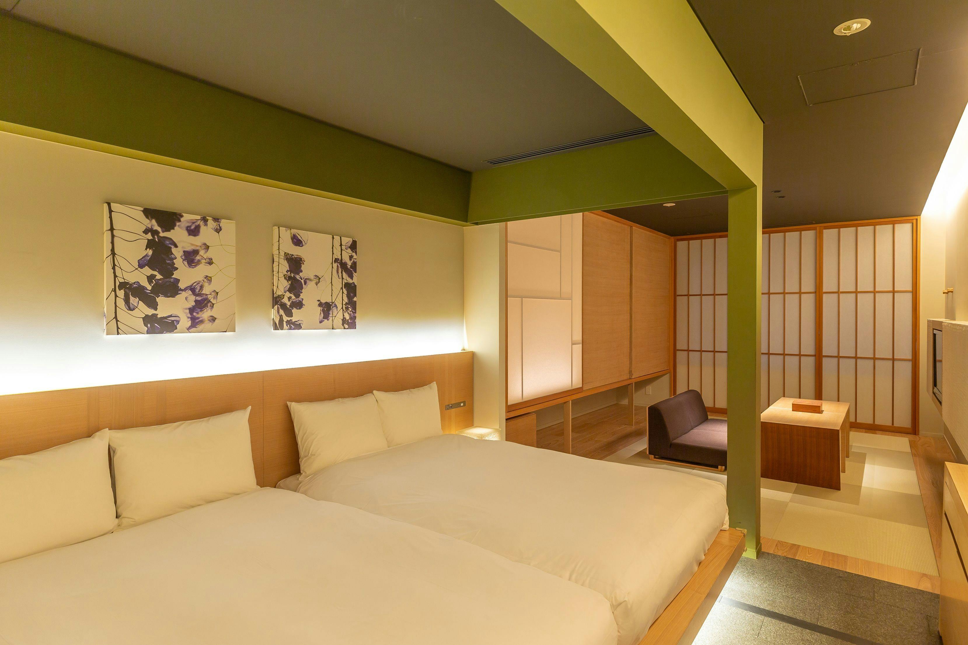 京町家を思わせる約46平米の客室には、140センチ幅のワイドサイズベッドを2台備えたメインベッドルームがあり、更にその奥には和の“趣”を感じる畳スペースをご用意。客室には京都の素材をモチーフにした、様々なアートをご覧いただけます。