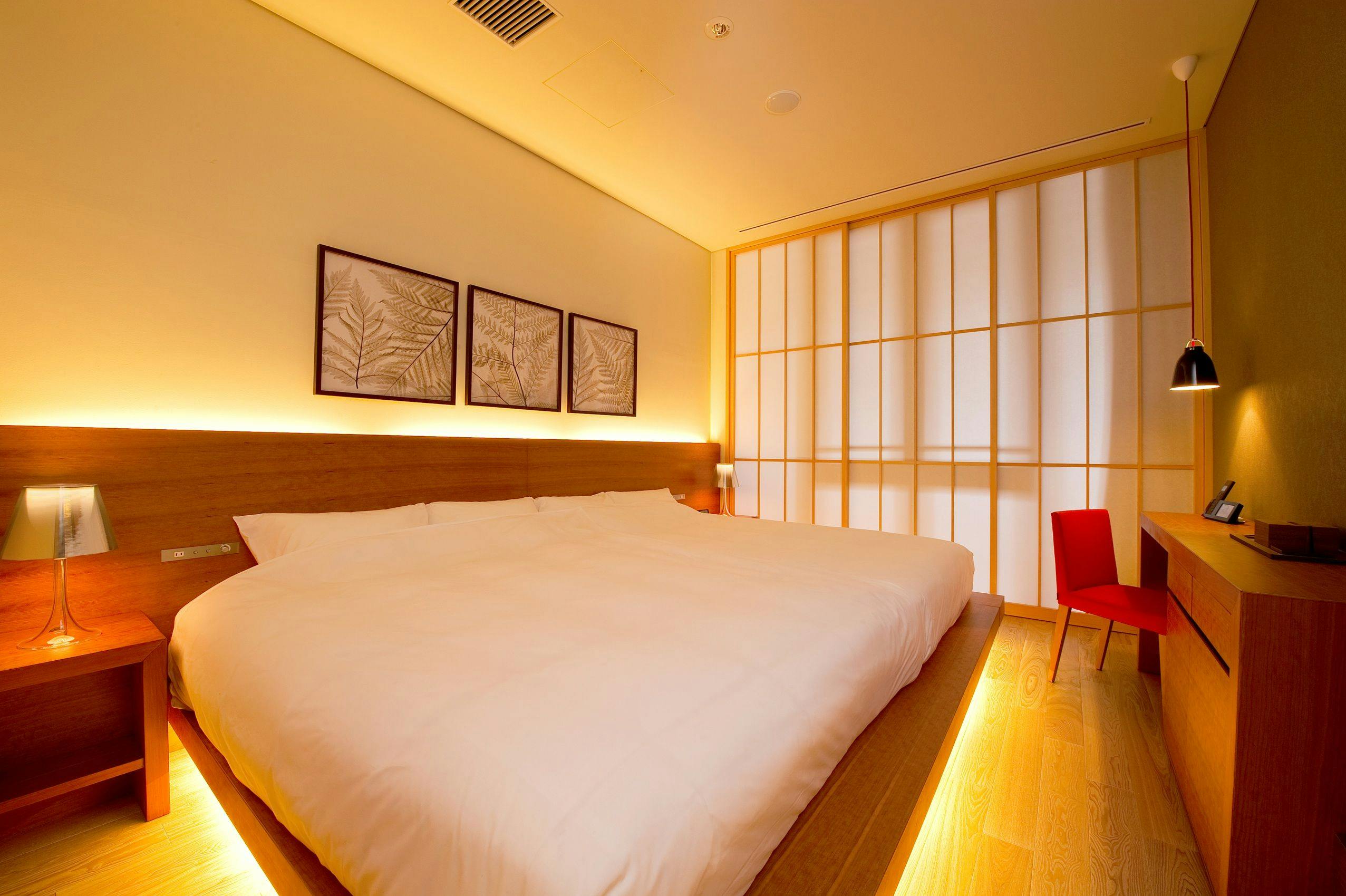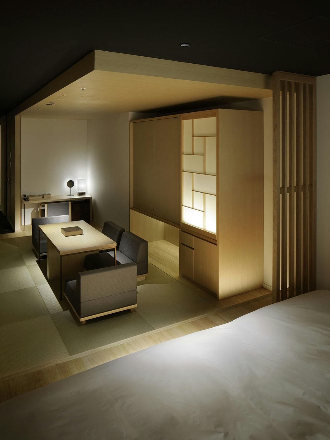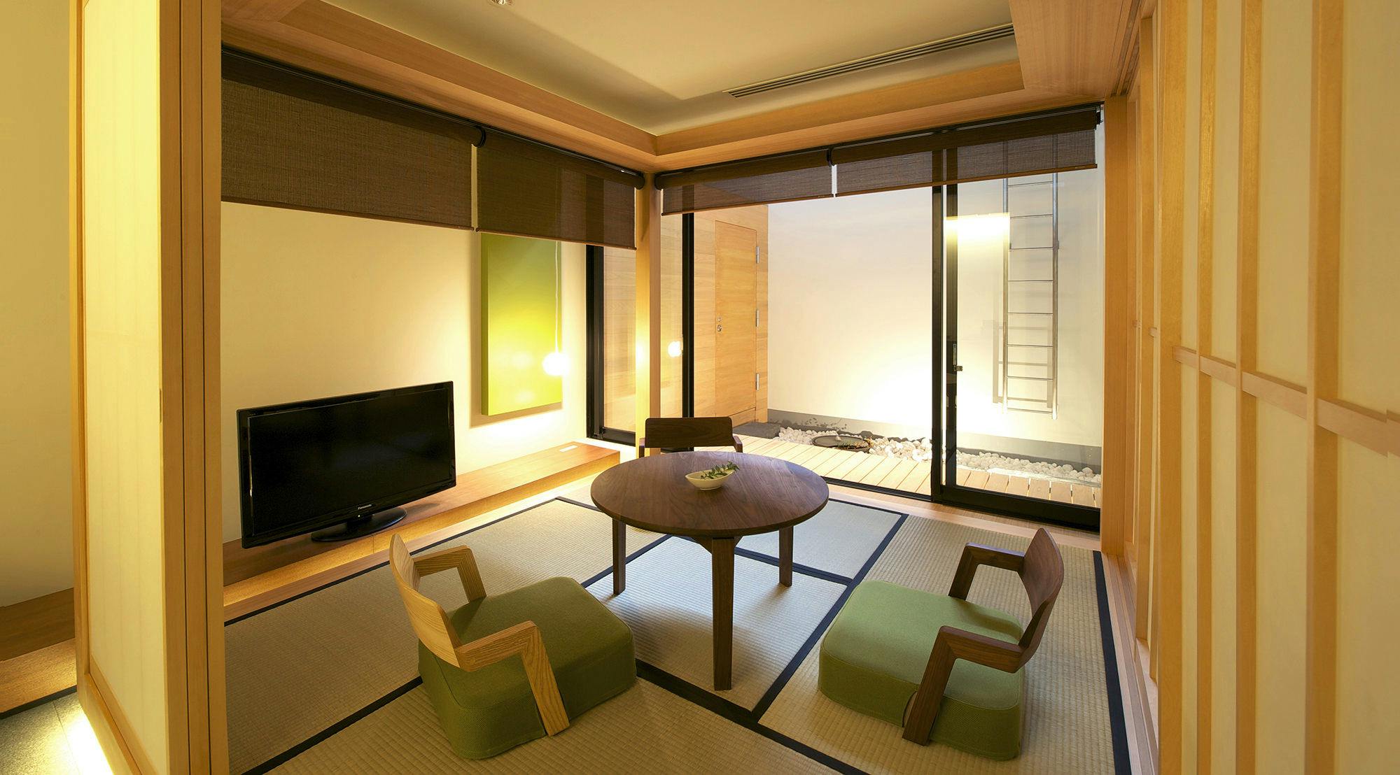 京町家を思わせる約46平米の客室には、140センチ幅のワイドサイズベッドを2台備えたメインベッドルームがあり、更にその奥には和の“趣”を感じる畳スペースをご用意。客室には京都の素材をモチーフにした、様々なアートをご覧いただけます。