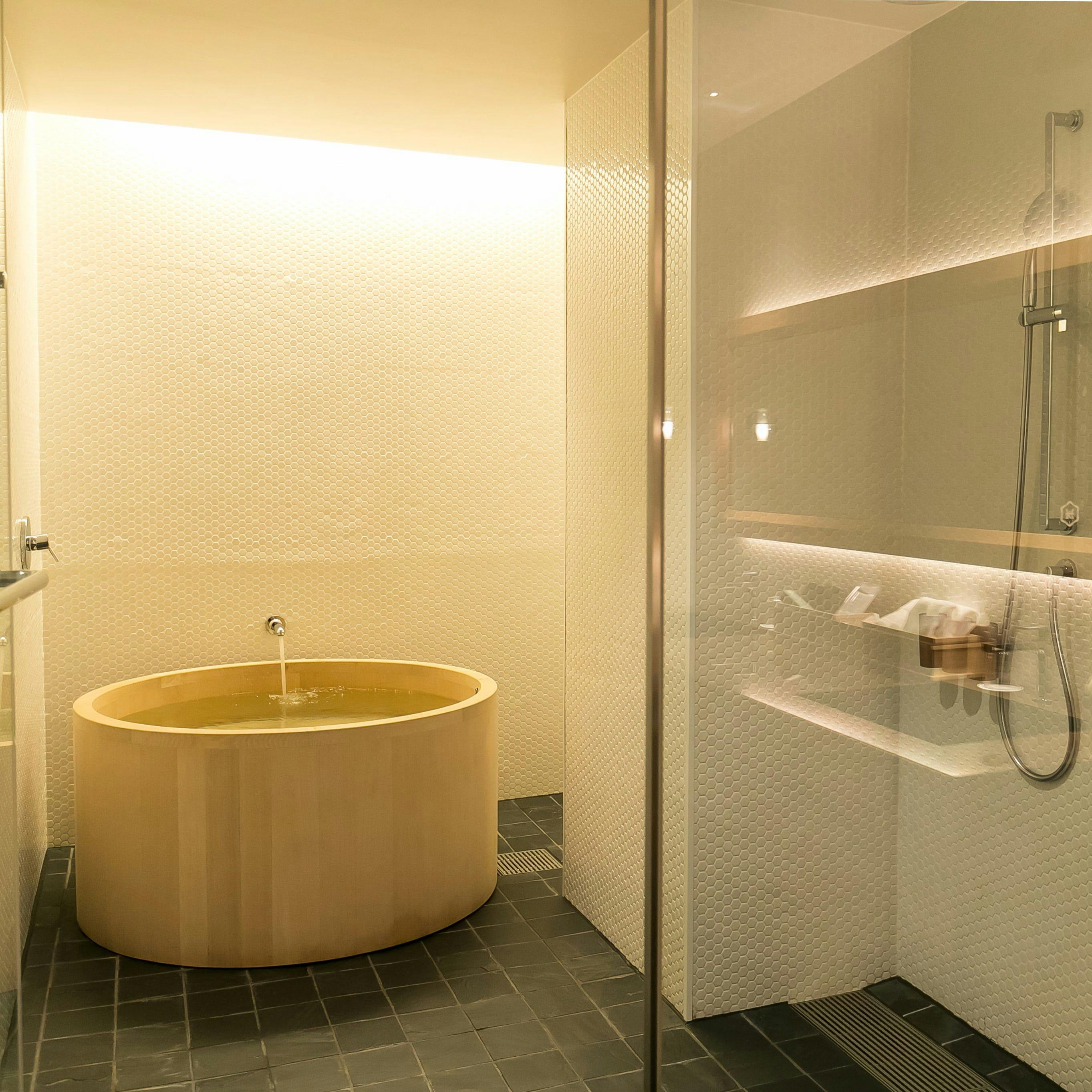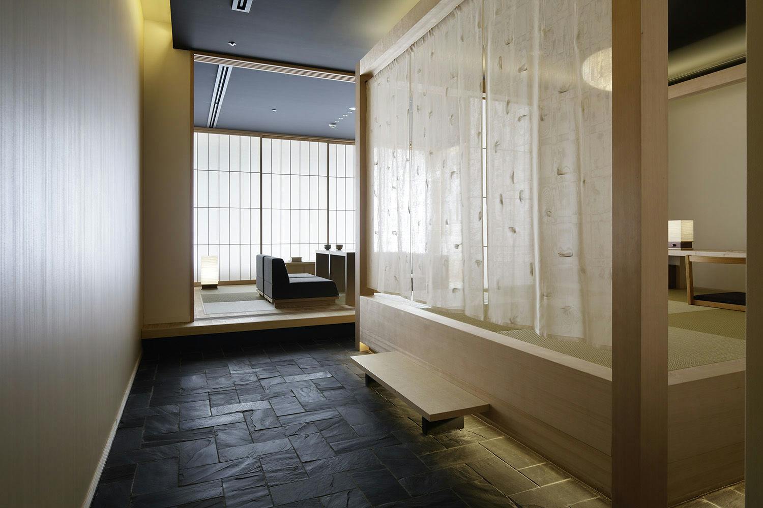 約47平米の客室は長屋の考え方を取り入れ、客室の手前には香り豊かな檜葉(ヒバ)の木の浴槽を設えたバスルームがあり、メインベッドルームと畳のリビングスペースをご用意しております。