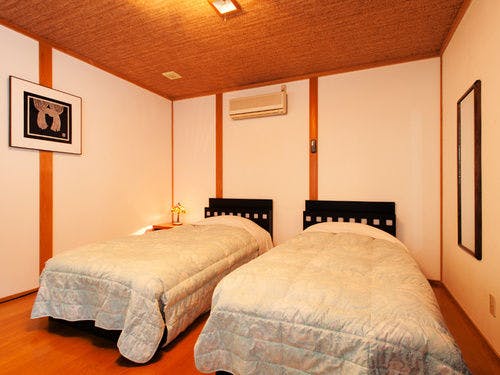 檜内風呂付きの戸建離れ和洋室。和室とツインベッドルームが配されたお部屋。■ご 案 内 ・ サ ー ビ ス■・全室離れでプライベート重視の造り。・夕食、朝食ともにお部屋食・イン時、抹茶サービス(※午後6時インまで)・朝食後コーヒーサービス・1室1部、読売新聞朝刊サービス