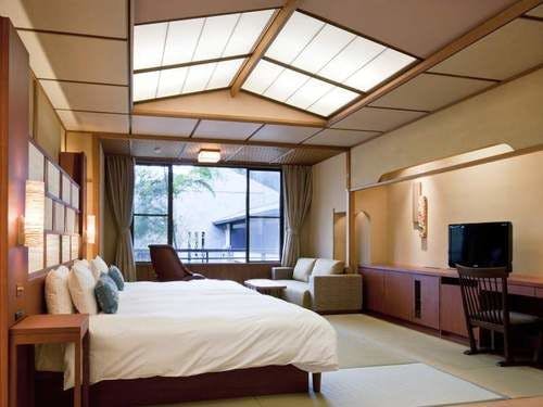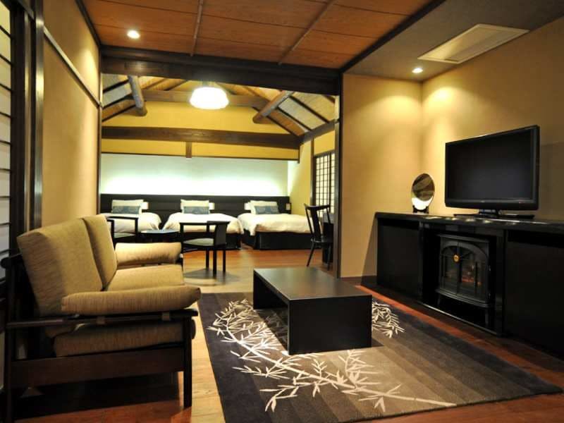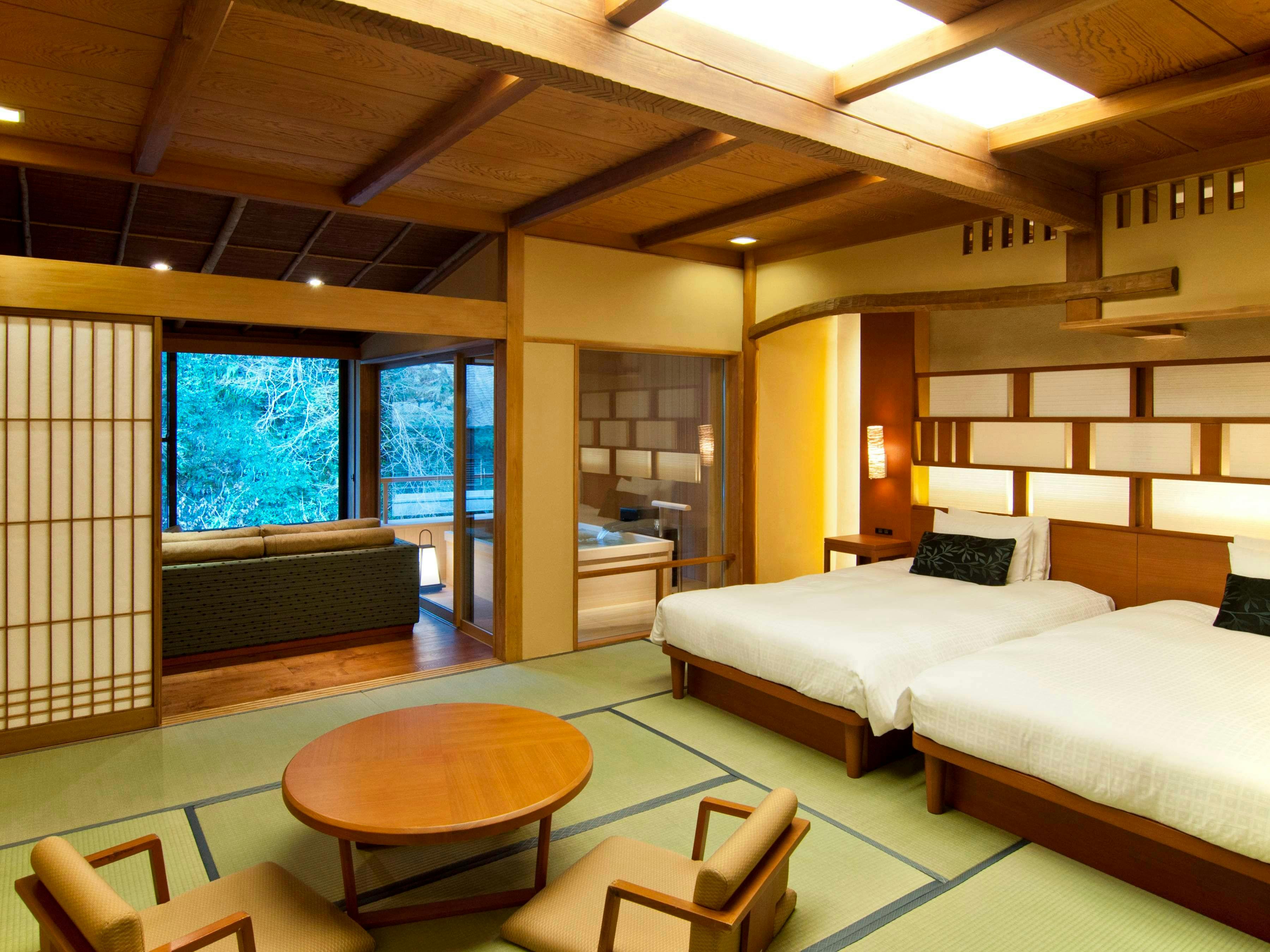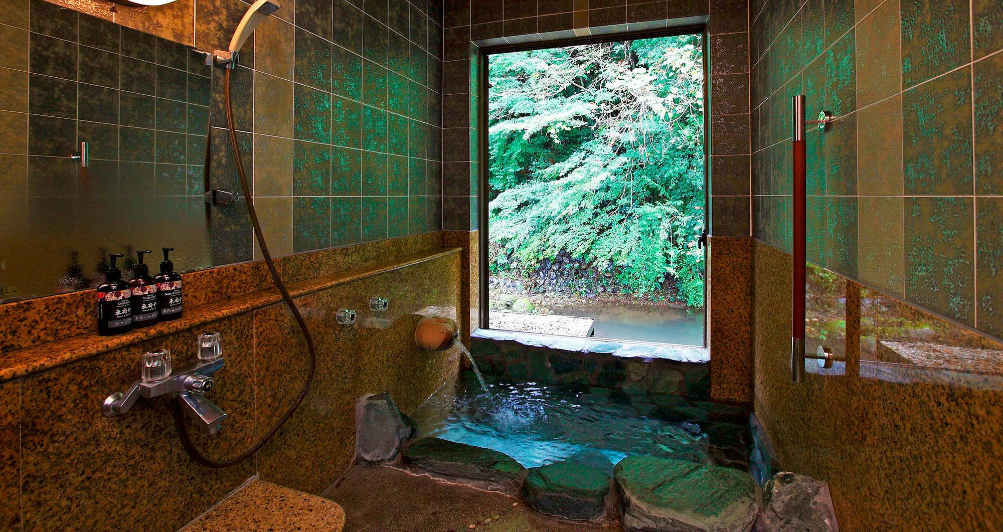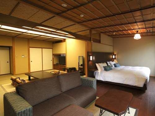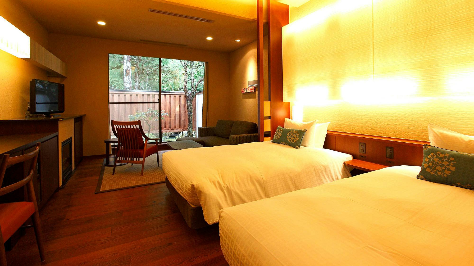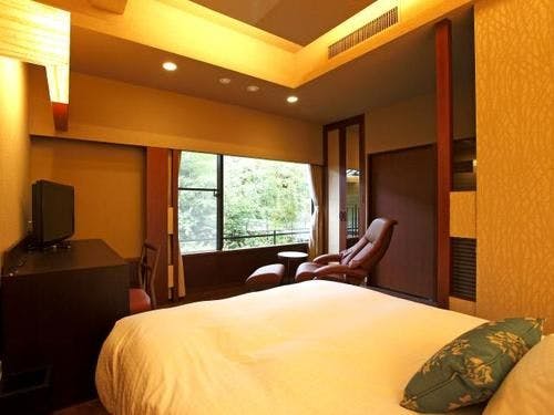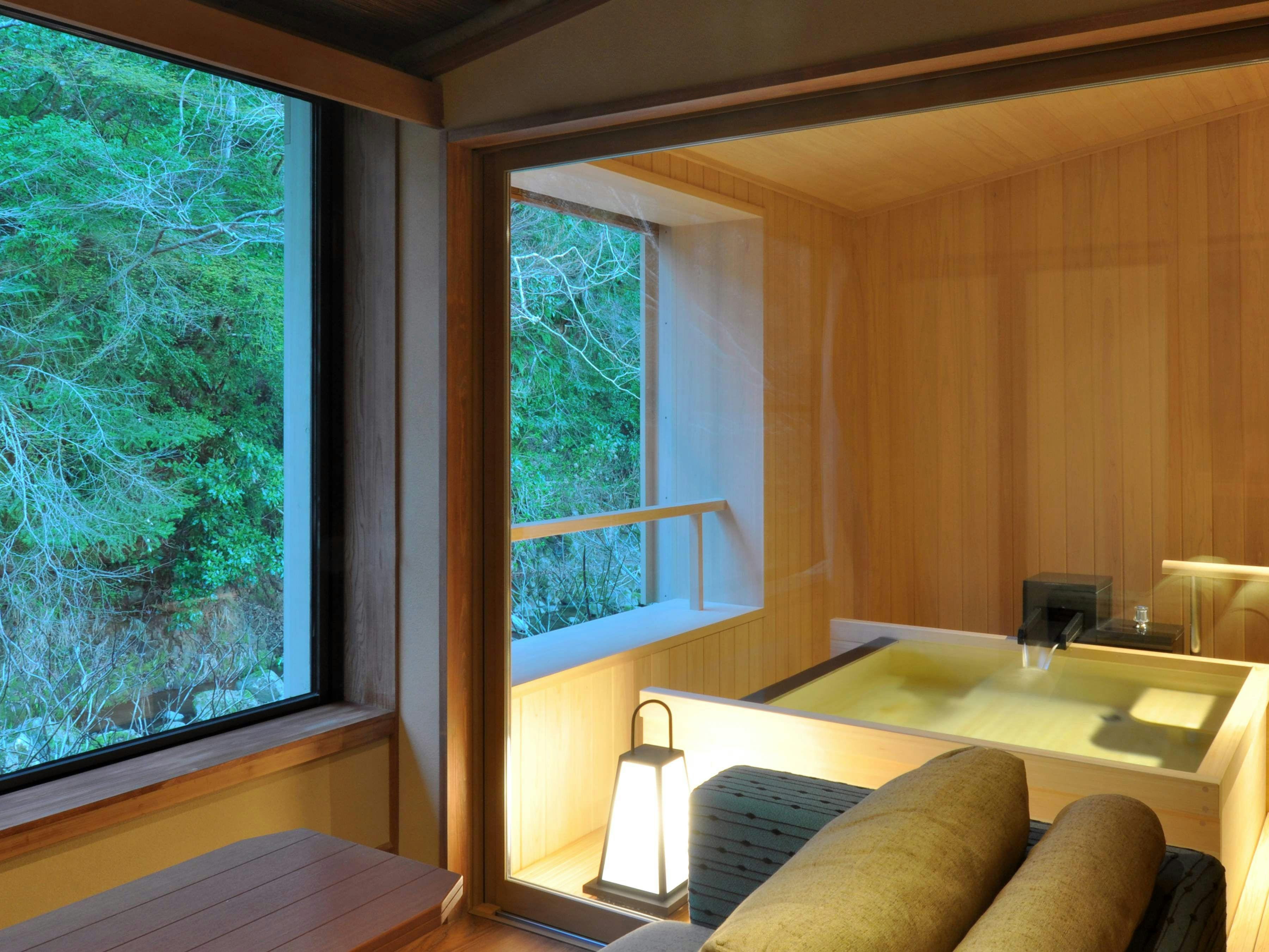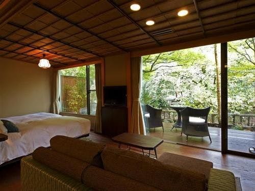 ゆったりとしたリビングと落ち着きのある和室、ツインベッド、そしてテラスには、間近に川を望む温泉露天風呂がございます。弱アルカリ性のやさしい肌ざわりの湯を贅沢に浴び、川のせせらぎをBGMに自然と一体になったかのようなくつろぎの時間を満喫していただけます。