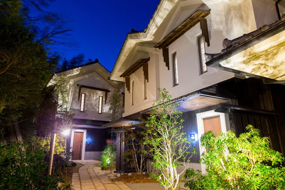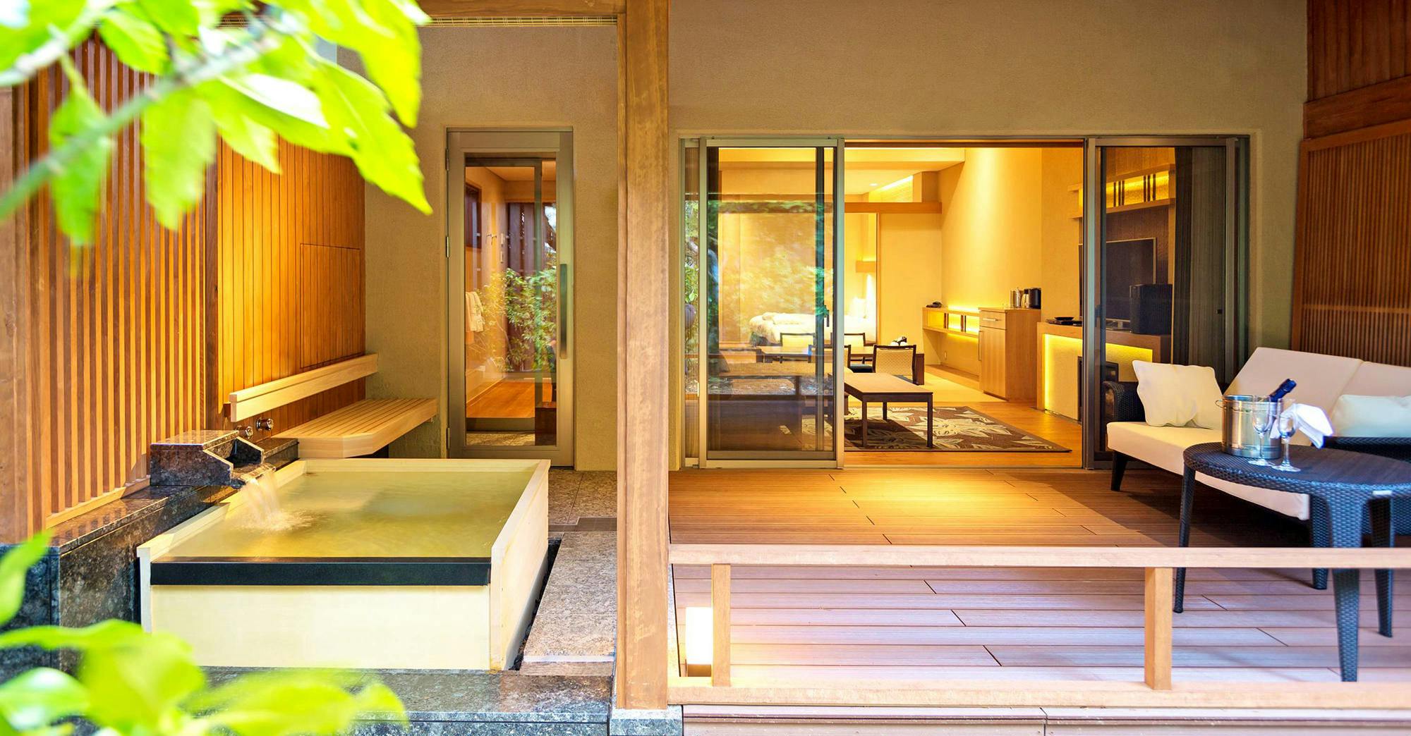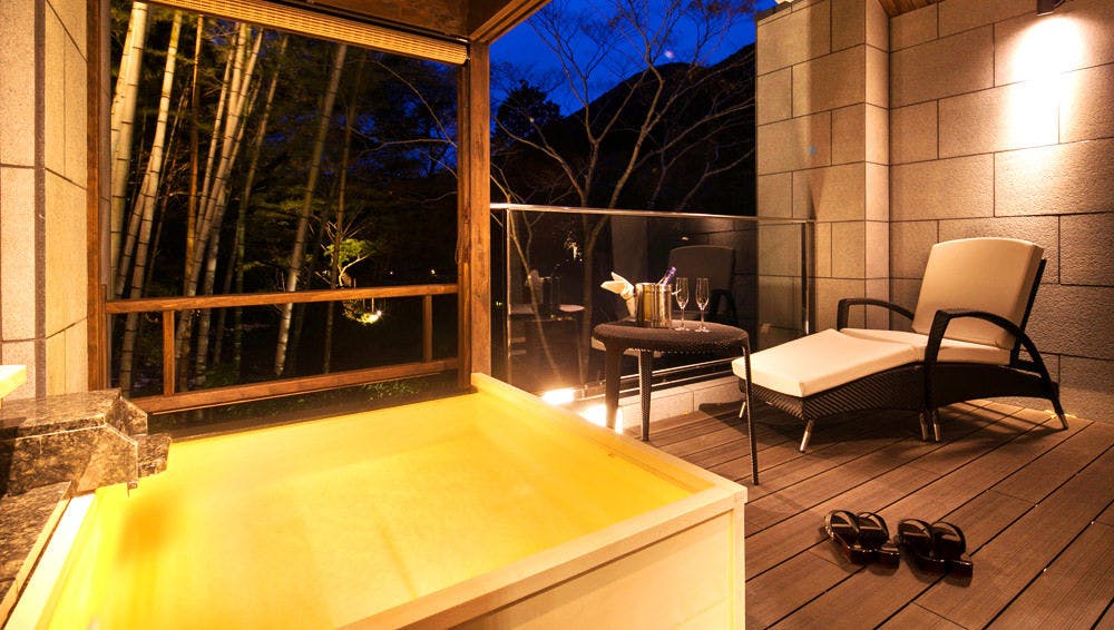 温泉露天風呂を備えたメゾネット(洋室)タイプの離れ客室です。