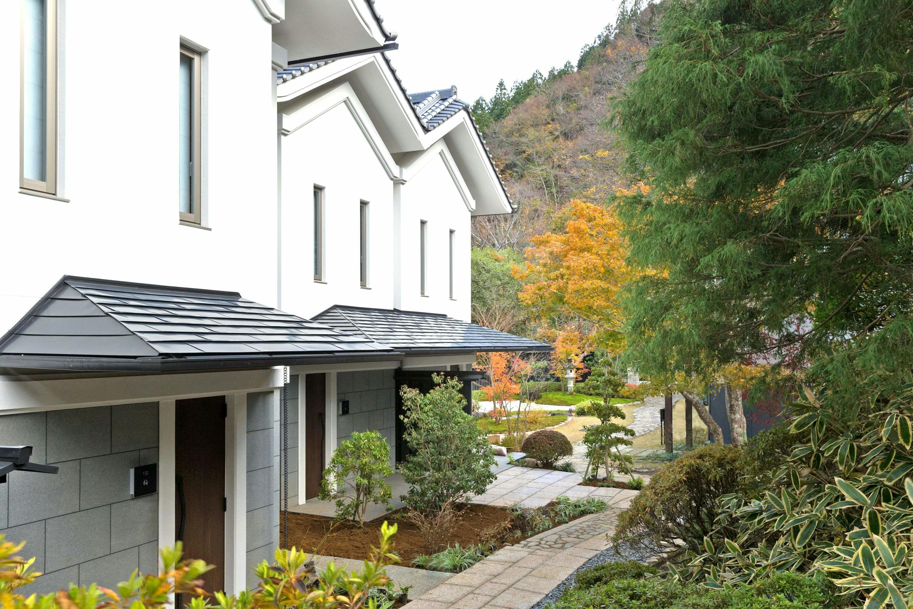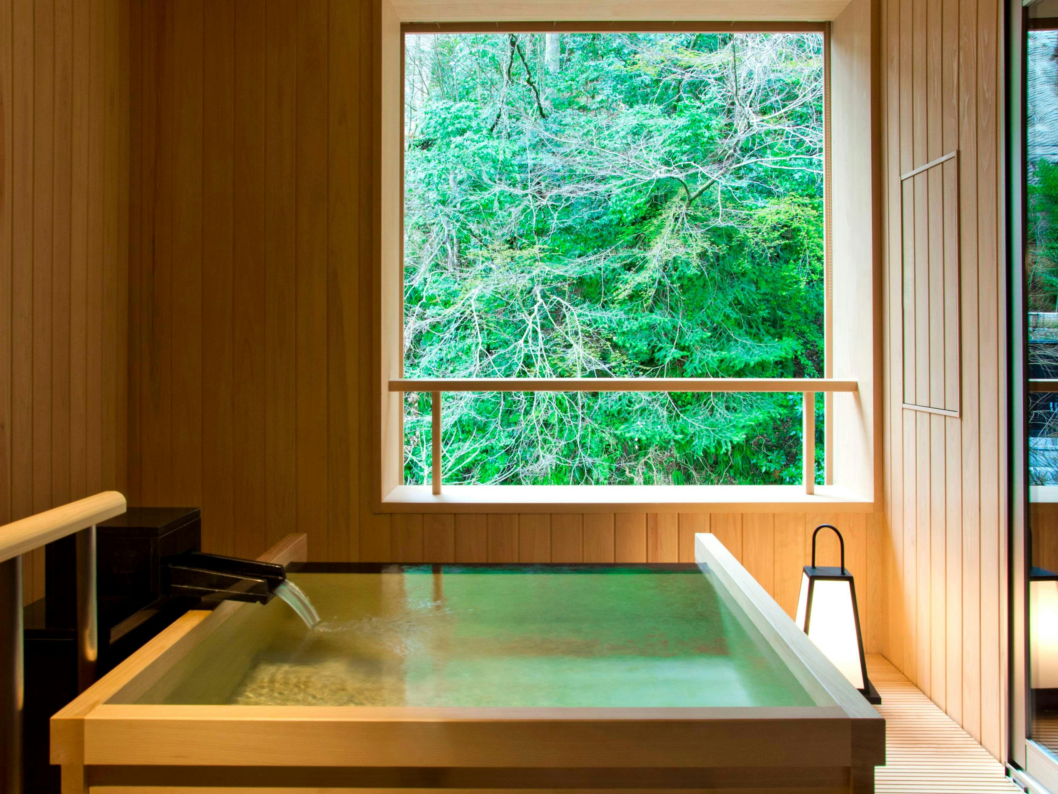 吹き抜けのゆったりとしたリビングでは、2階層分の大きな窓から自然の景色をダイナミックに感じられます。2階のテラスに備えた温泉露天風呂では、弱アルカリ性のやさしい肌ざわりの湯を贅沢に浴び、川のせせらぎをBGMに自然と一体になったかのようなくつろぎの時間を誰にも気兼ねすることなくお好きなときにお好きなだけ満喫していただけます。