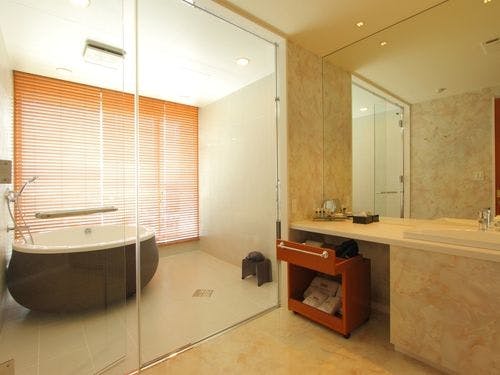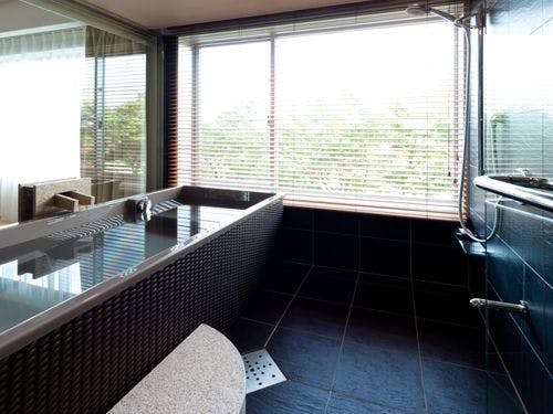 ・客室内バスルームは、本館特別室専用仕様。最上階から外の景色をご覧いただきながら、高級バスタブJAXSON製の内風呂でご入浴いただけます。