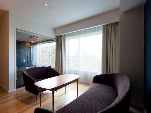 ・客室内バスルームは、高級バスタブJAXSON製の内風呂。ガラス張りで解放感が溢れる仕様