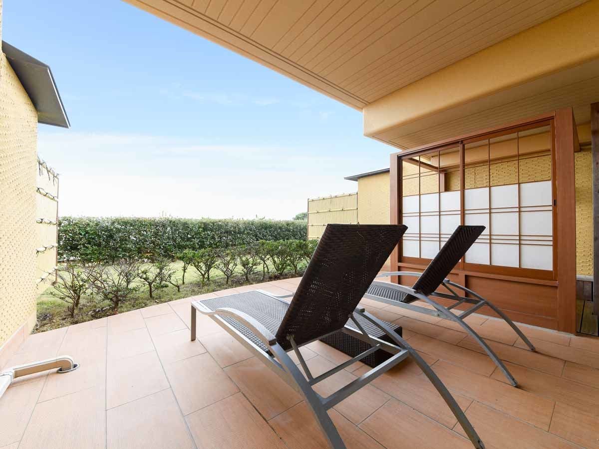 部屋の周りを濡れ緑が廻る離れの角部屋。松林の間から海を間近に感じられ、プライベートビーチでうたた寝しているかのようです。2面続きのガラス窓は開放感も満点。広めのお部屋には2ベッド。ゆとりある設定です。