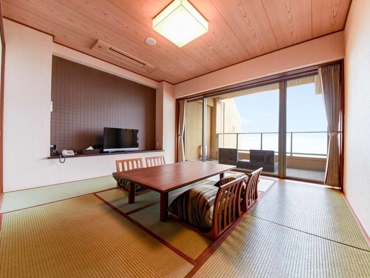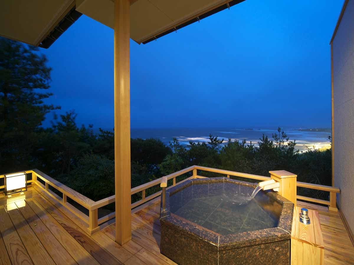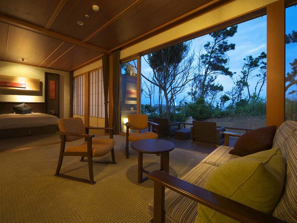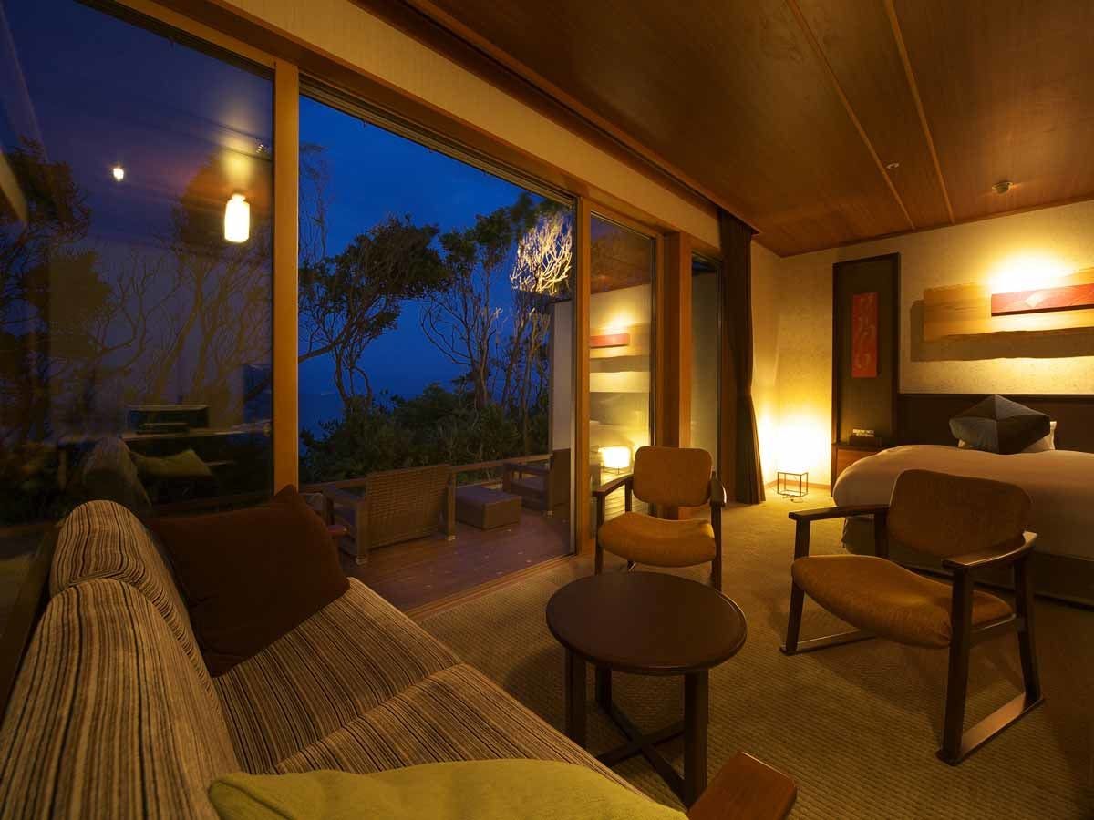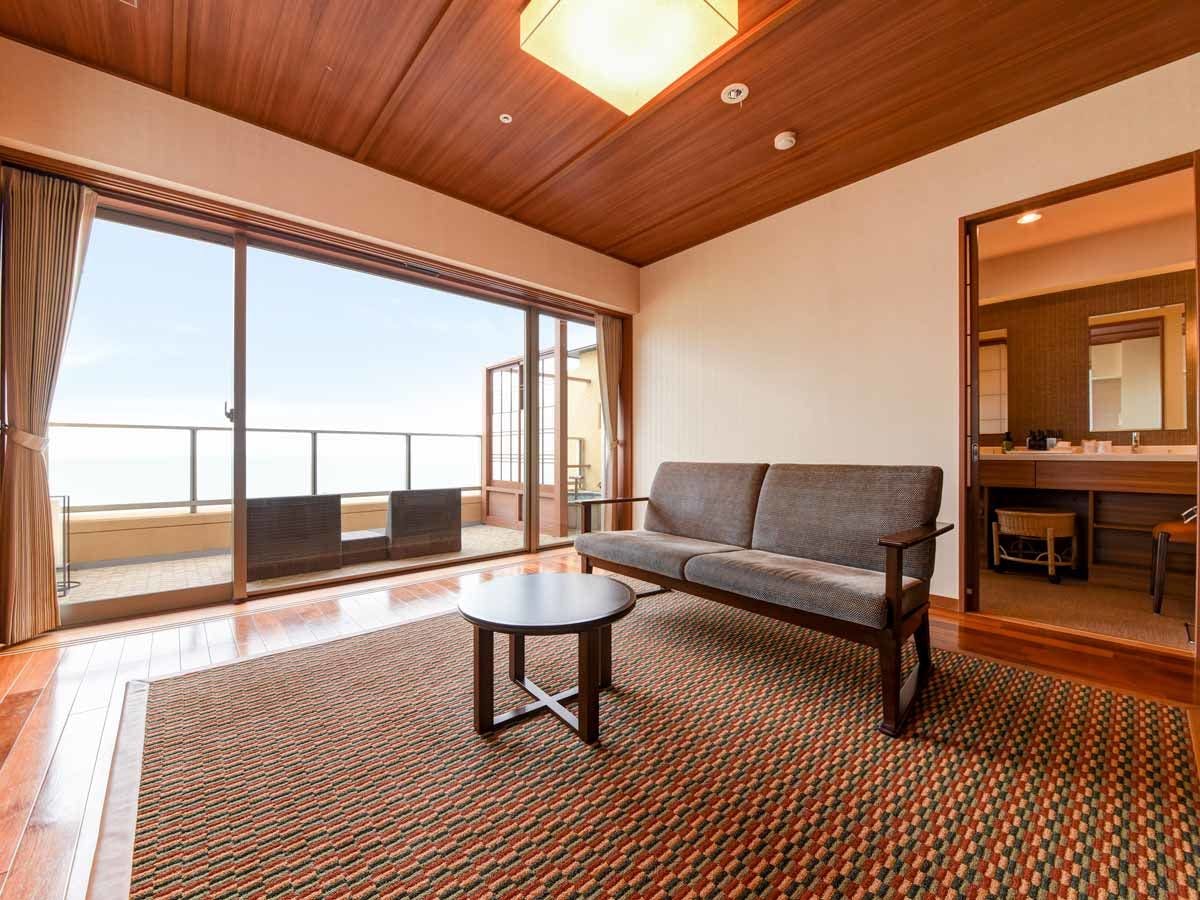 オーシャンビューの露天風呂付客室。眼前には雄大な太平洋が広がり、ゆとりの58平米和洋室は3名様までがベッドでお休みいただけます。