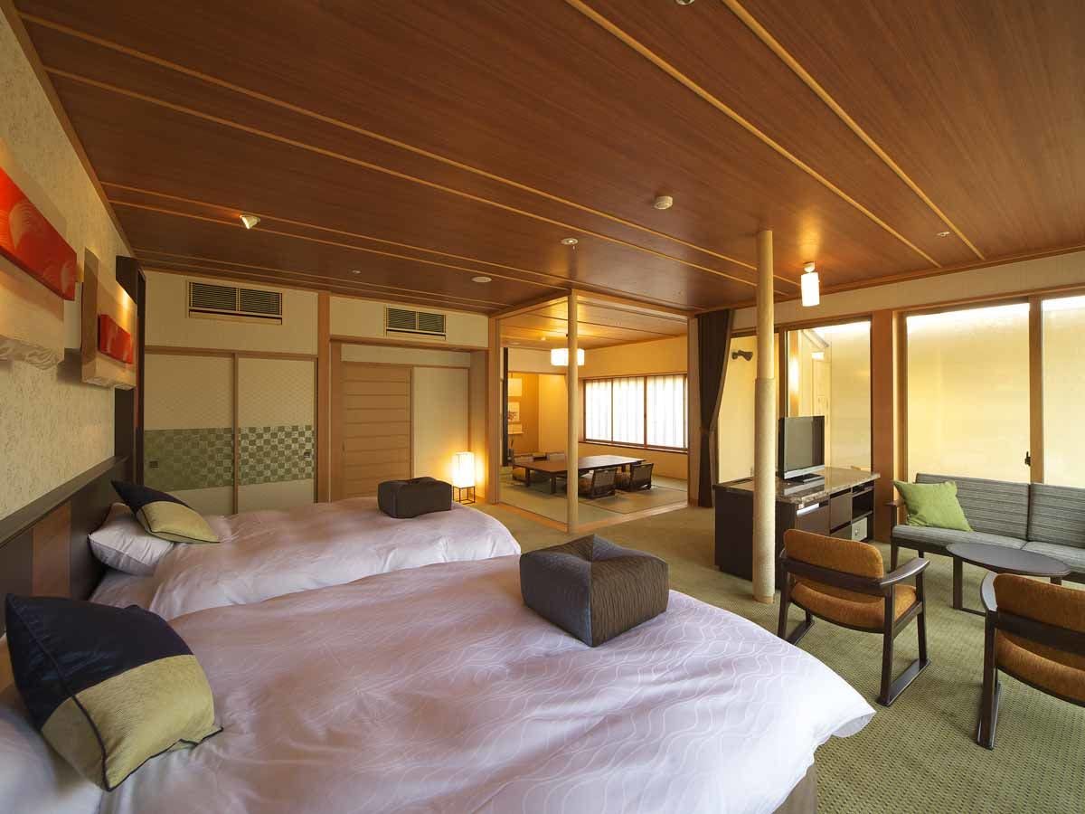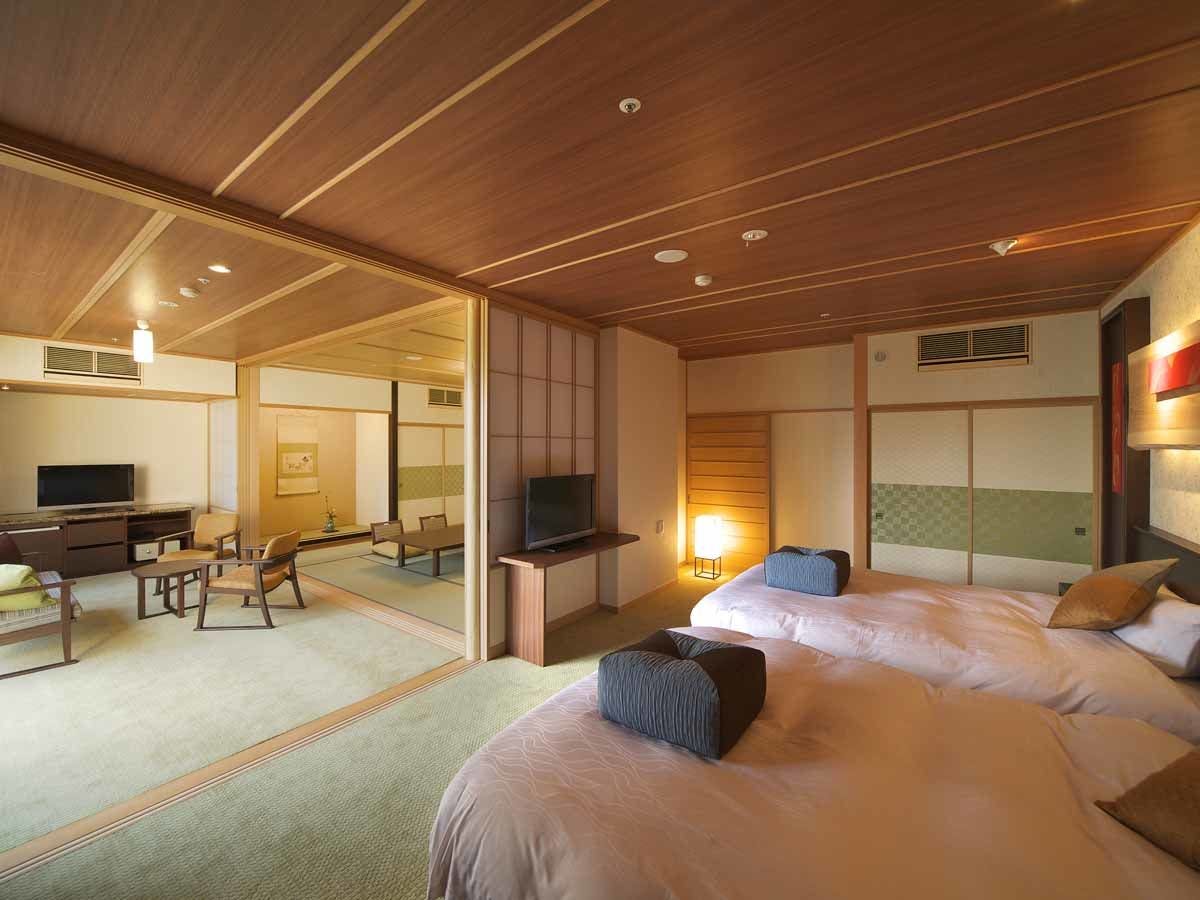 海を臨む露天風呂と和室12.5帖と洋室2ベッドを備えた広がりあるお部屋です。コネクティングルーム機能も備えておりますので、ご希望に応じて更なる空間が出現します。落ち着きの中に広がる広いスペースが特徴です。