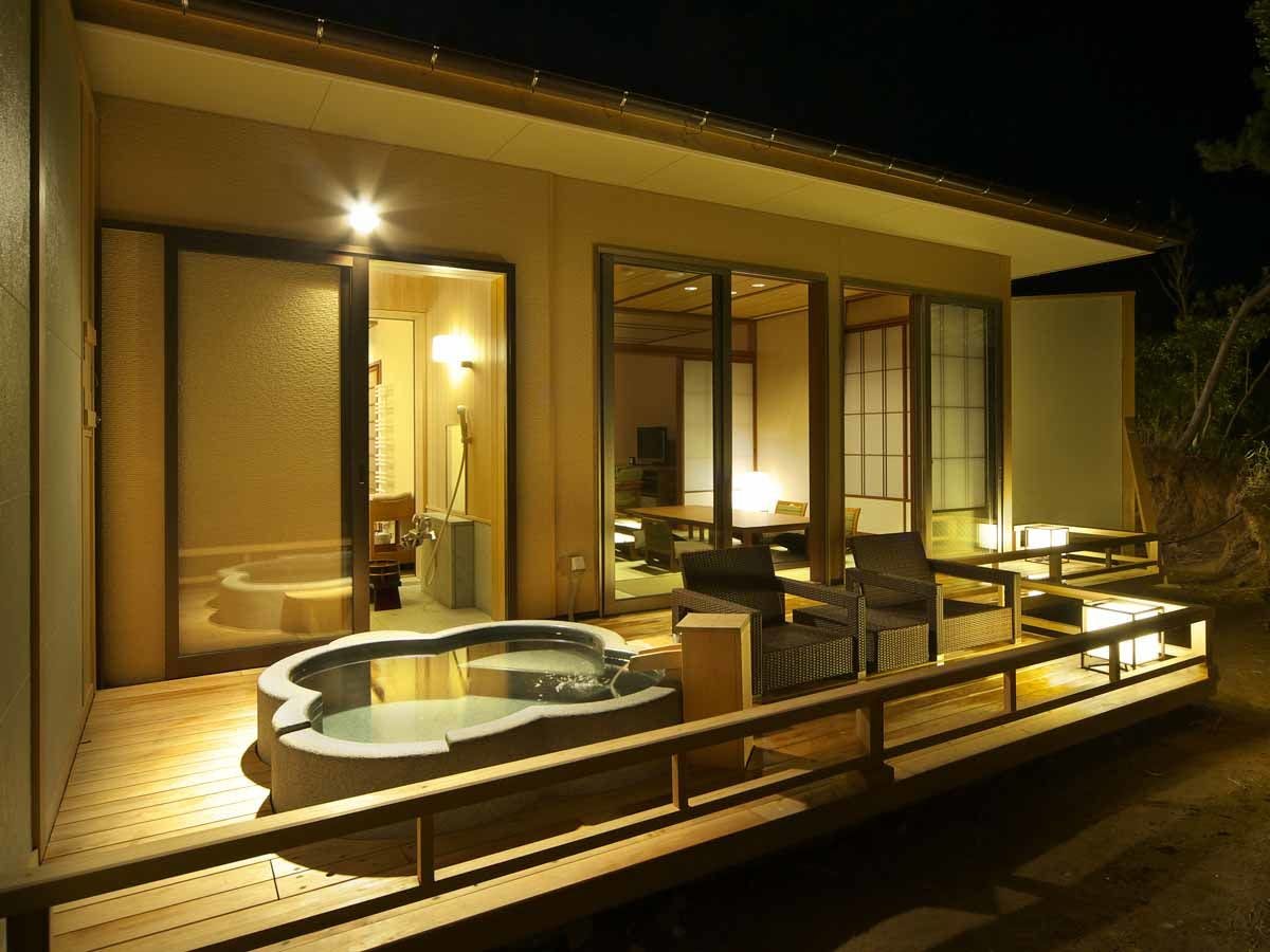 落ち着いた和室10帖に和リビングスペースが10帖続く寛ぎの空間です。テラスより仰ぐ夜空の星のまたたきは今宵の良き夢を予感させます。露天風呂は檜の造りです。