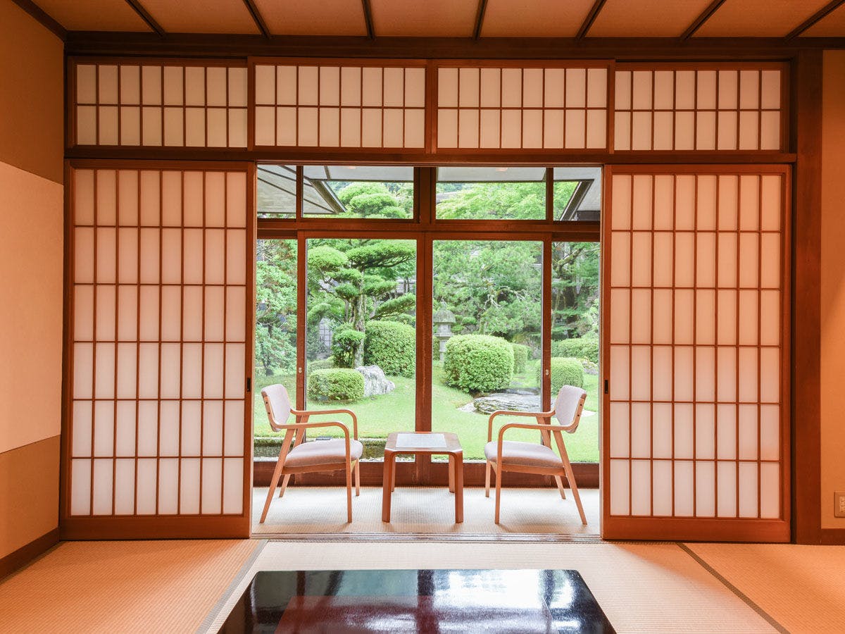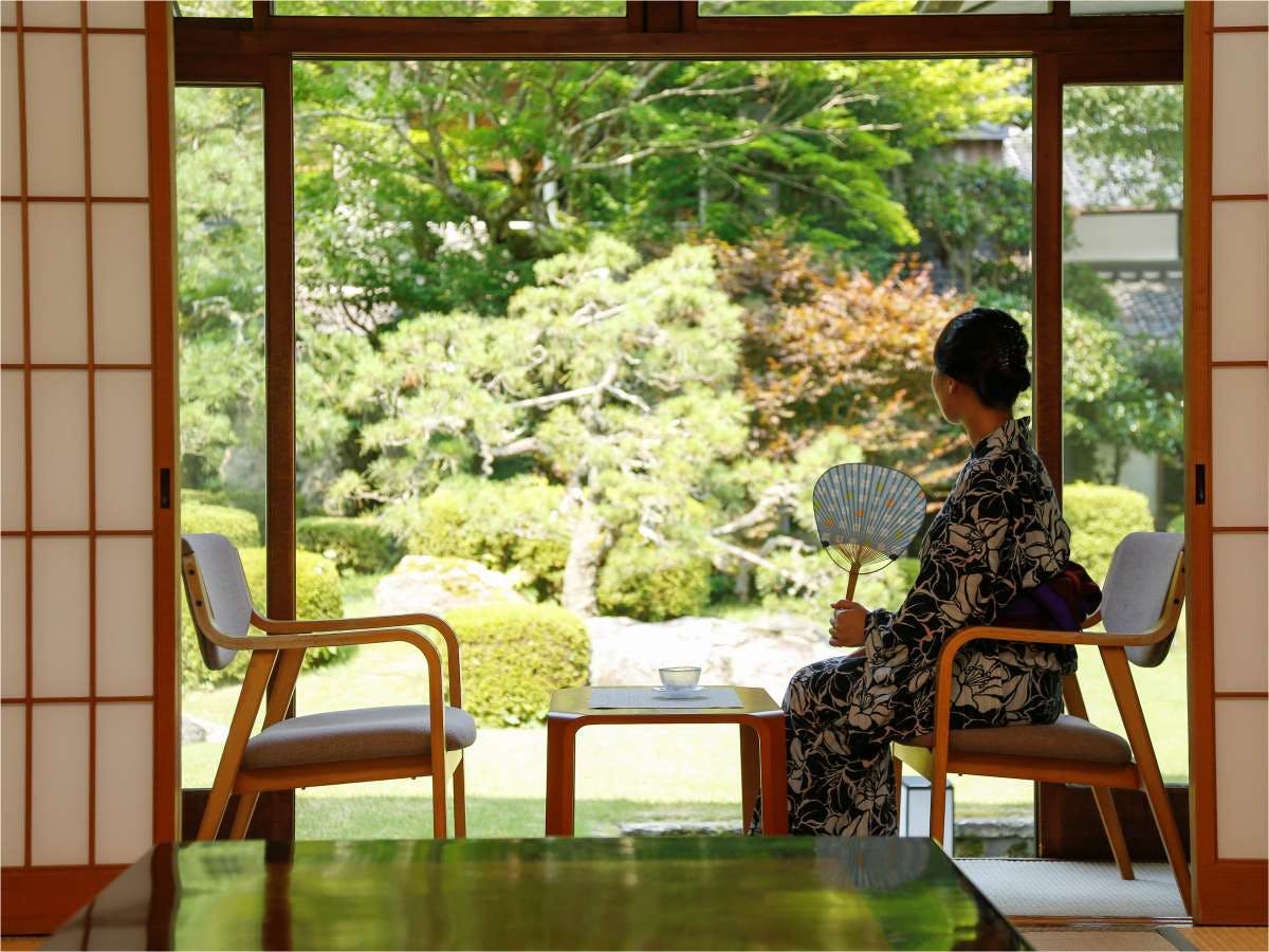 客室は庭園を囲むように配されているため、新緑に紅葉、雪景色と四季折々の姿が愉しめる。