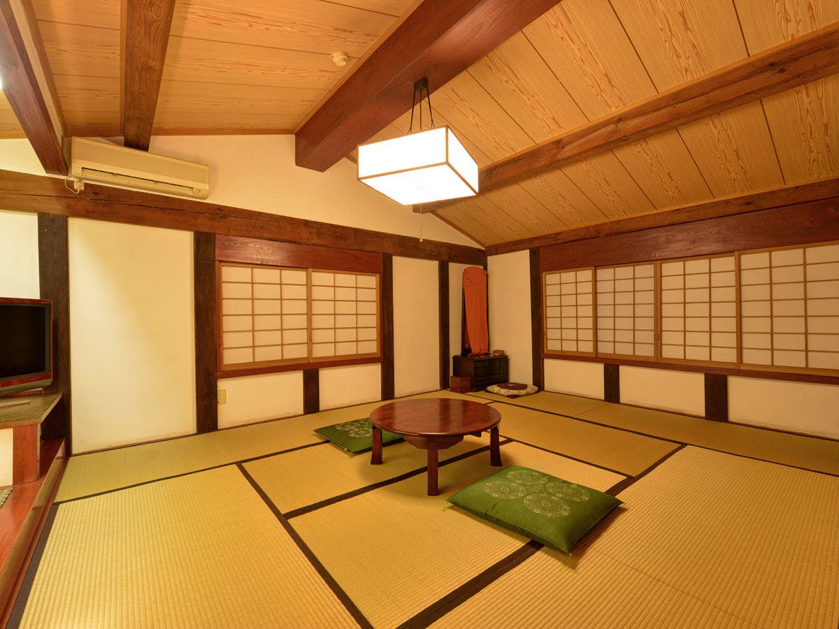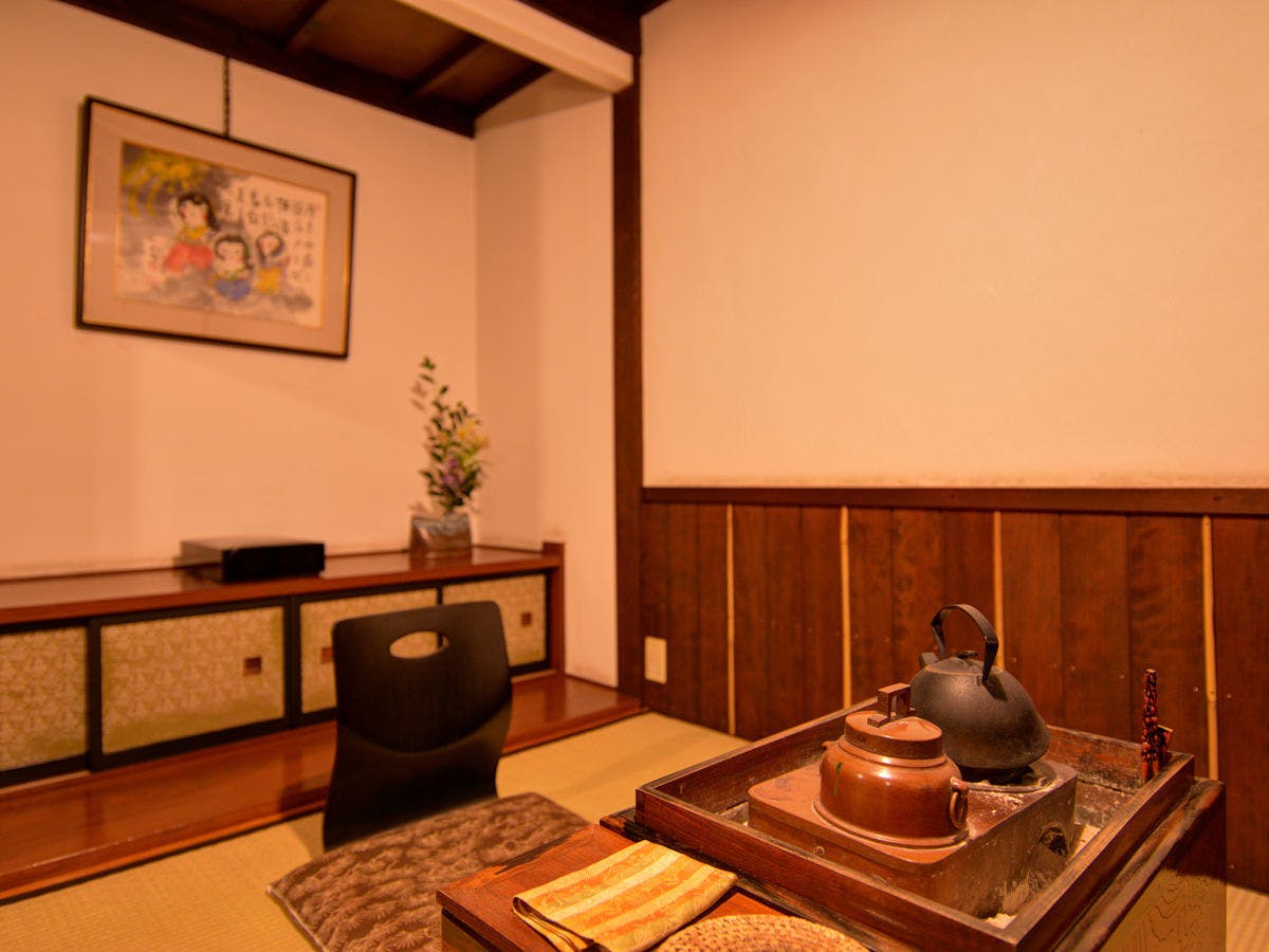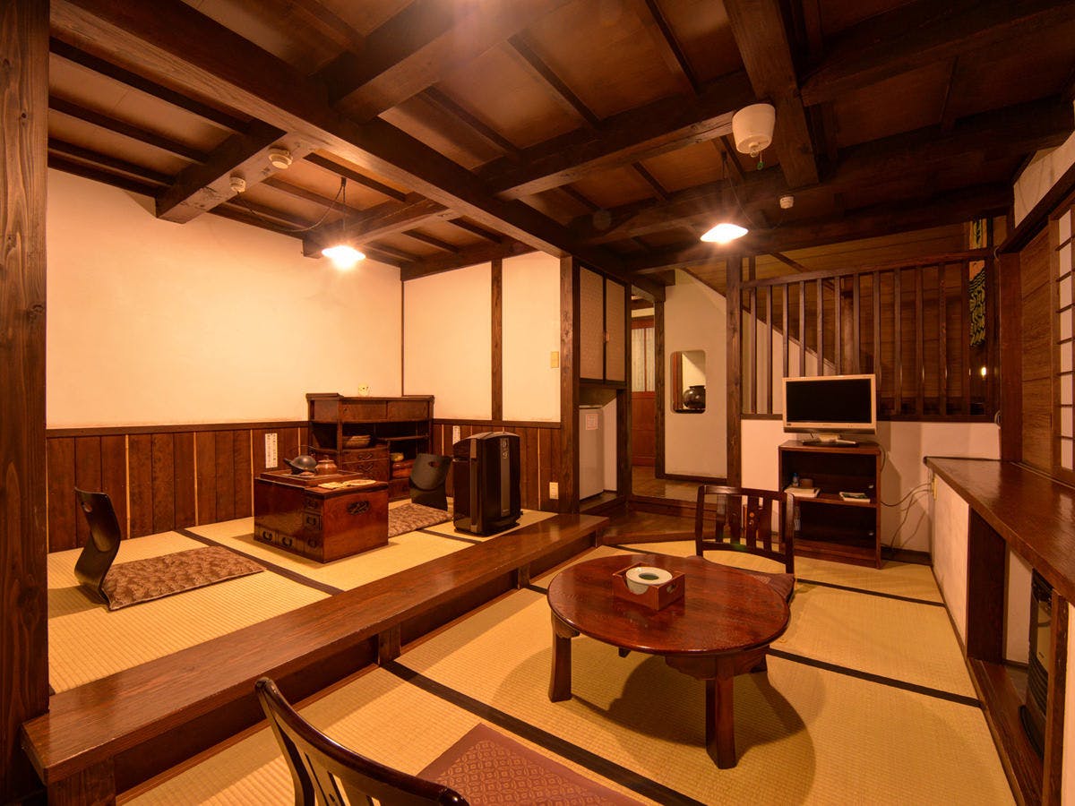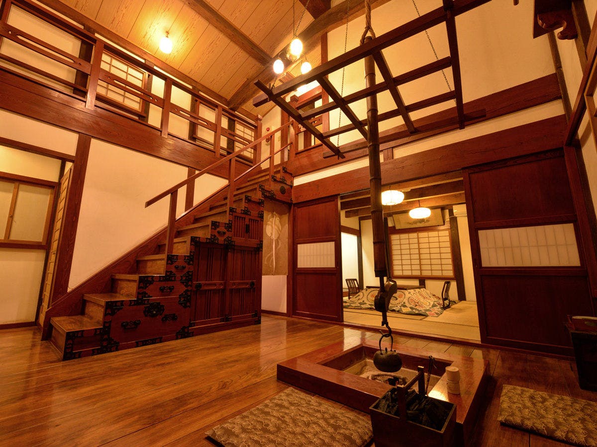 群馬県内のお屋敷にあった蔵を譲り受け、移築・改装した【壱の蔵】。メゾネットタイプの広々としたお部屋で上下に和室がございます。 1階は段差が設けられた変化のあるフロアで、中央に据えられた長火鉢など歴史を感じさせる調度品が郷愁と浪漫を誘います。