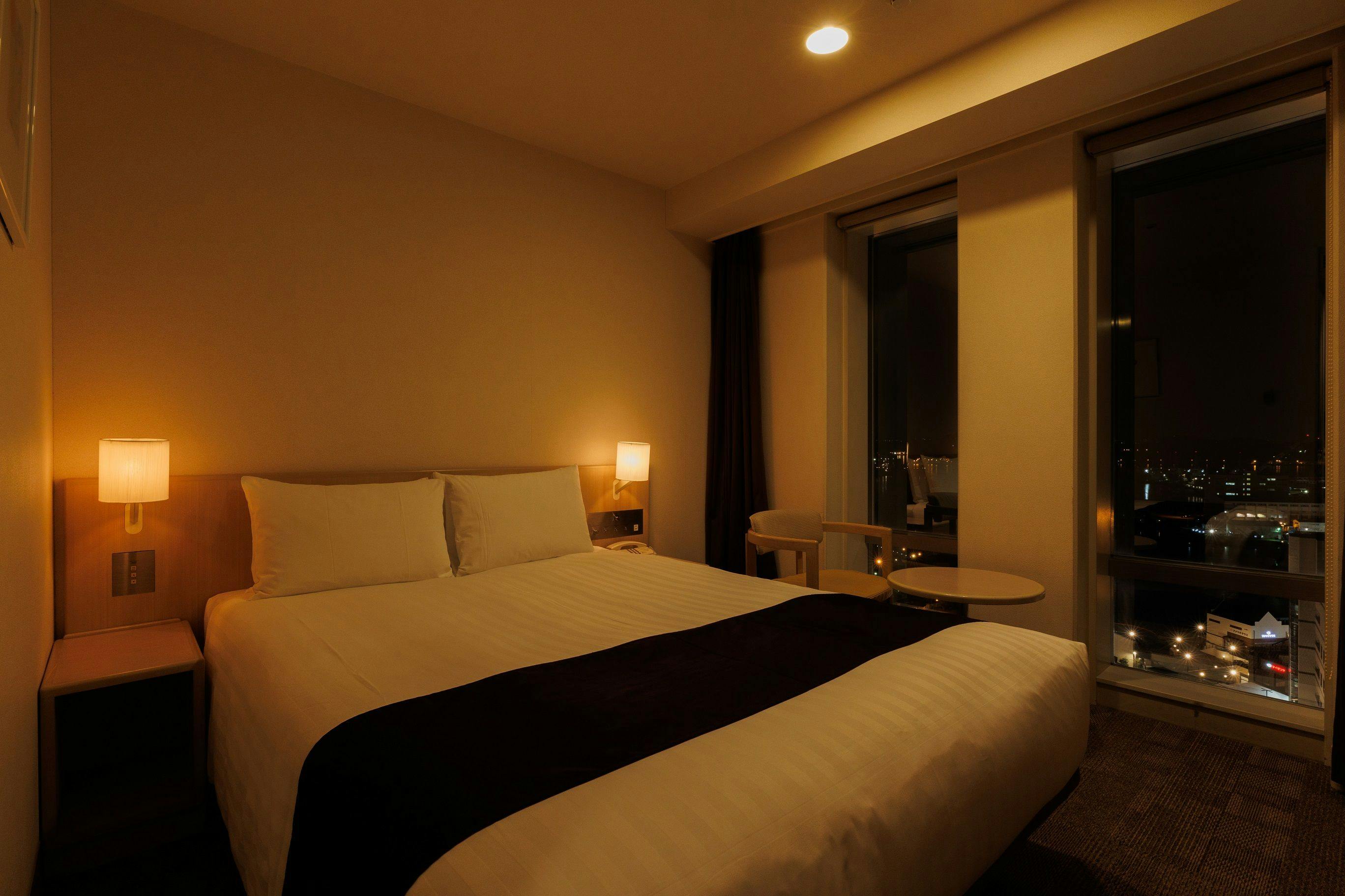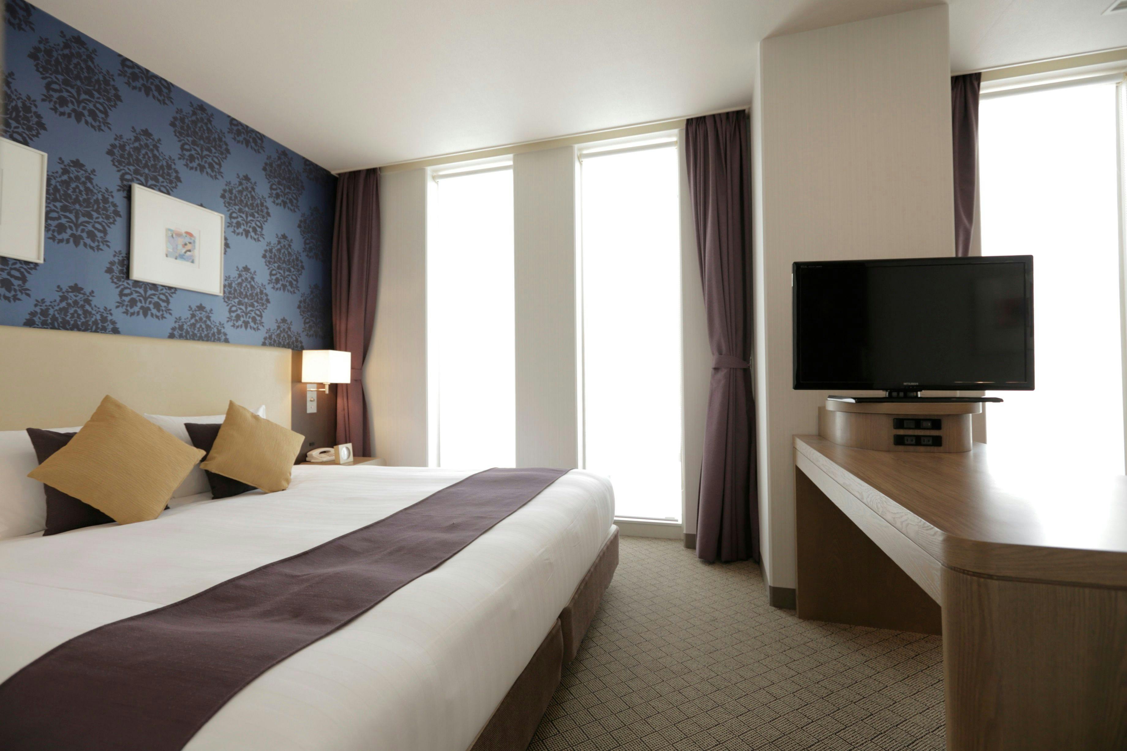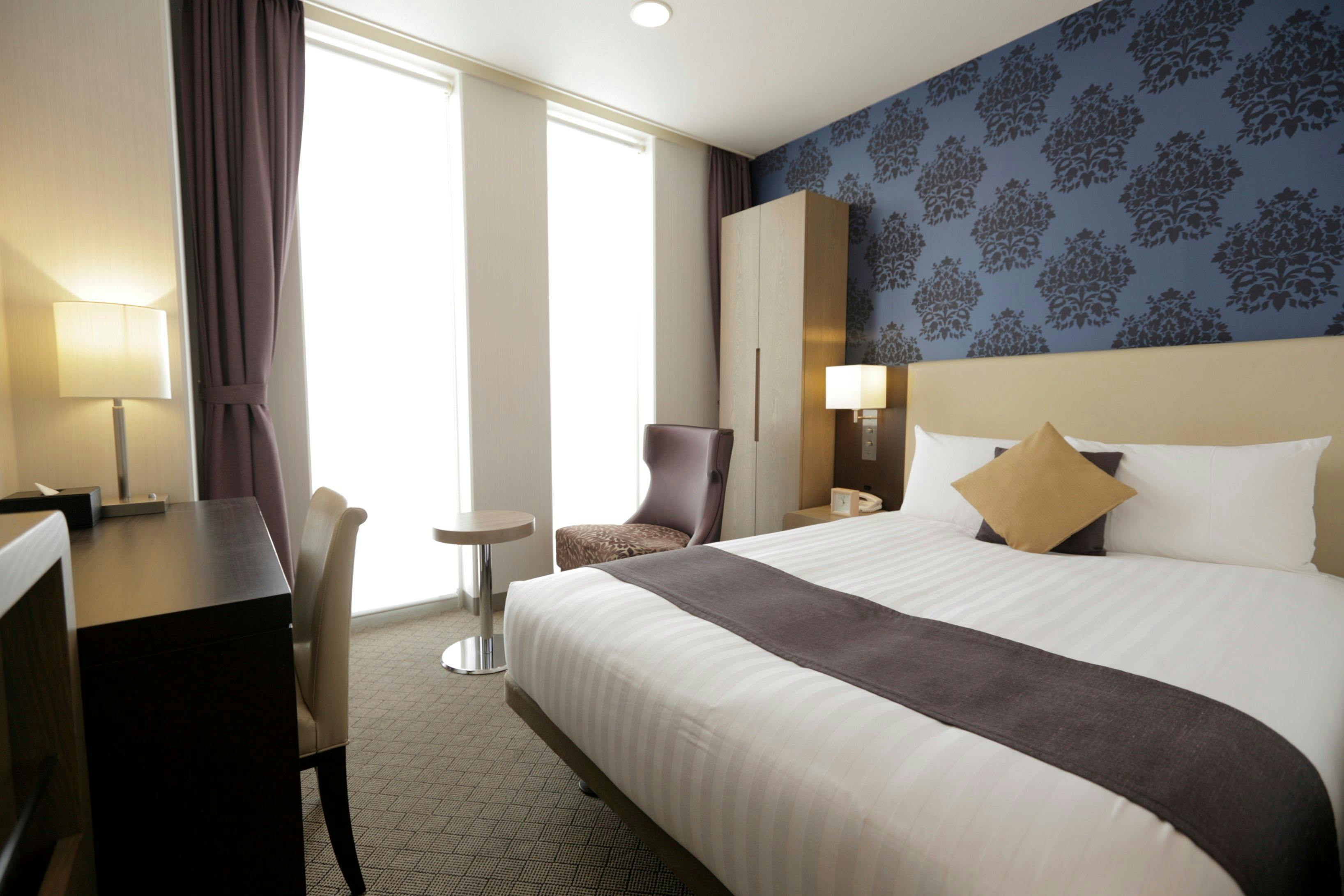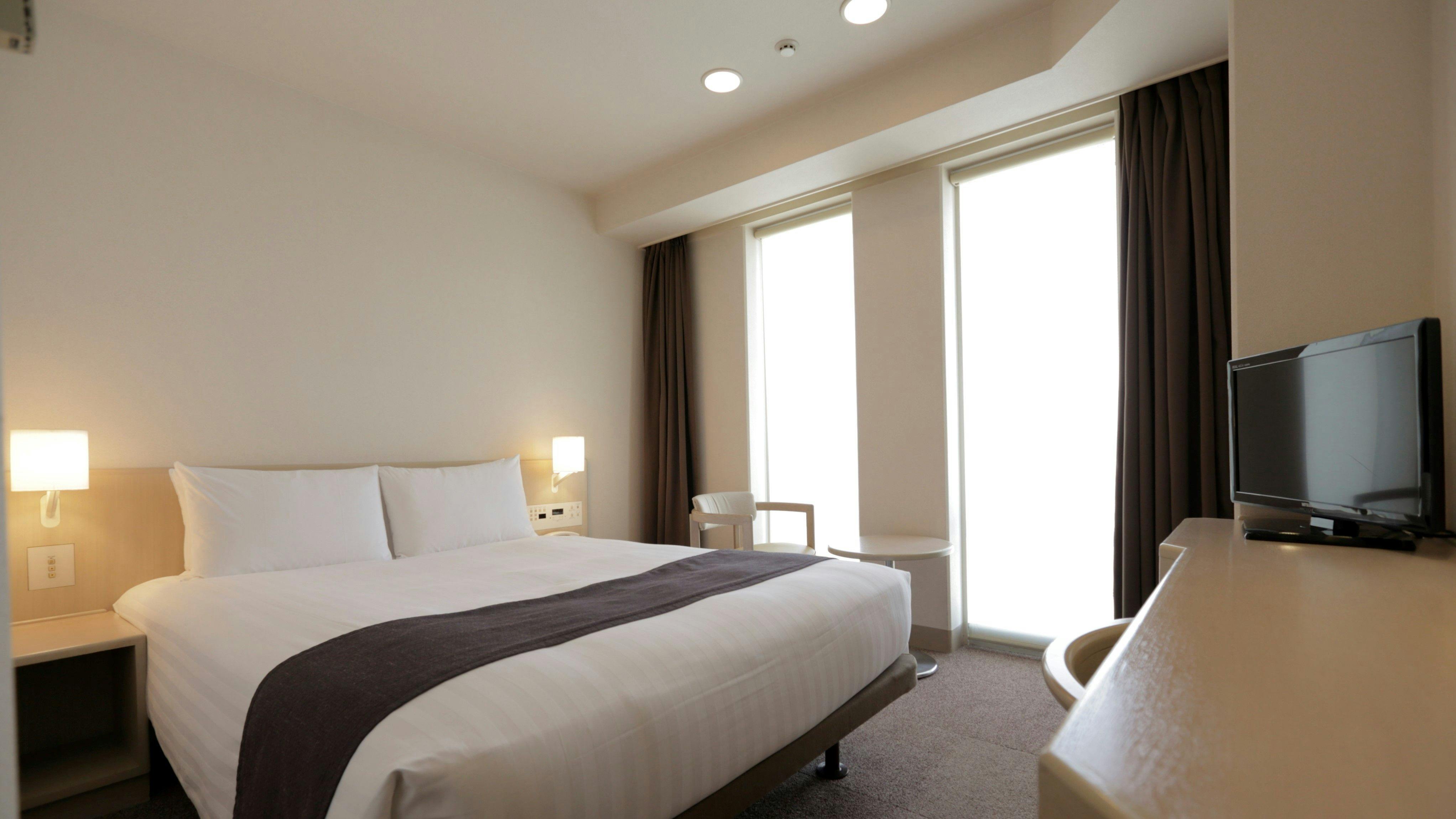 明るい内装のモダンな16平米のスタンダードルームです。全室禁煙の客室。窓からは美しい横須賀港の景色がご覧いただけます。快適なダブルベッド1台、衛星放送対応の液晶テレビ、オンデマンドのインハウスムービー、高速インターネットアクセスを完備しており、心ゆくまでお寛ぎいただけます。大人2名までご宿泊可能。添寝のお子様は1名様まで承れます。エキストラベッドはご利用になれません。