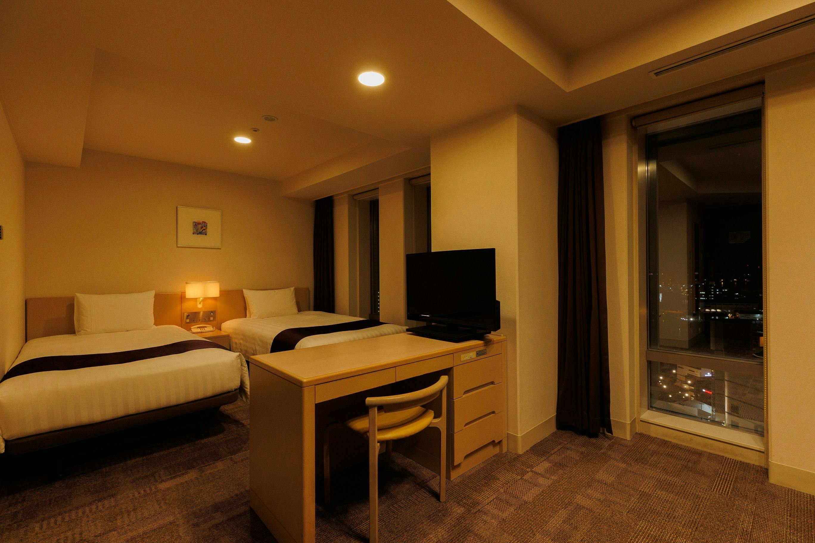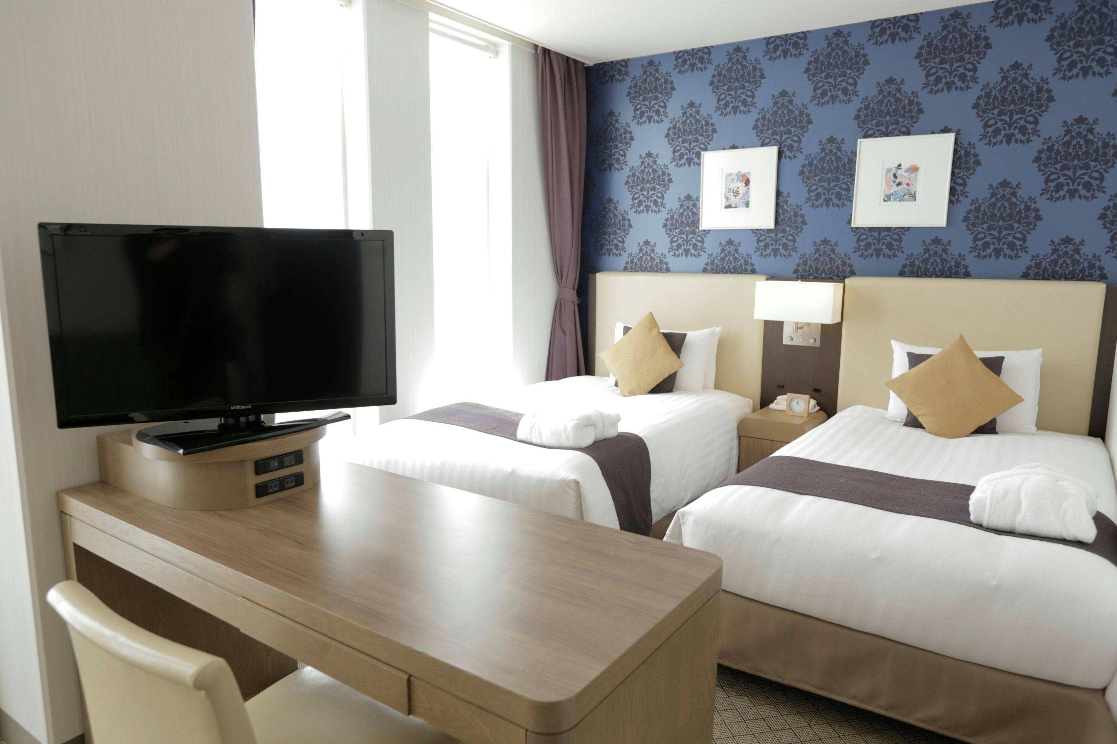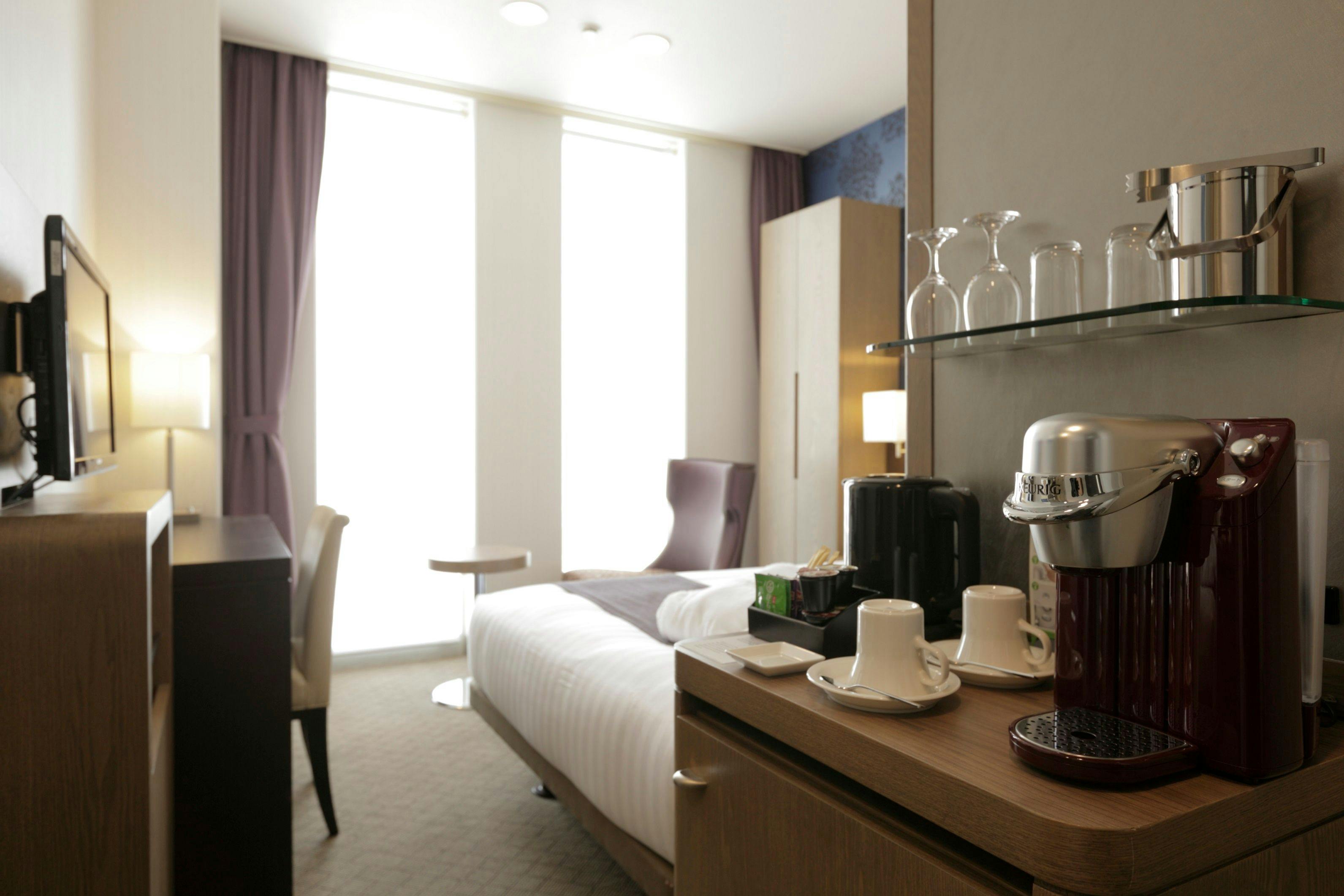 明るい内装のモダンな32平米のスタンダードルームです。全室禁煙の客室。窓からは美しい横須賀港がご覧いただけます。快適な2台のシングルベッドとソファ、衛星放送対応の液晶テレビ、オンデマンドのインハウスムービー、高速インターネットアクセス、また長期滞在に最適な電子レンジと大型冷蔵庫を完備しております。ソファベッドを使用し、大人3名までご宿泊可能です。添寝のお子様は2名様まで承れます。