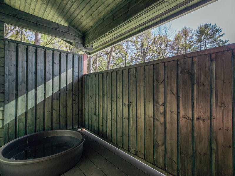 2017年12月にオープンの全5棟 ”プレミアムログ” 定員4名のハイクラスコテージです。「コテージの中で森林浴が・・・」木の香りいっぱいの清々しい雰囲気とテラススペースに設けられた信楽焼(しがらきやき)個室露天風呂が魅力です。ベッドはシモンズ社製、アメニティは「ZIRA(ジーラ)」、シャワーヘッドに「GROHE(グローエ)」を用いるなど、快適にお過ごしいただける空間になっております。