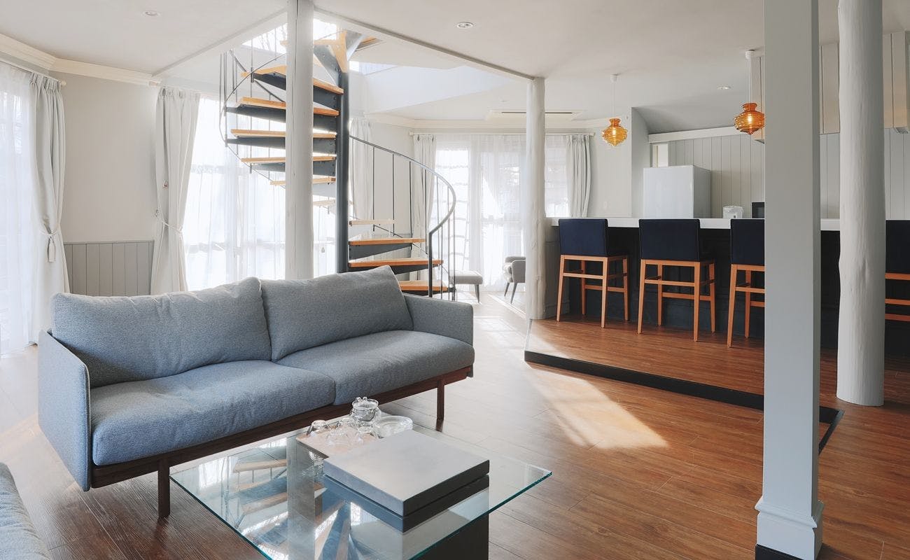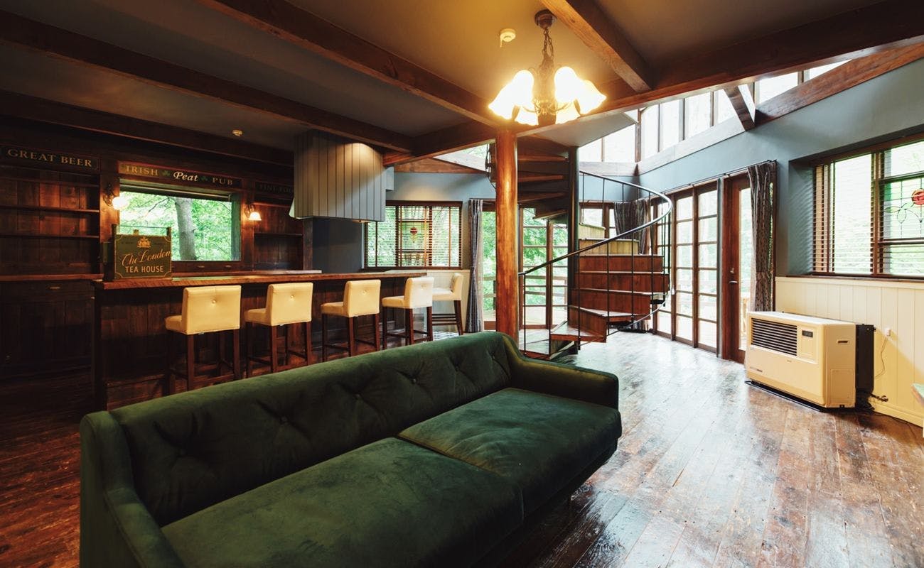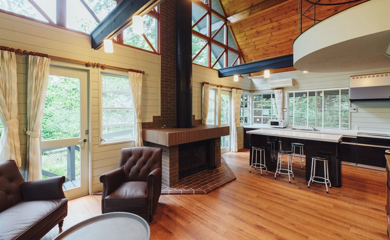 ”コテージの中でひなたぼっこ・・・” リビングにはくつろぎのカウチソファ、ガラス張りのインナーテラス、信楽焼(しがらきやき)個室露天風呂が魅力です。ベッドはシモンズ製で広々ダブル仕様、冬期は床暖房プラス憧れの薪ストーブ調のヒーターで癒し効果満点「1/fゆらぎ」に時間を忘れる非日常なリゾートステイを演出します。