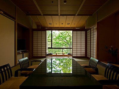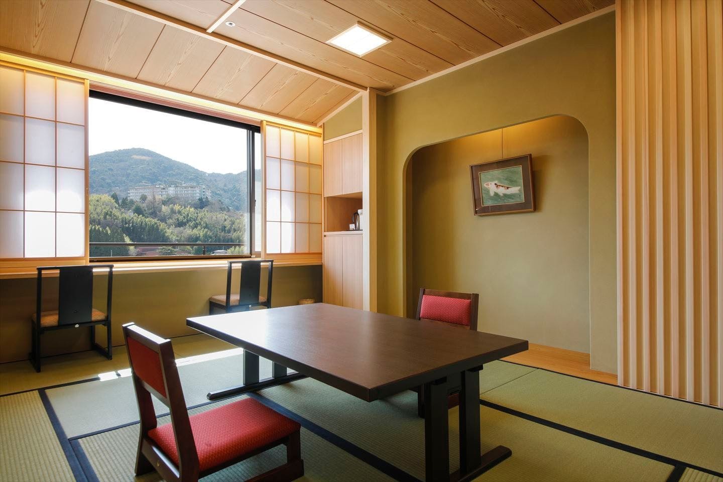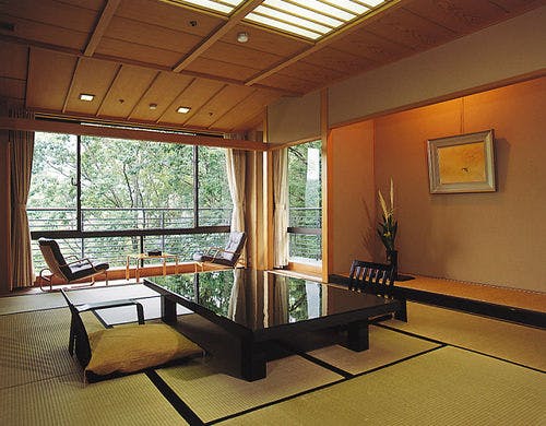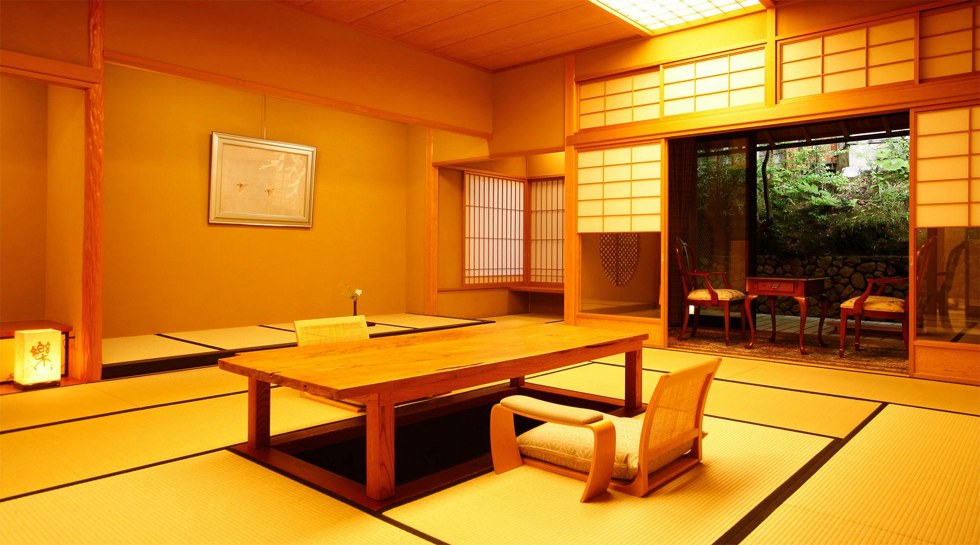 日本庭園を望む銀泉露天風呂・銀泉蒸し風呂付の和室でございます。