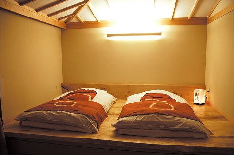 ベッドではなく、板間の上にお布団を敷いた和洋折衷の寝室。お布団は3枚まで敷けます。