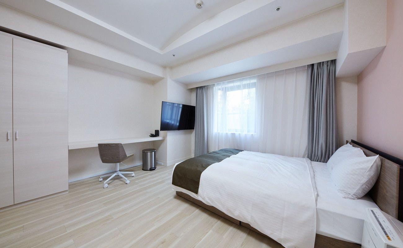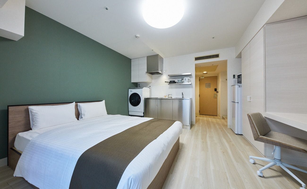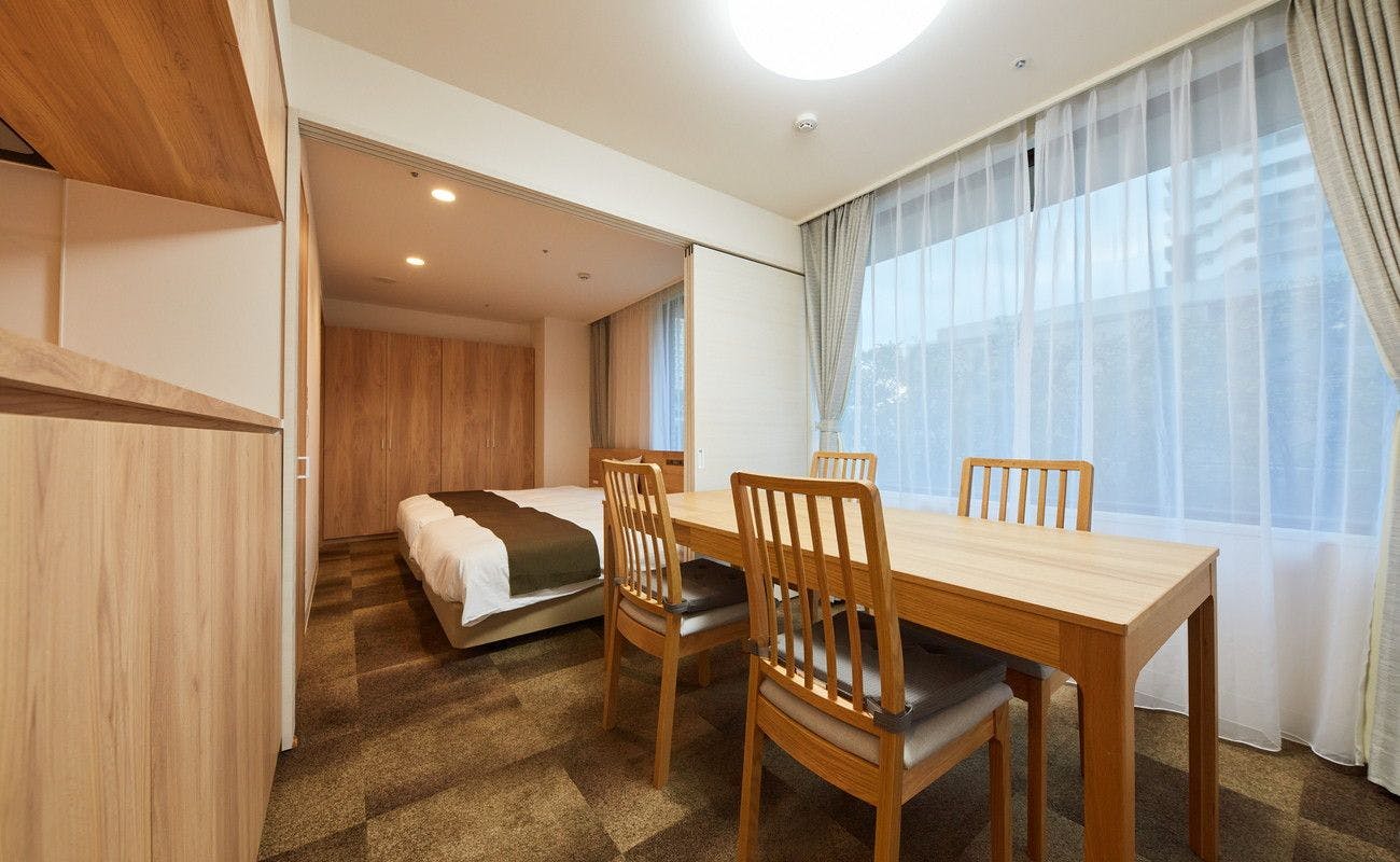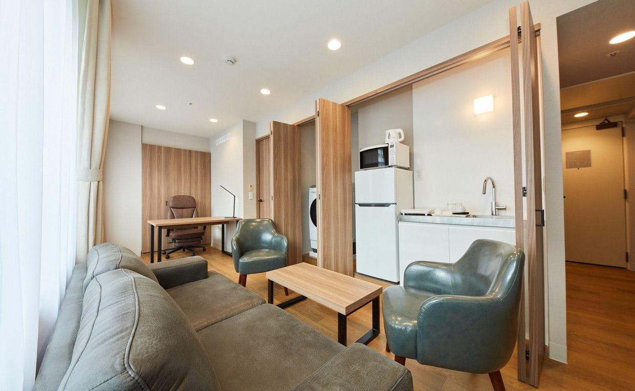 【全室16平米以上の広々客室】バス・トイレ・キッチン・生活家電がついた中長期滞在型客室とプレミアムサウナルームを新設しました。和洋中のレストランでシェフ特製のお料理をご堪能いただけます。
