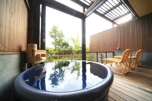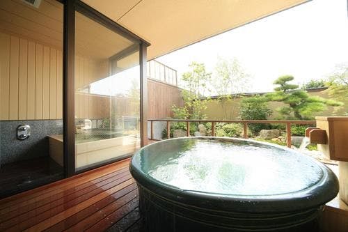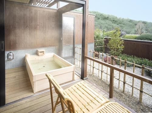 お食事は夕朝食共に個室をご準備いたします。館内に一部屋しかない特別な和洋室です。檜の内湯と信楽焼の特製露天風呂は互いにウォークイン出来ます。この部屋専用に設えられた日本庭園をご覧になりながらの入浴や、広々としたベッドルームの造りは、多くのリピーター様にご満足頂いております。お部屋風呂でもお楽しみいただける薬湯をご準備しております。美顔器のようなシャワーヘッド「ミラブルplus」を設置しております。