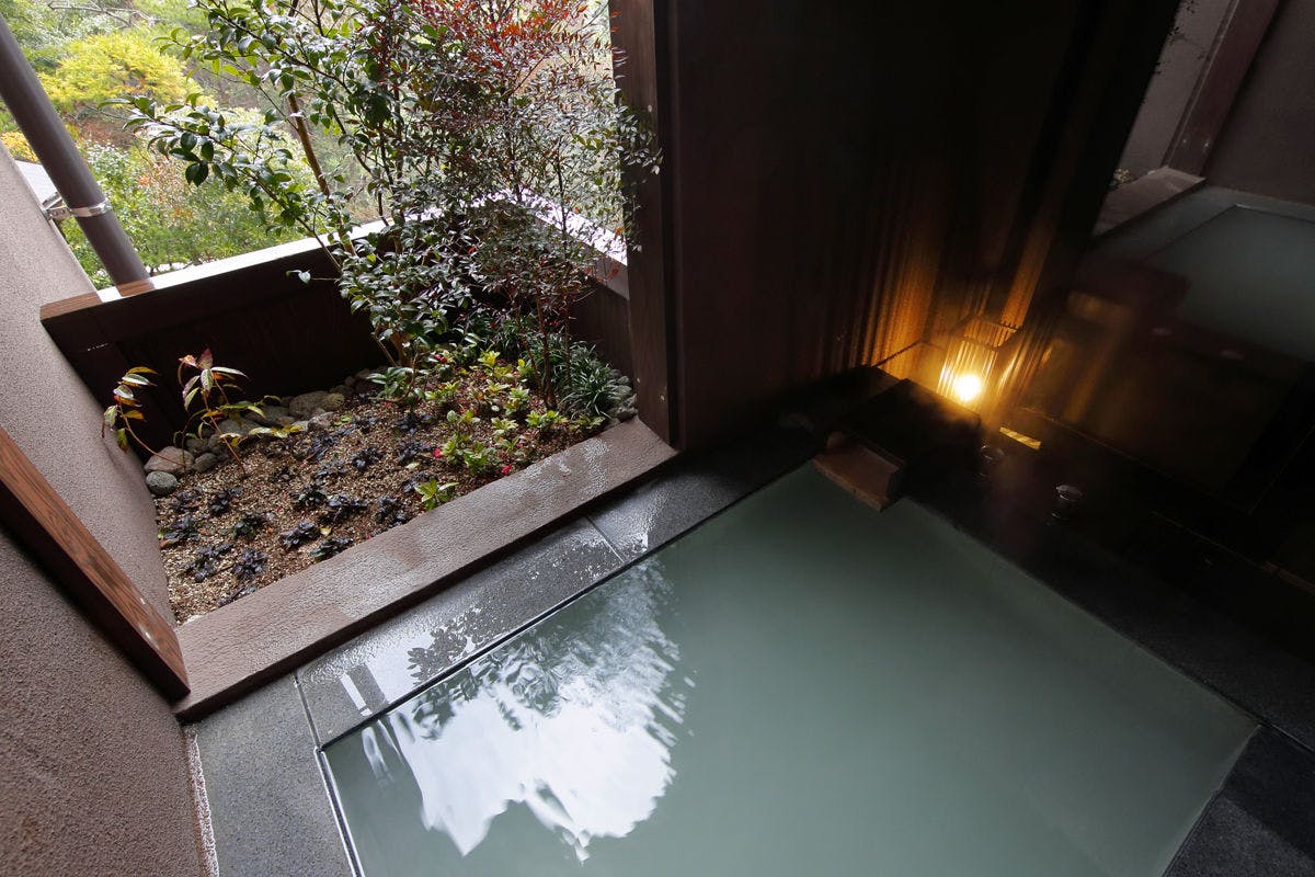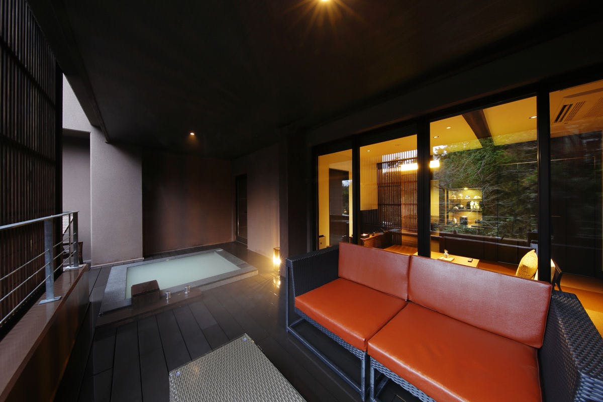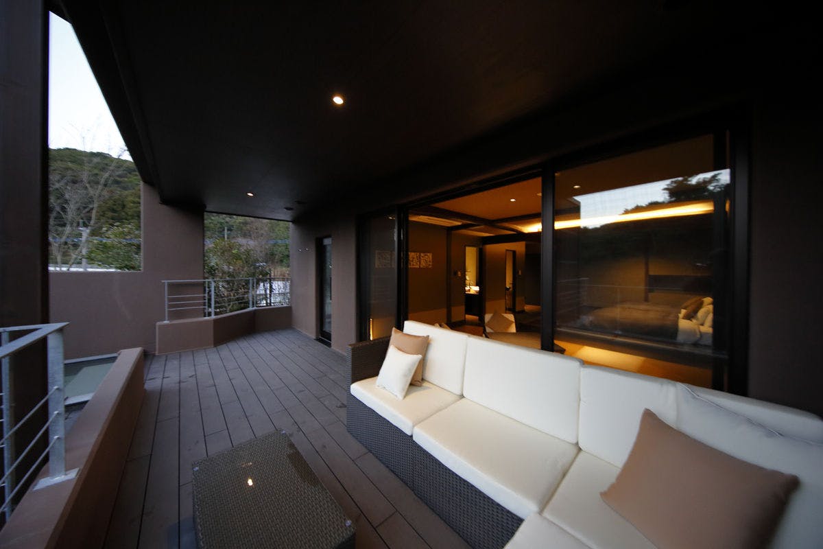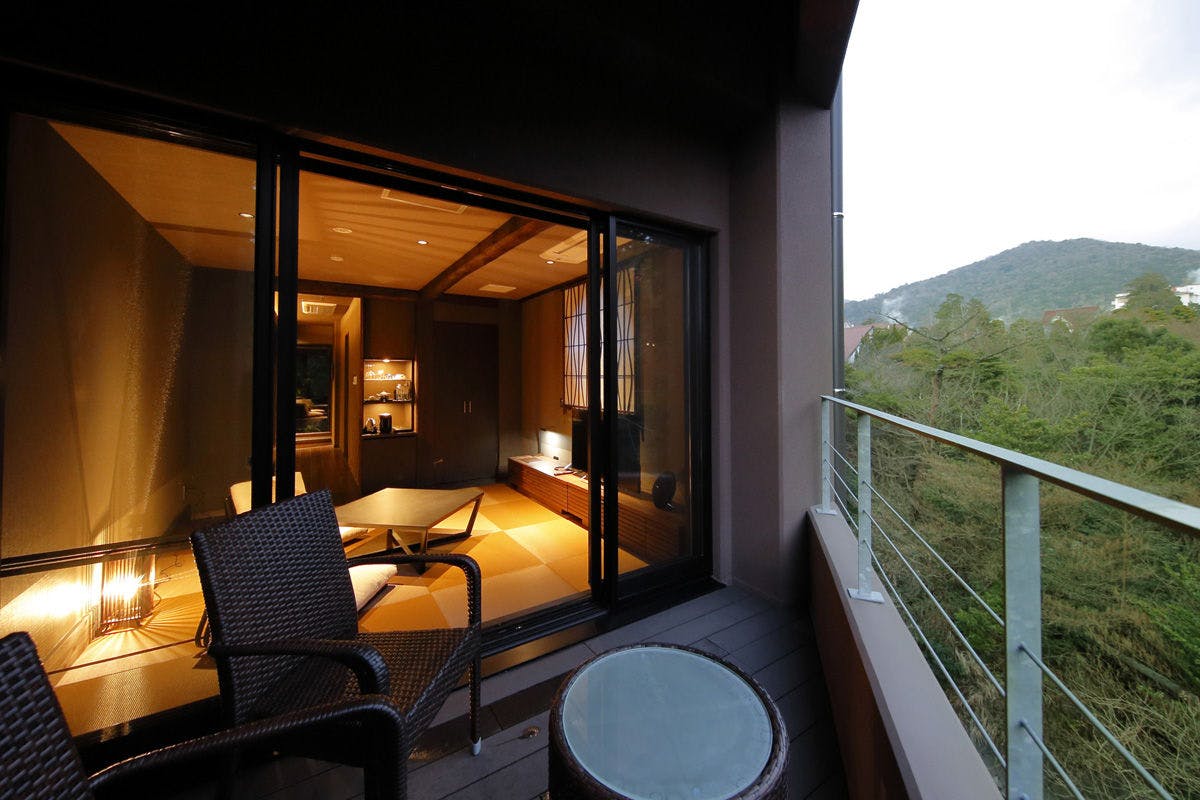雲仙福田屋に2017年にOPENした別館「山照-別邸-」。ラグジュアリーな源泉掛け流し露天風呂付の7タイプの客室。