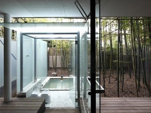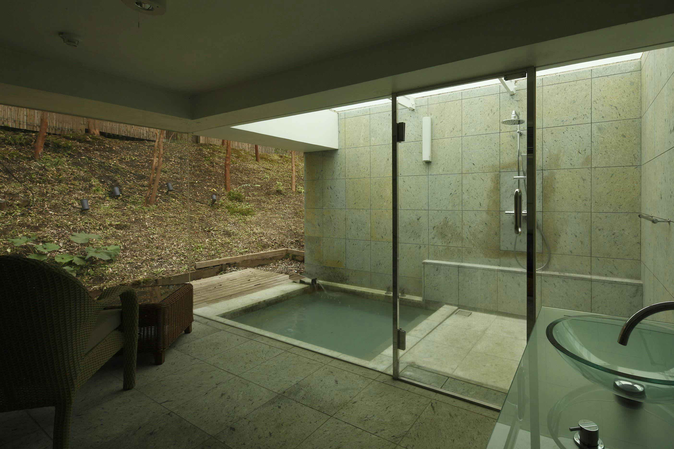 水盤を降りるとリビング付のお洒落な露天風呂が。