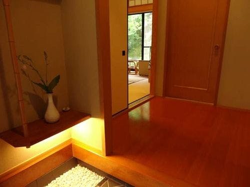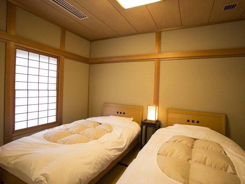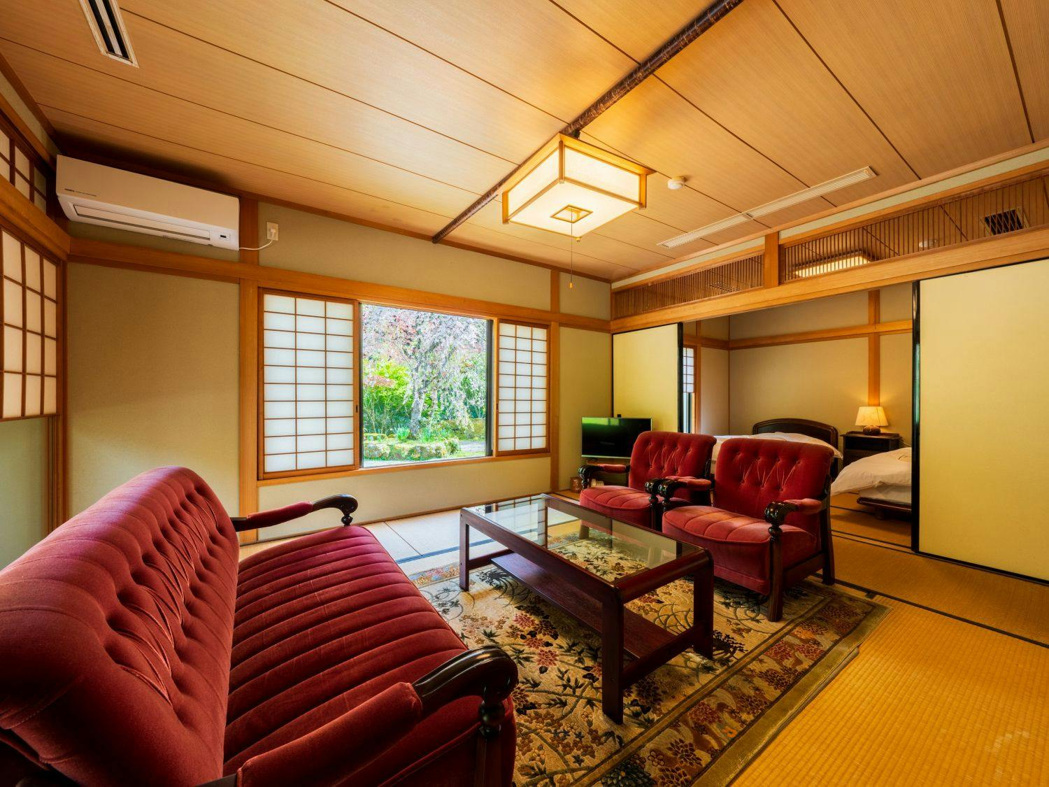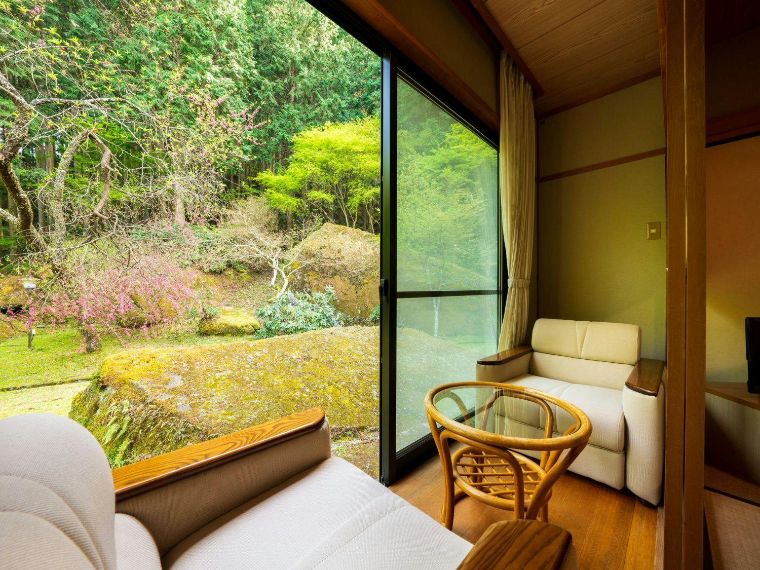 和洋室【バス・トイレ付】和室にソファとテービルを置き、寝室は2台のベッドを設置致しております。客室からは、巨石・奇岩、珍しい山野草が眺められ、四季それぞれの美しさを楽しむ事が出来ます。※大自然に囲まれているため夏場、夜に窓を開けますと灯りに誘われて虫が部屋の中に入ってきます。苦手な方は、夜に網戸を開けないようお願いします。