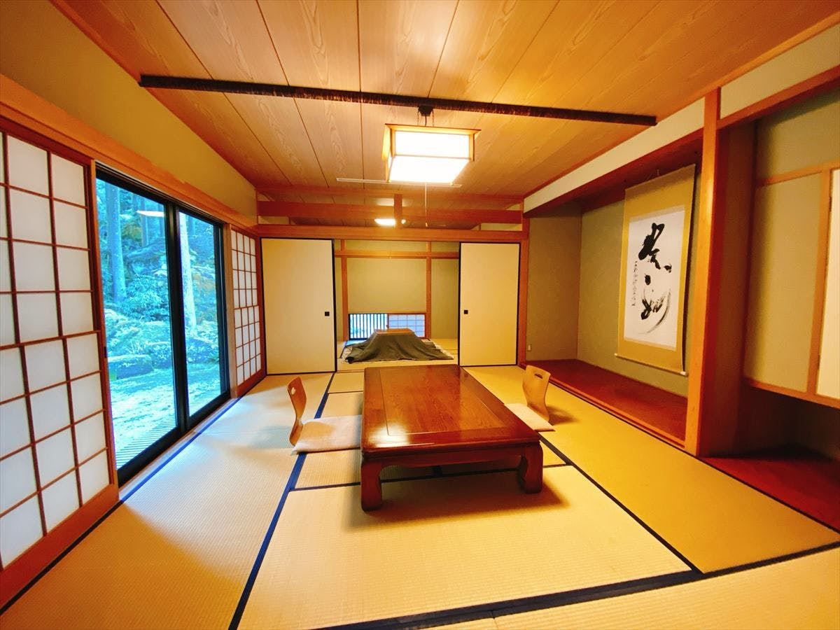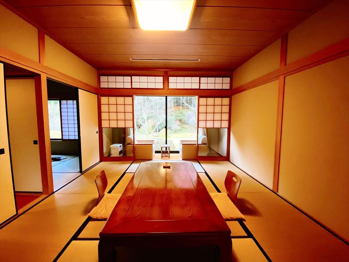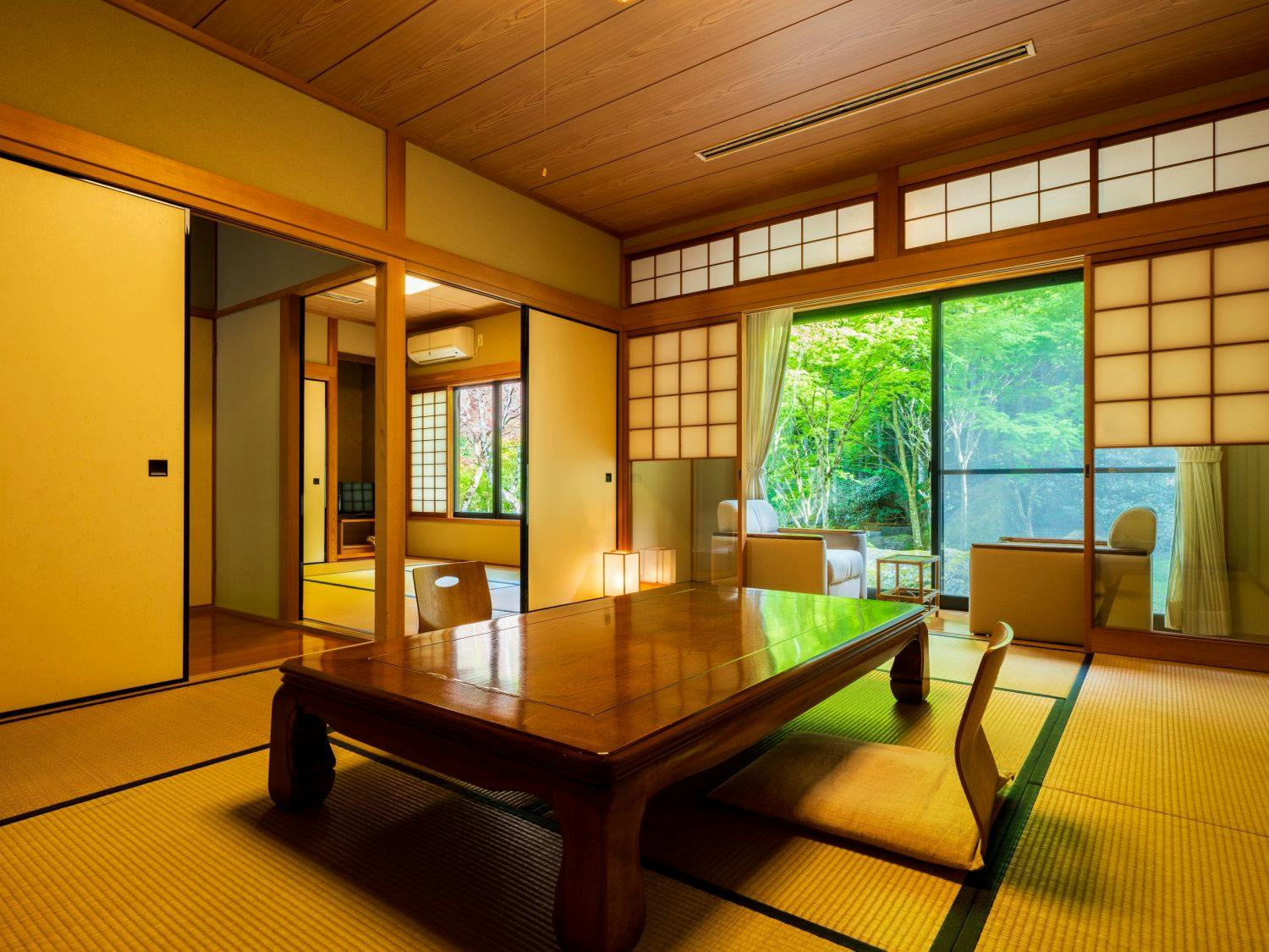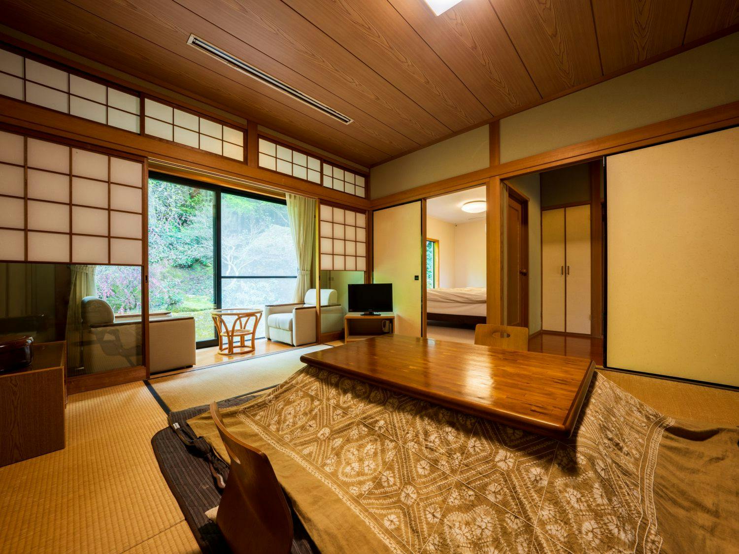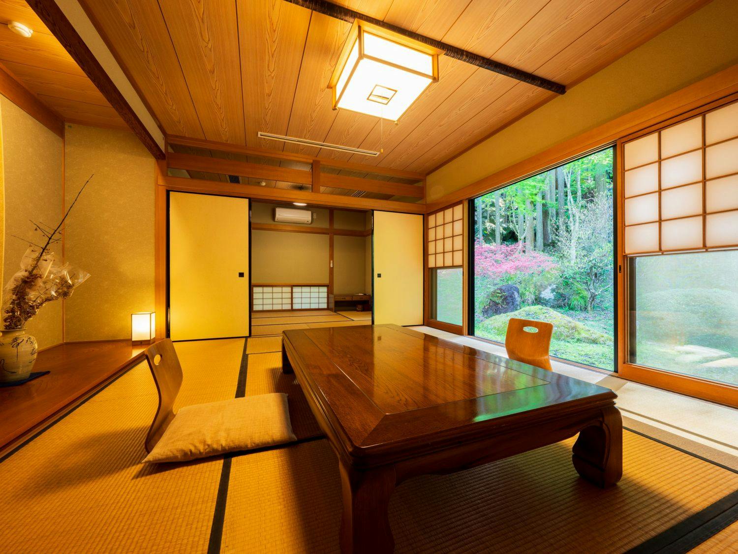 4名対応のお部屋です。耶馬溪を借景とした専用庭園を望む50平米(和室+ベッドルーム)のゆったりとした造りの離れ和洋室です。敷地内にございます、手入れされた中庭を囲むように建てられています。客室からは、巨石・奇岩・珍しい山野草が眺められ、四季それぞれの美しさを楽しむ事が出来ます。お部屋はバス・ウォシュレットトイレを完備し専用の浴衣・作務衣をご用意しております。