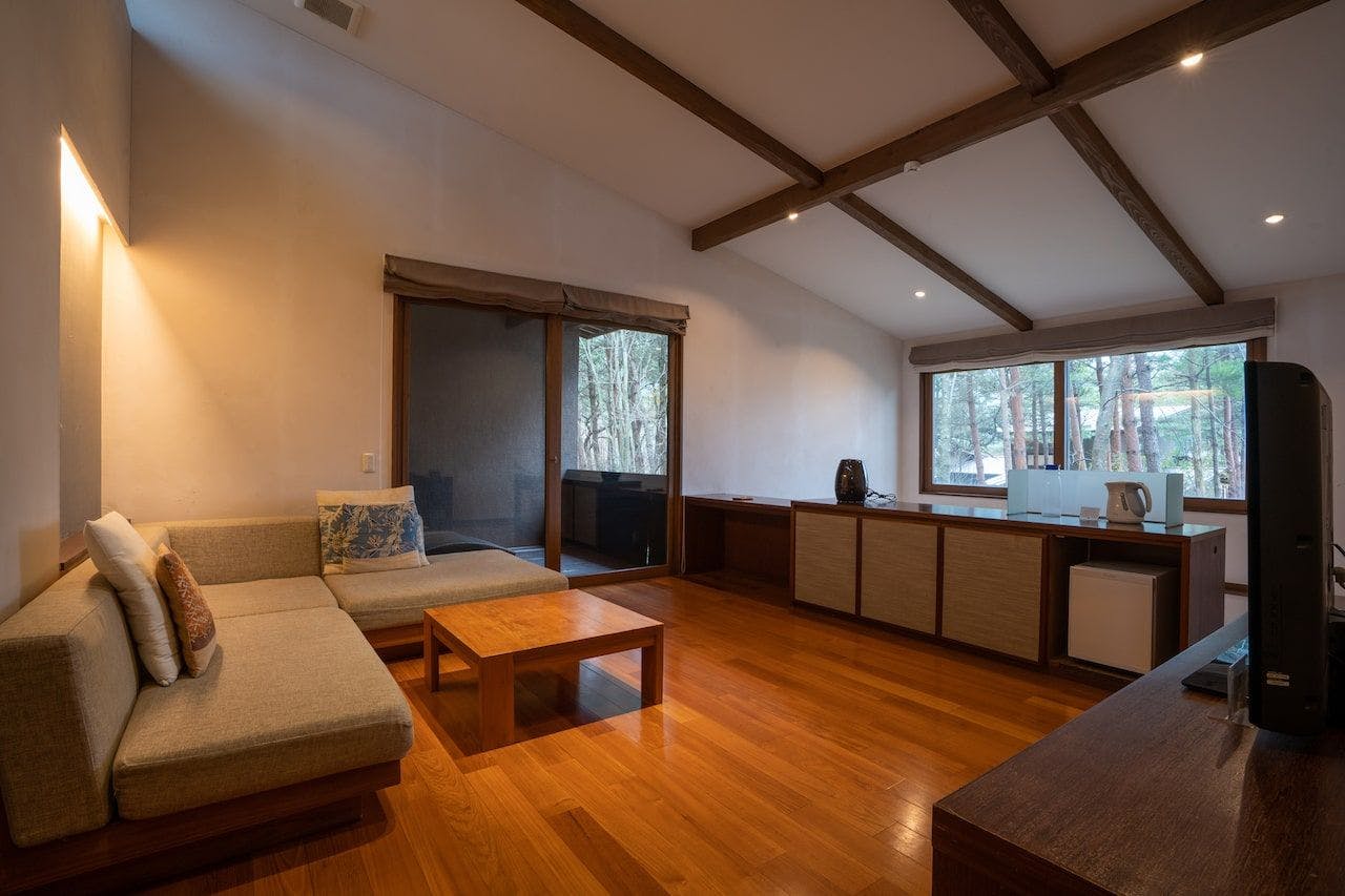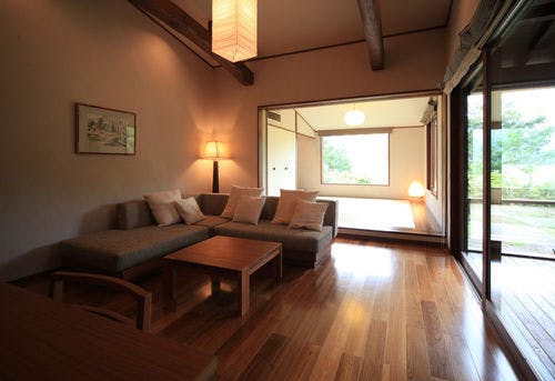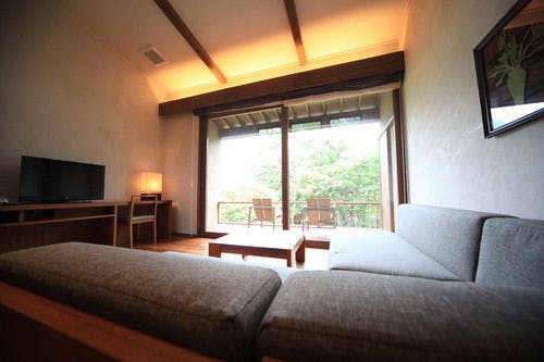 特別室別館 - BEKKAN -たまには、自分にご褒美を。別館はそんな思いを込めてつくらせて頂きました。この壮大な山々に囲まれた九重の真ん中で、最上級の大自然を贅沢を堪能して頂きたい。敷地は164平米有り、窓からは自然を独り占めしたかのような壮大な景色が見渡せます。