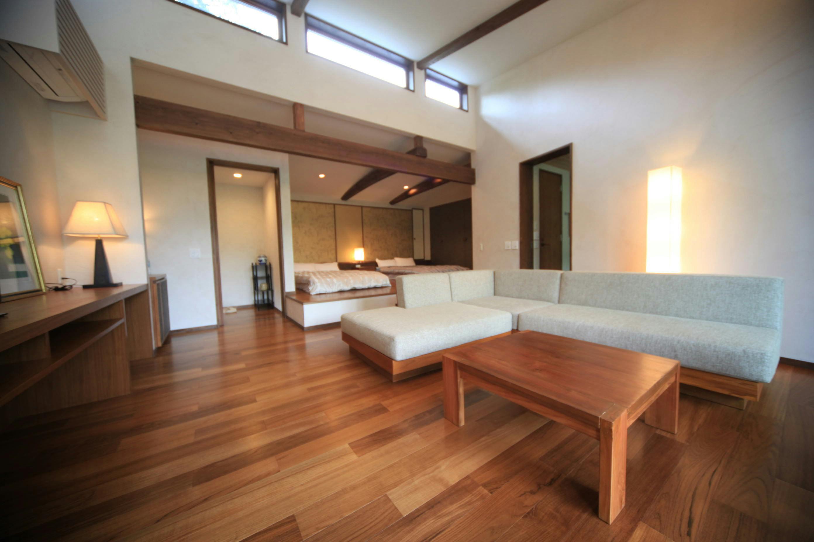 鴇- toki -リビングから階段を降りると寝室というモダンな造りの客室です。高窓から眺める、木、雲、月、星は一枚絵のよう。部屋奥の半露天風呂からは、湿原や硫黄山の風景が臨めます。