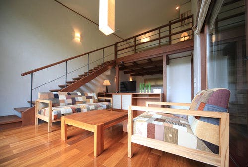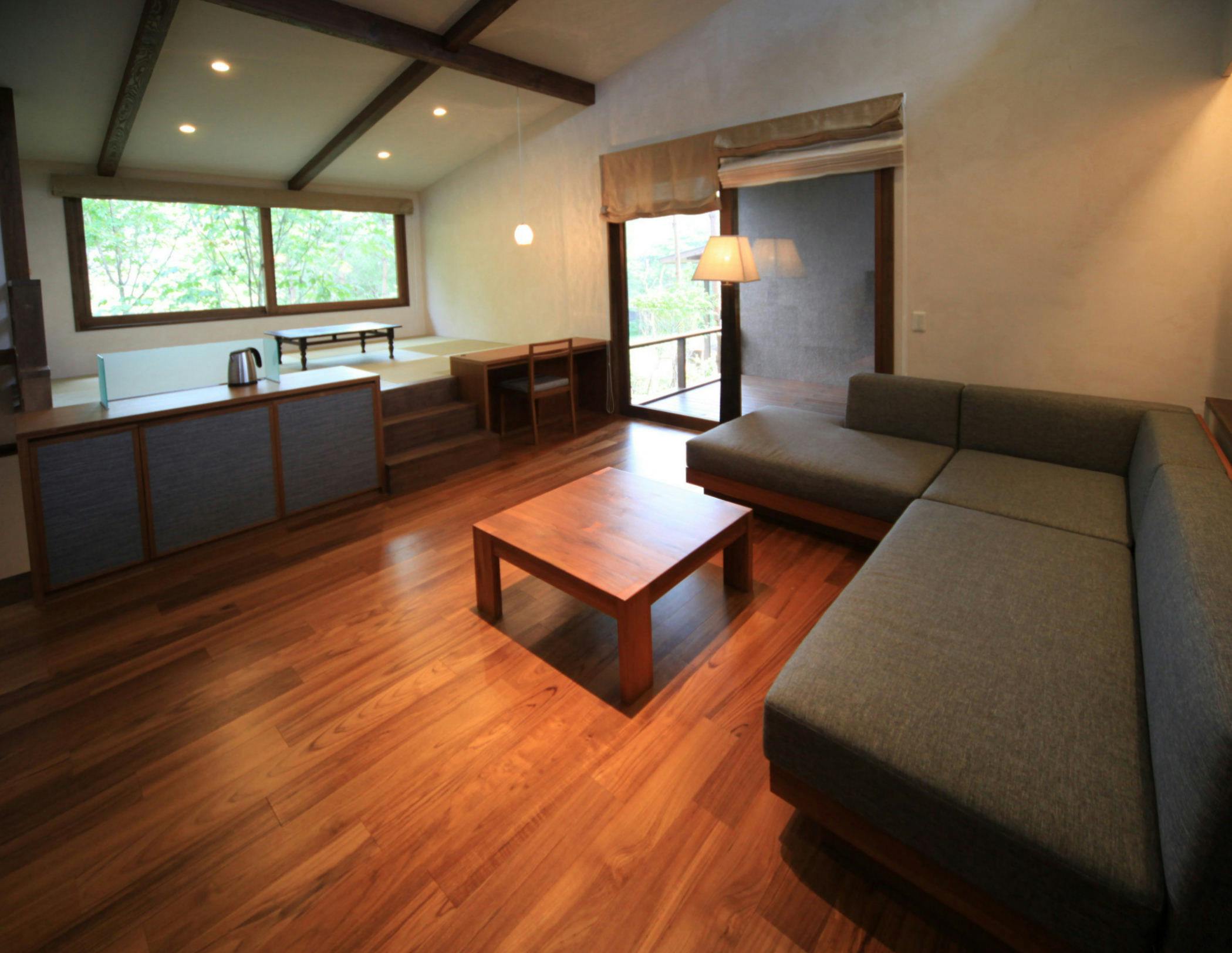 山葵- wasabi -三俣山を正面に仰ぐ家族向けの客室。空に近い一枚の大きなガラス窓からは、木、雲、月、星が絵画の様に見える。自分だけのミュージアム空間で癒しのひと時を。メゾネットタイプの客室