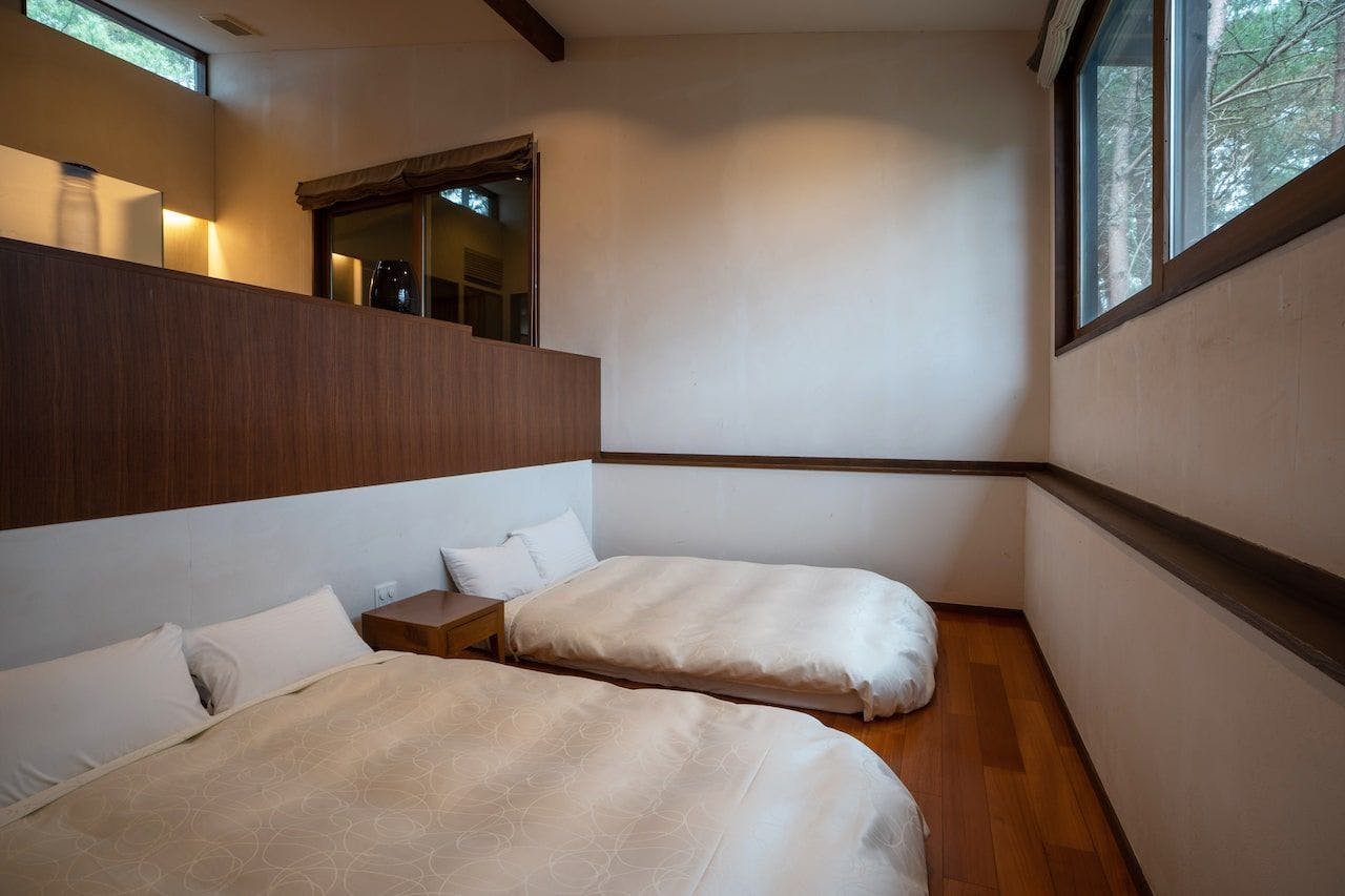 茜- akane -三俣山を正面に仰ぐ家族向けの客室。空に近い一枚の大きなガラス窓からは、木、雲、月、星が絵画の様に見える。自分だけのミュージアム空間で癒しのひと時を。メゾネットタイプの客室