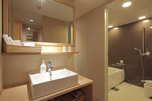 靴を脱いでゆっくりと寛いでもらう為、畳敷きフロア、サータブランドの極上ベッド、広めの洗い場つきの3点分離式バス等、オリジナル仕様でココチホテルを代表する客室を作りました。